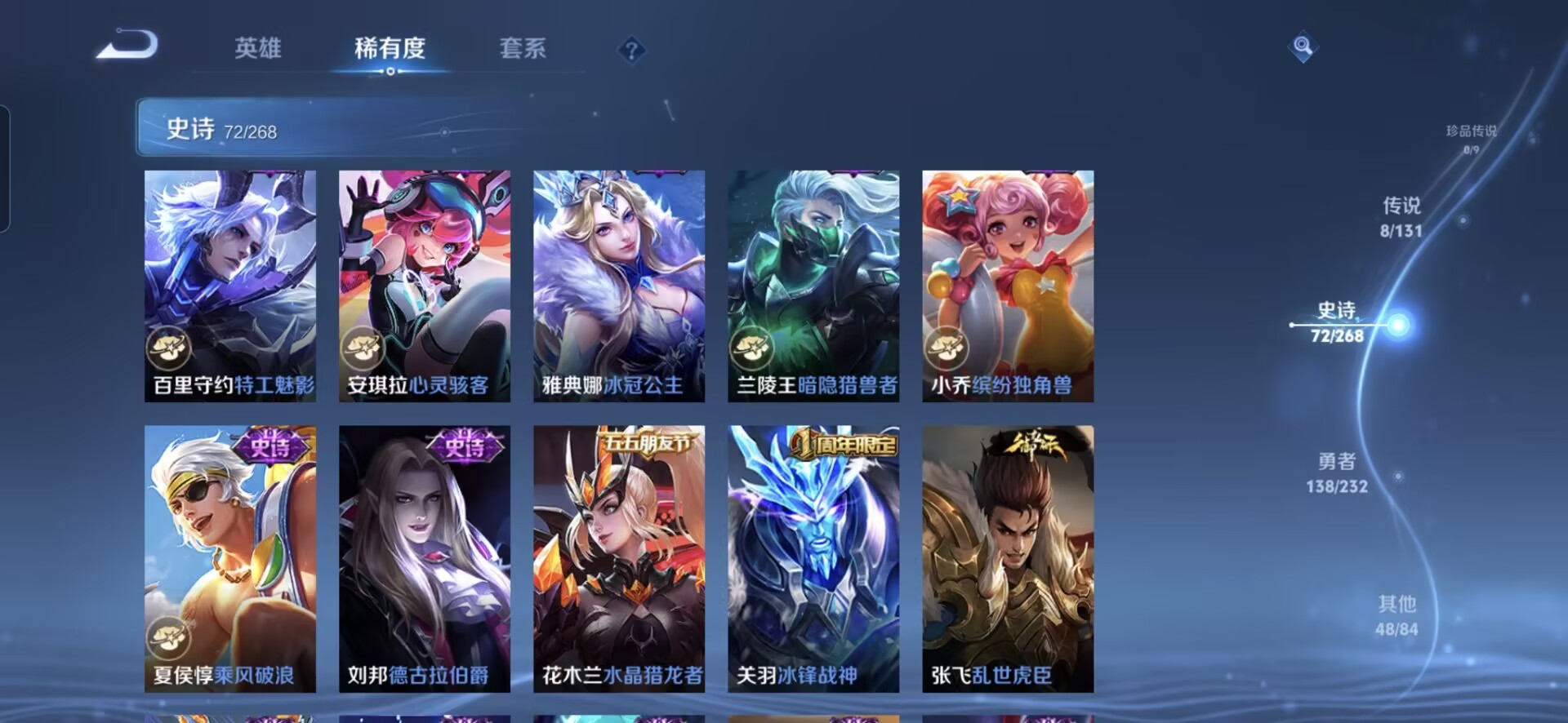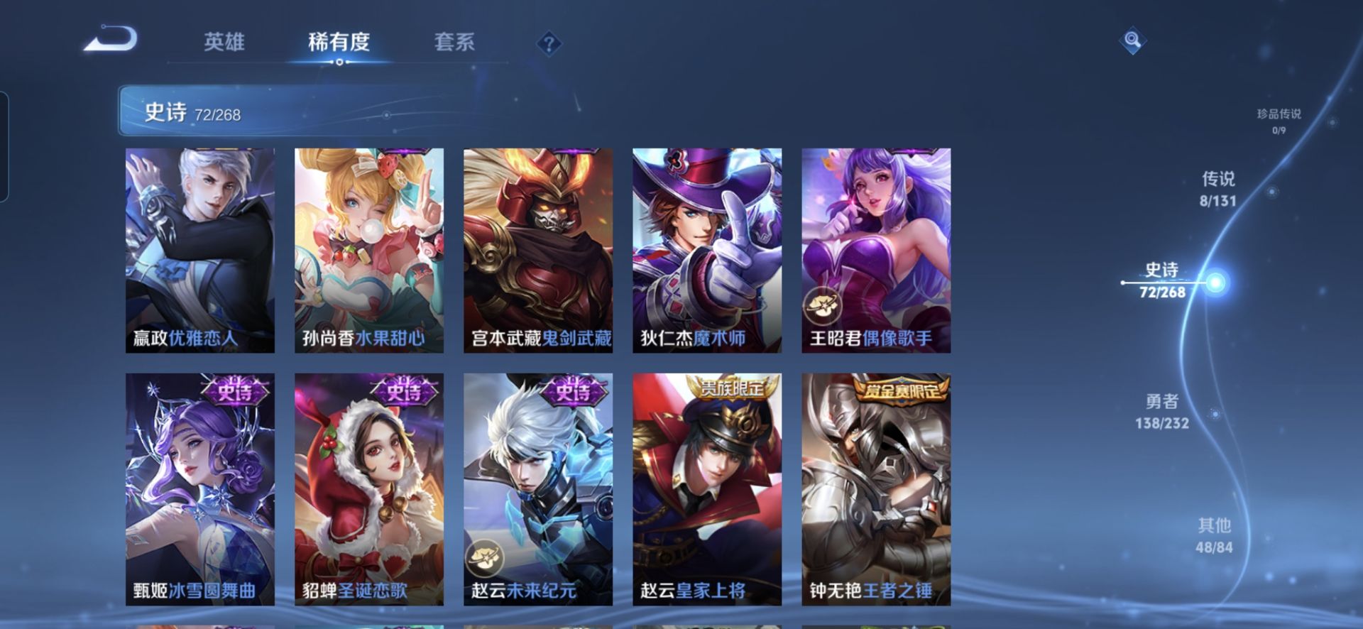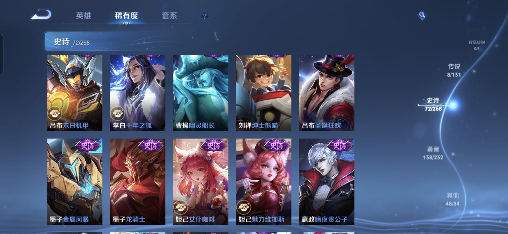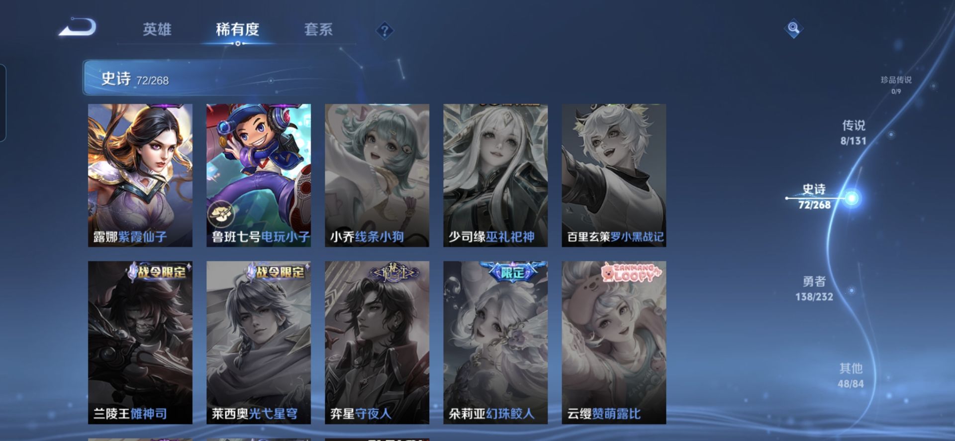 贵族等级:v7皮肤数:268传说品质8 情人节限定1 荣耀典藏1 生肖限定2 英雄数:127