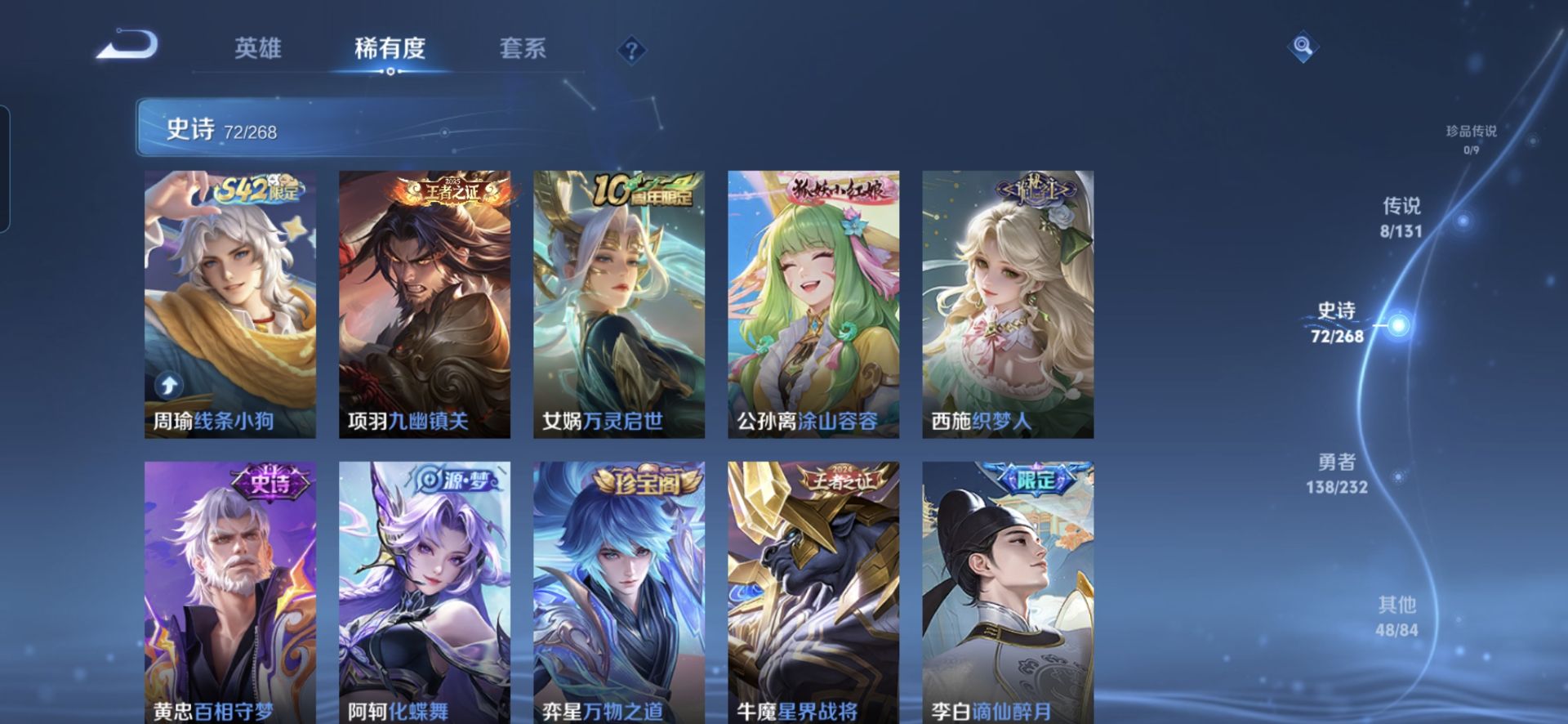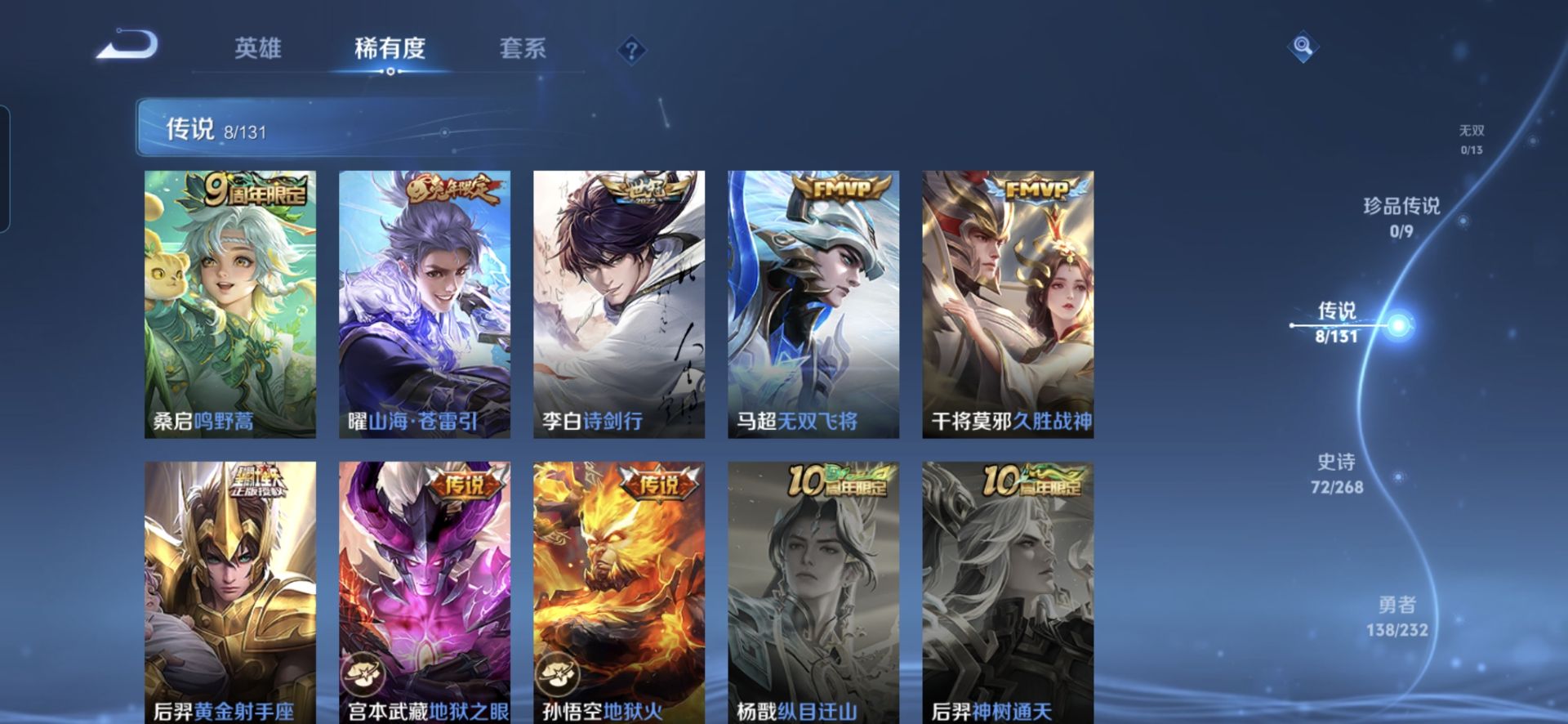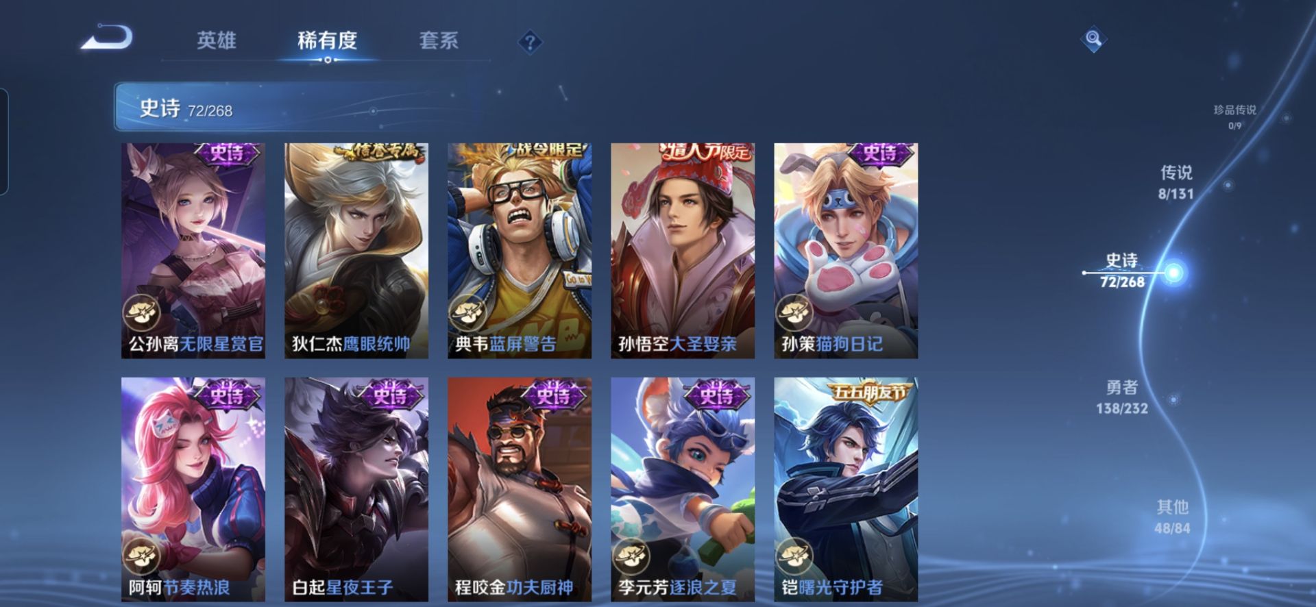 贵族等级:v7皮肤数:268传说品质8 情人节限定1 荣耀典藏1 生肖限定2 英雄数:127