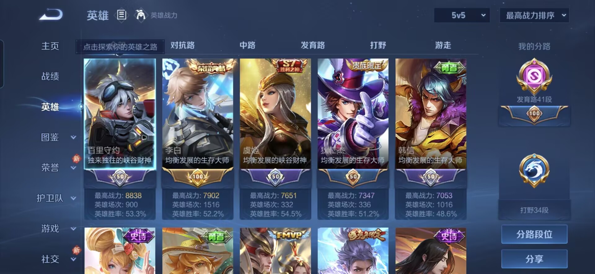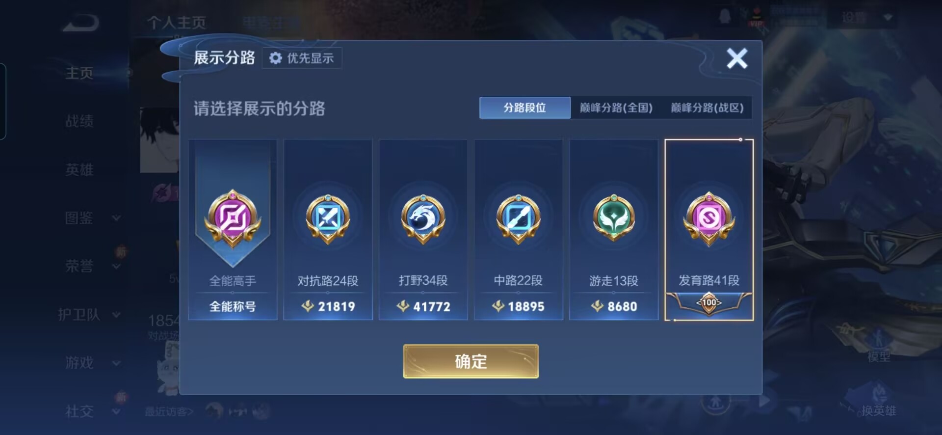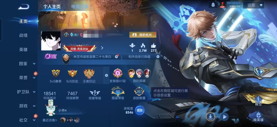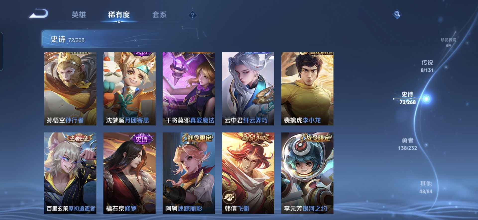 贵族等级:v7皮肤数:268传说品质8 情人节限定1 荣耀典藏1 生肖限定2 英雄数:127