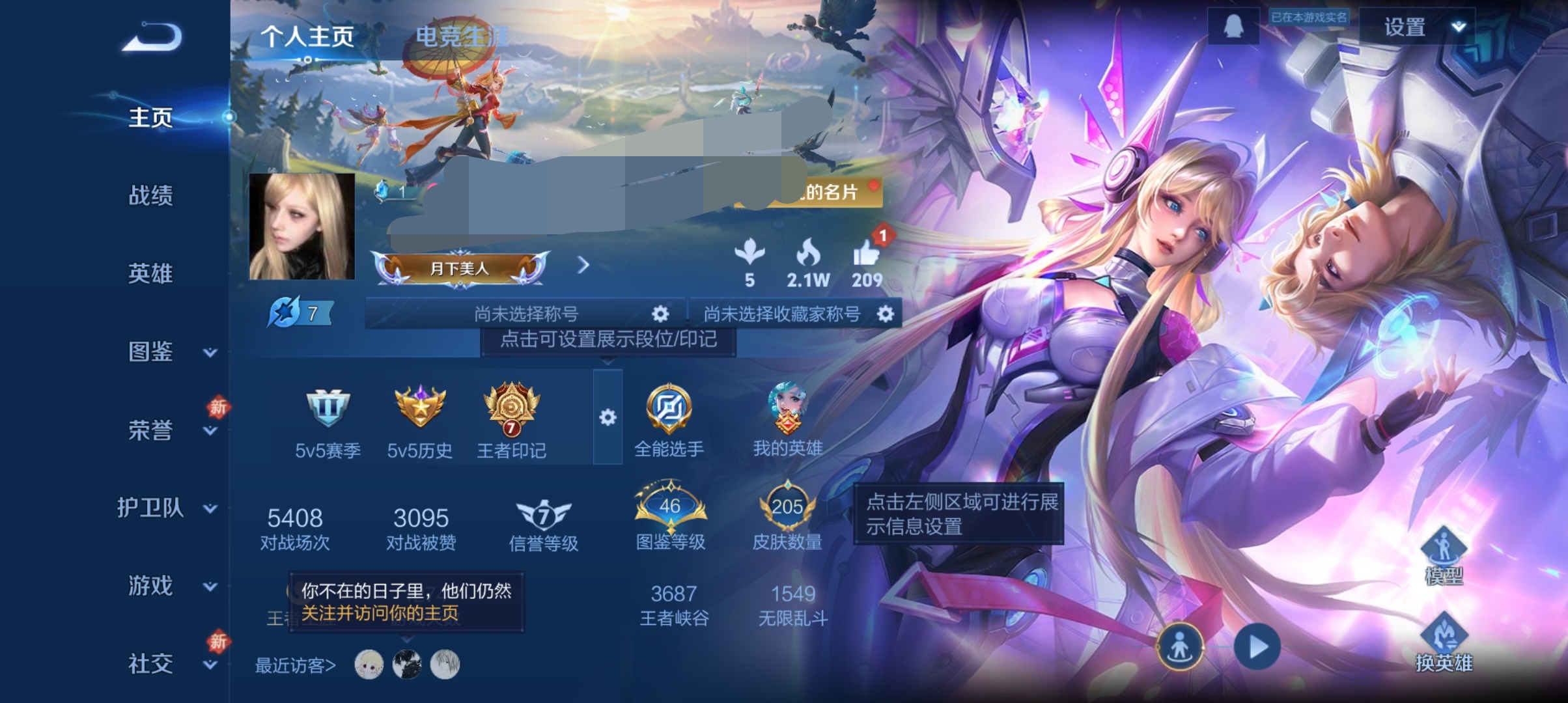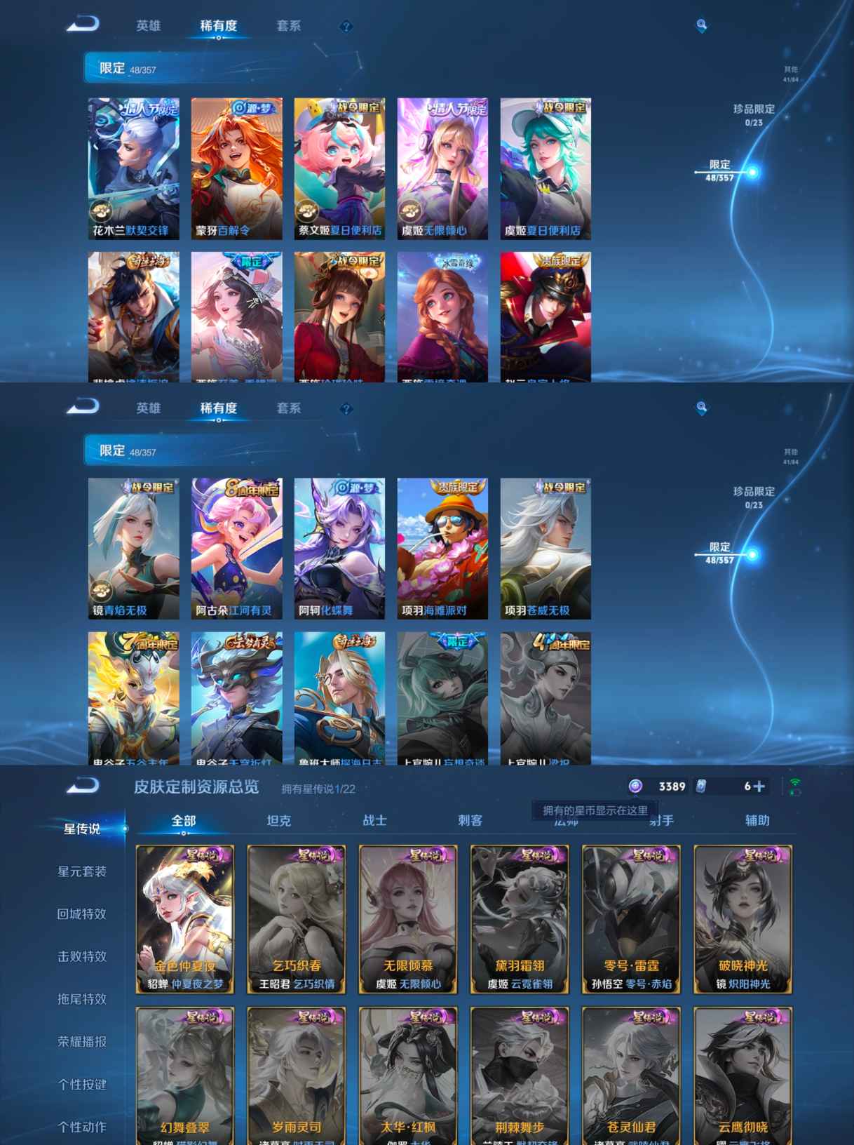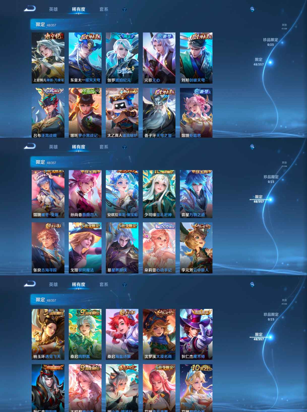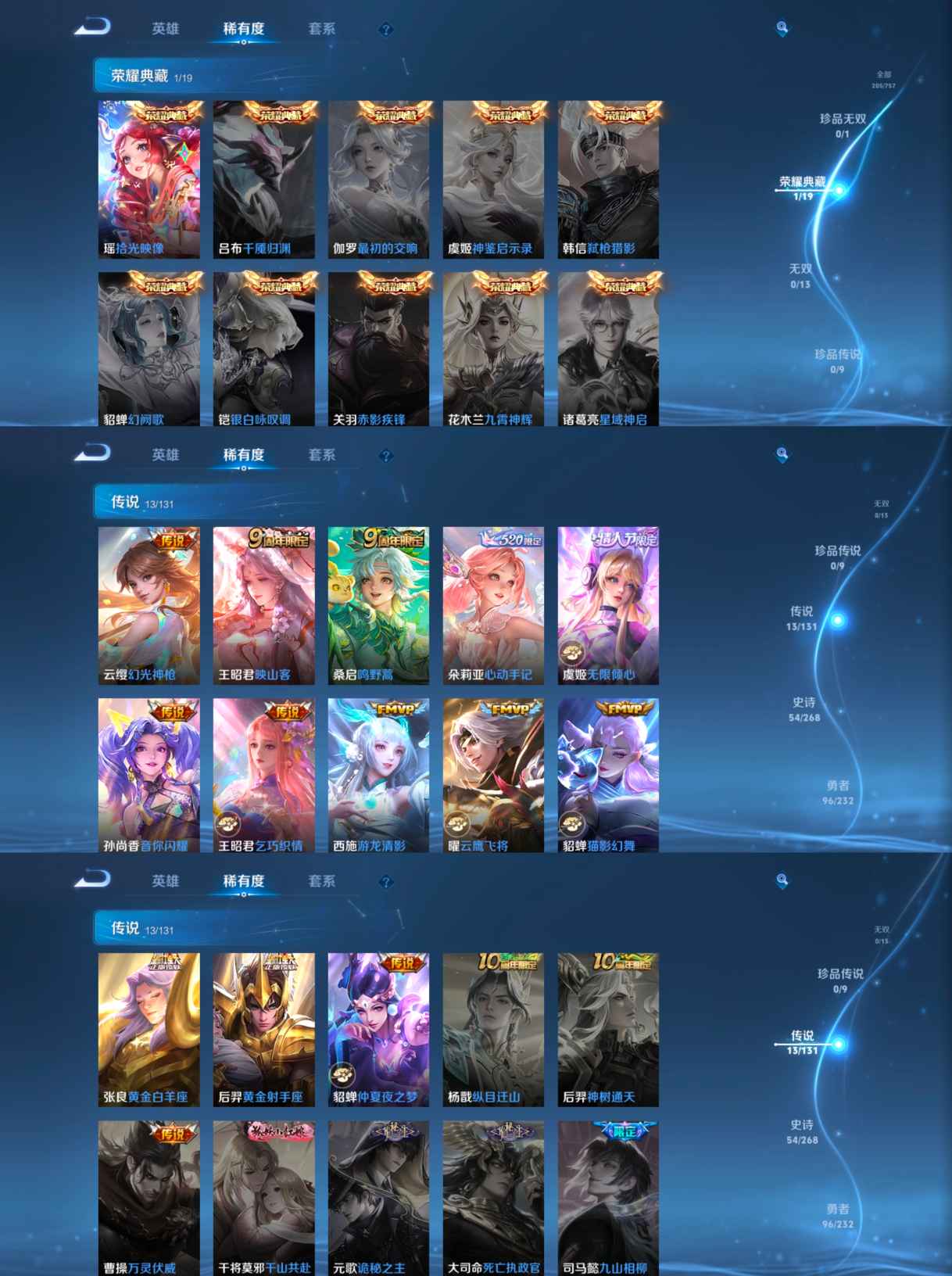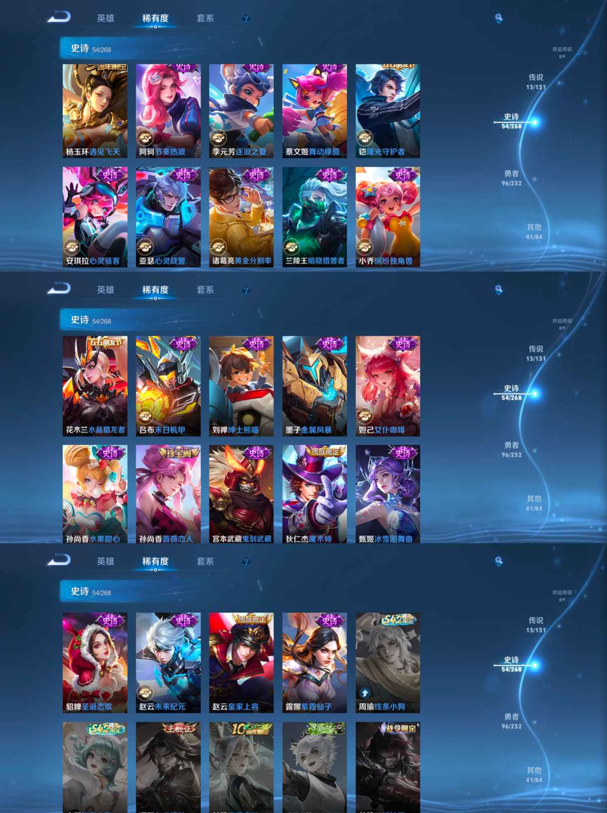 贵族等级:v7皮肤数:206传说品质13 情人节限定2 生肖限定2 荣耀典藏1 英雄数:125