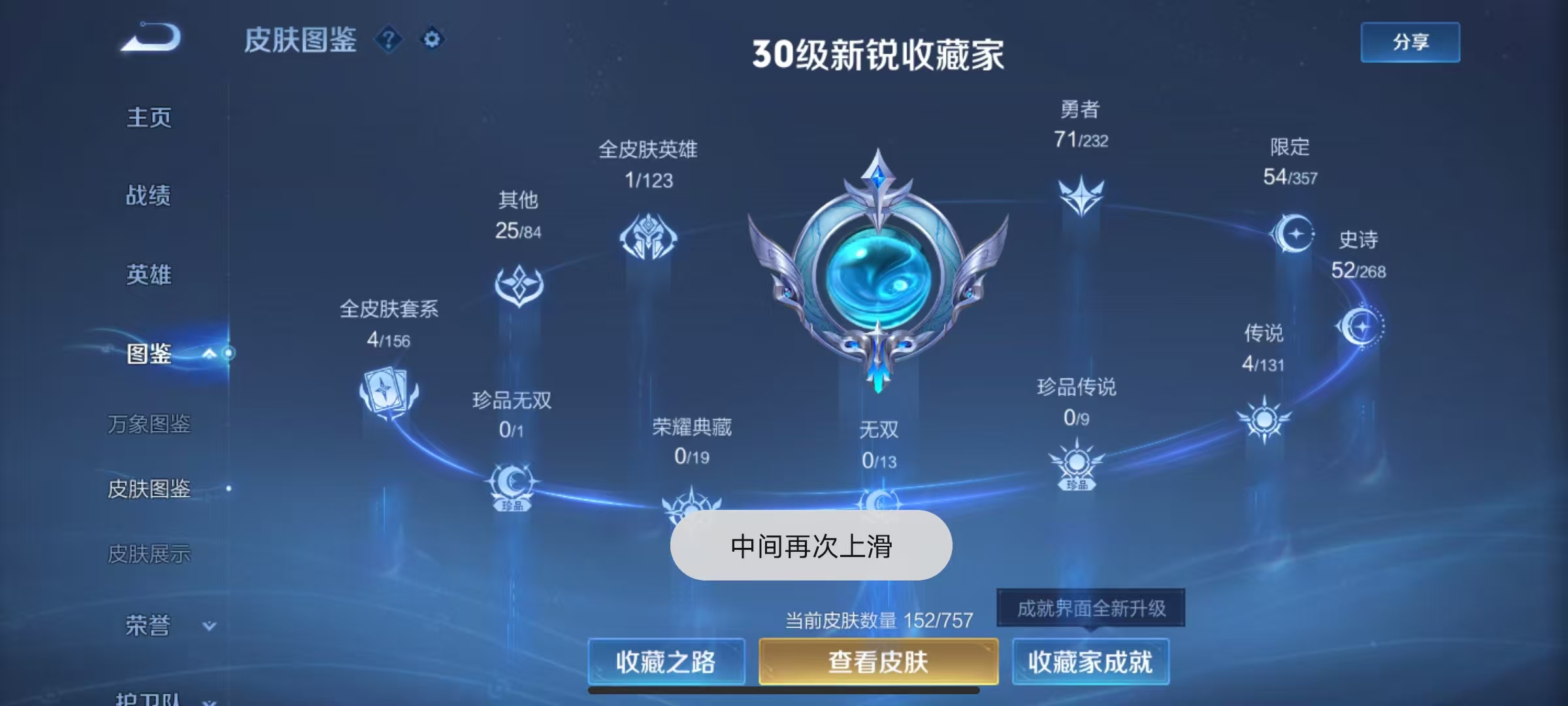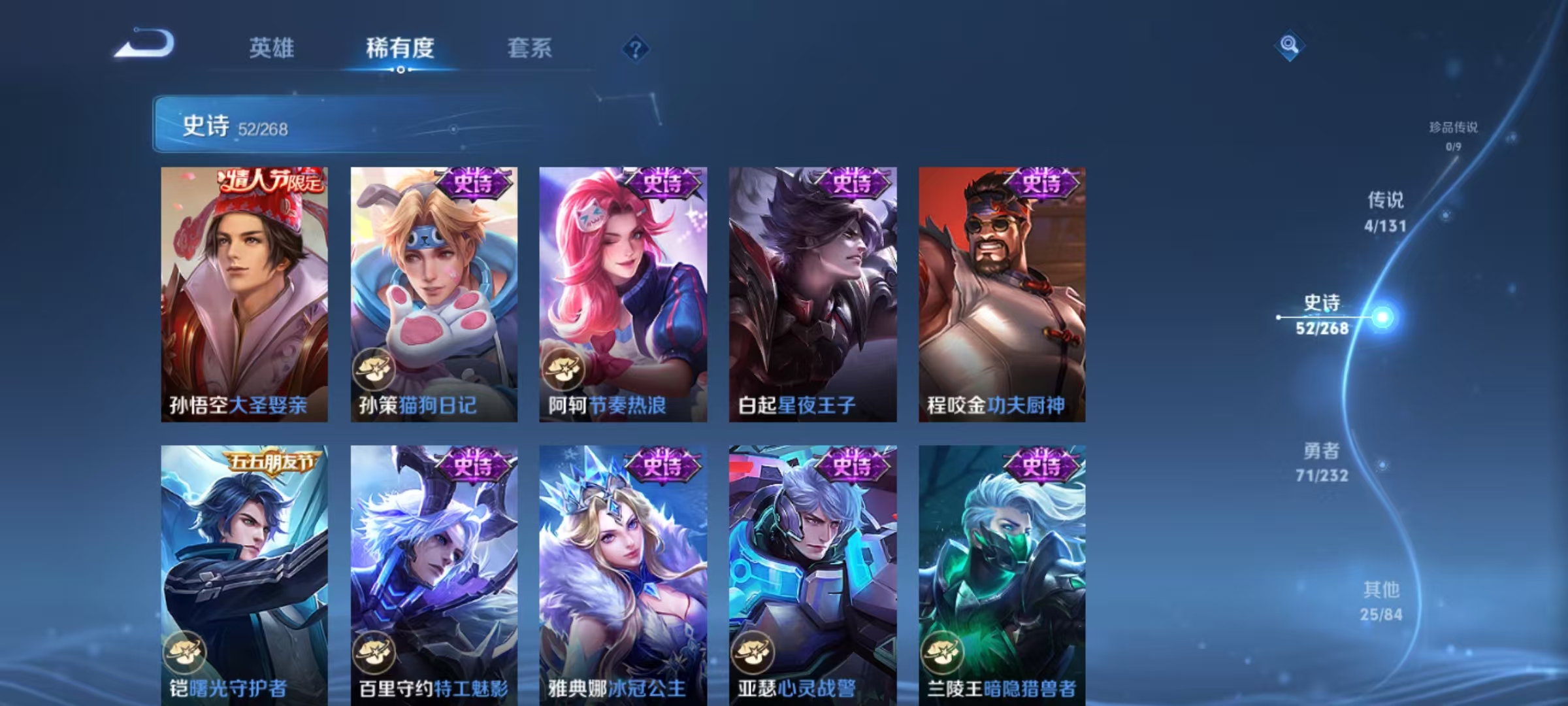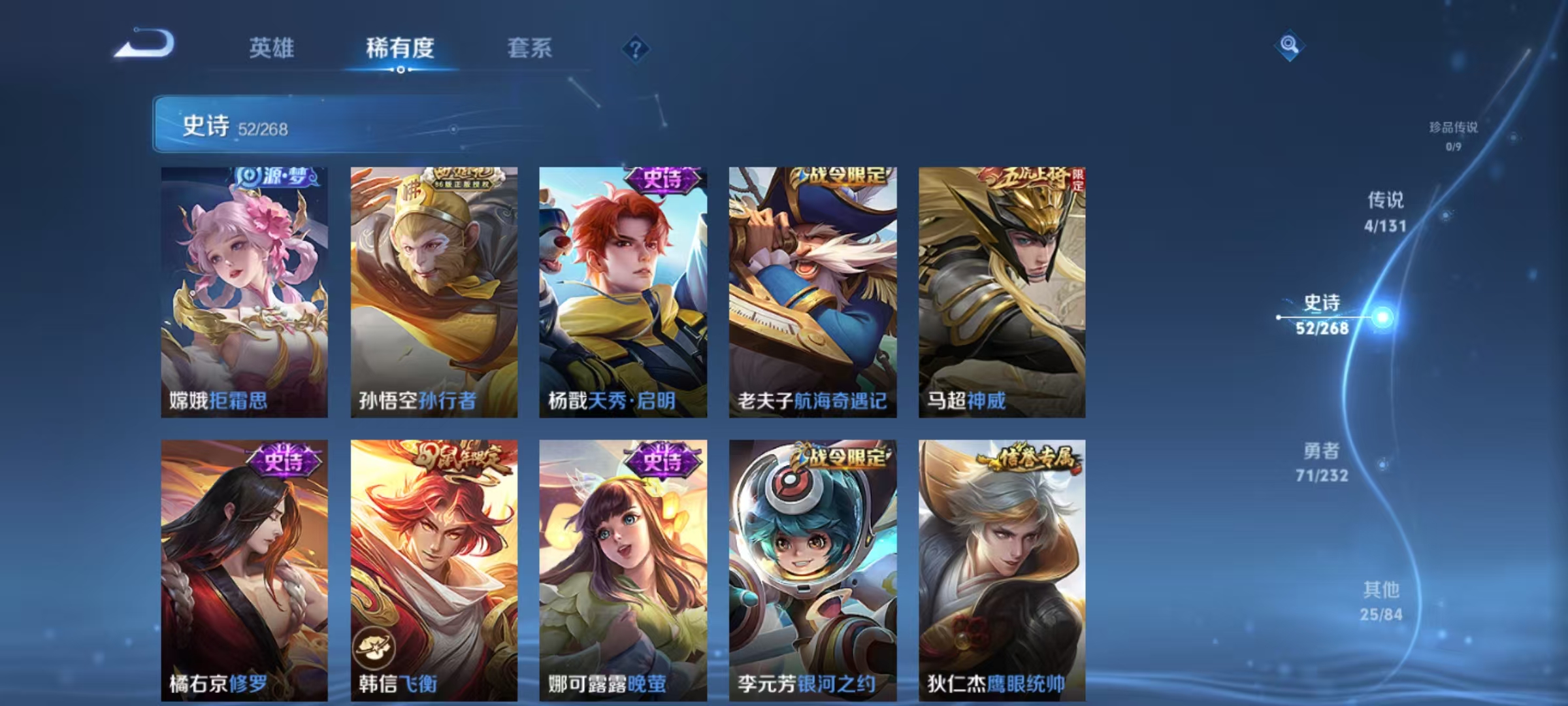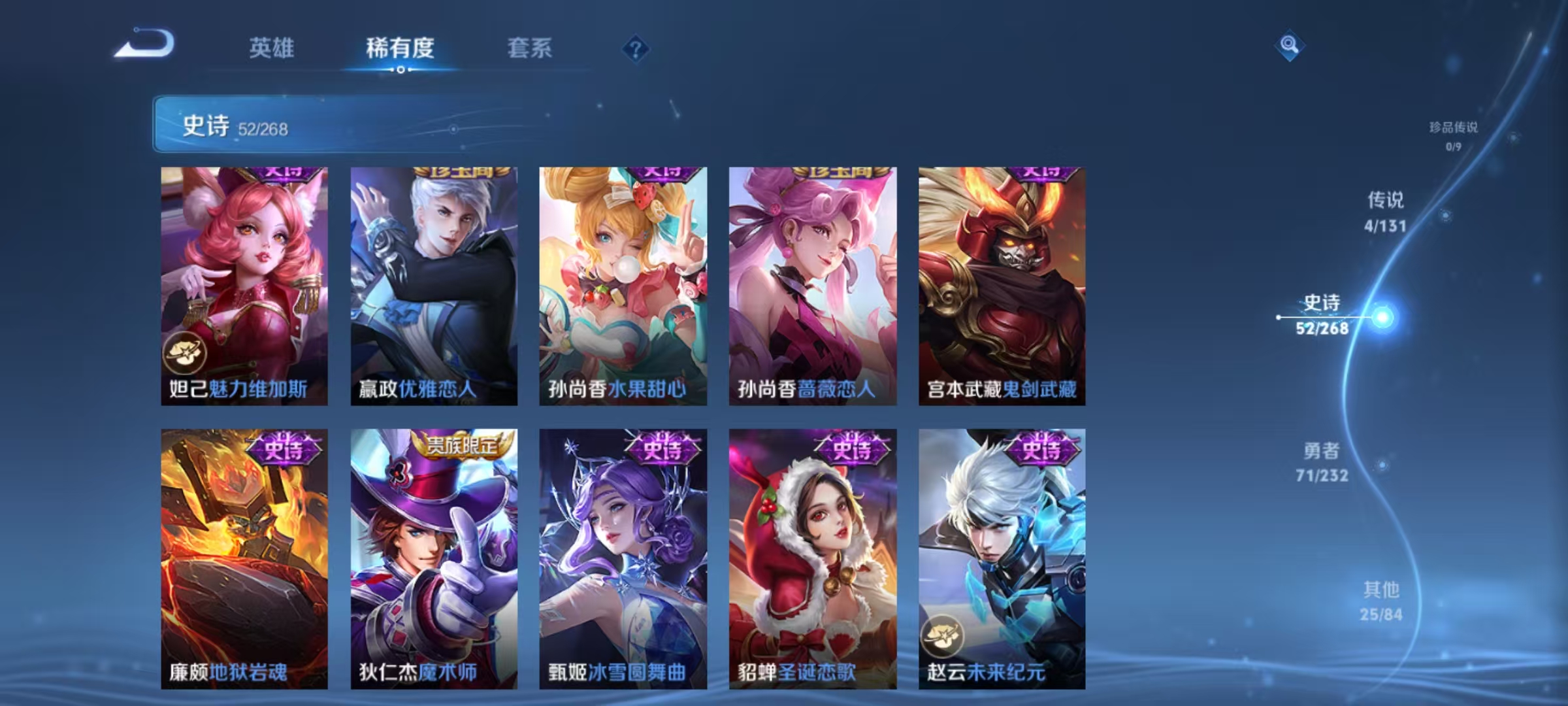 贵族等级:v6皮肤数:152情人节限定1 传说品质4 生肖限定1 英雄数:125
