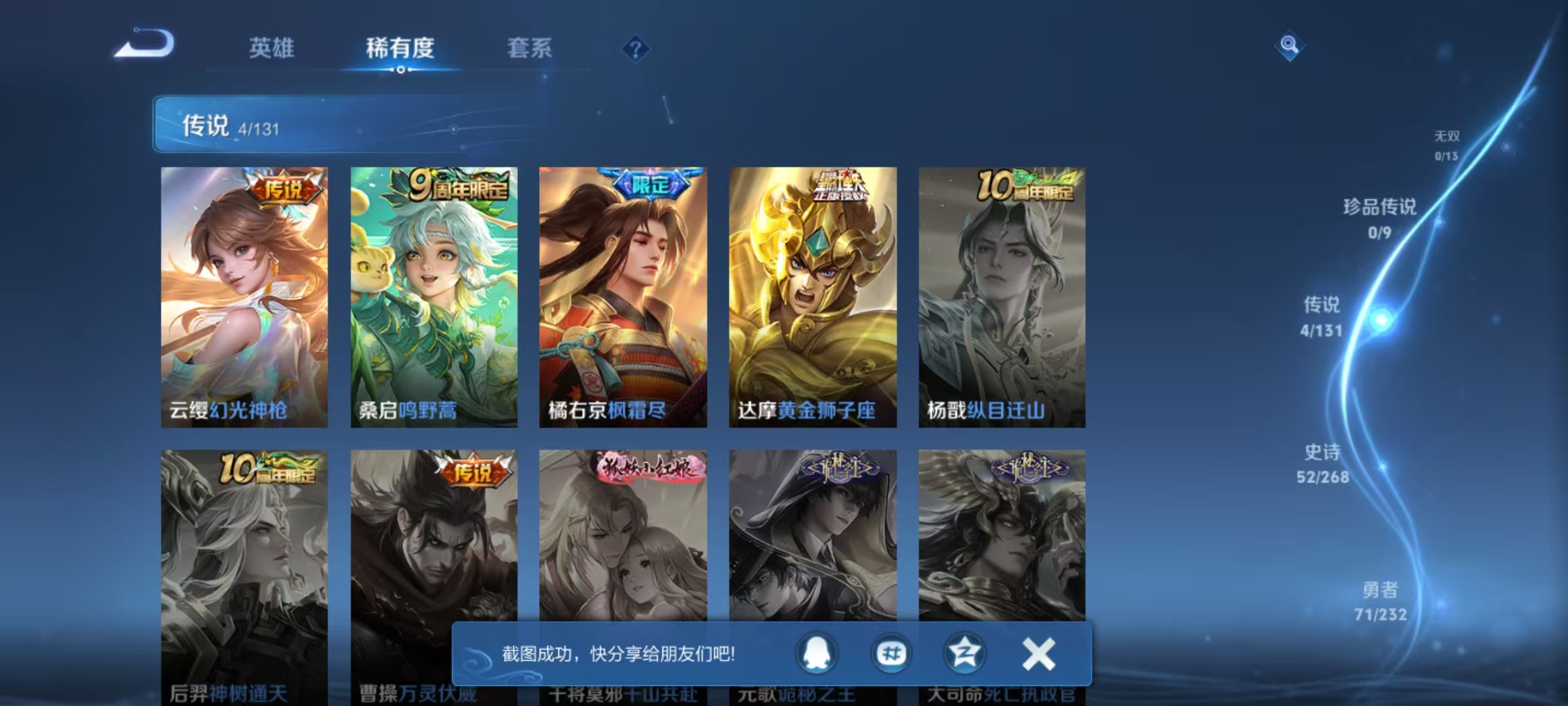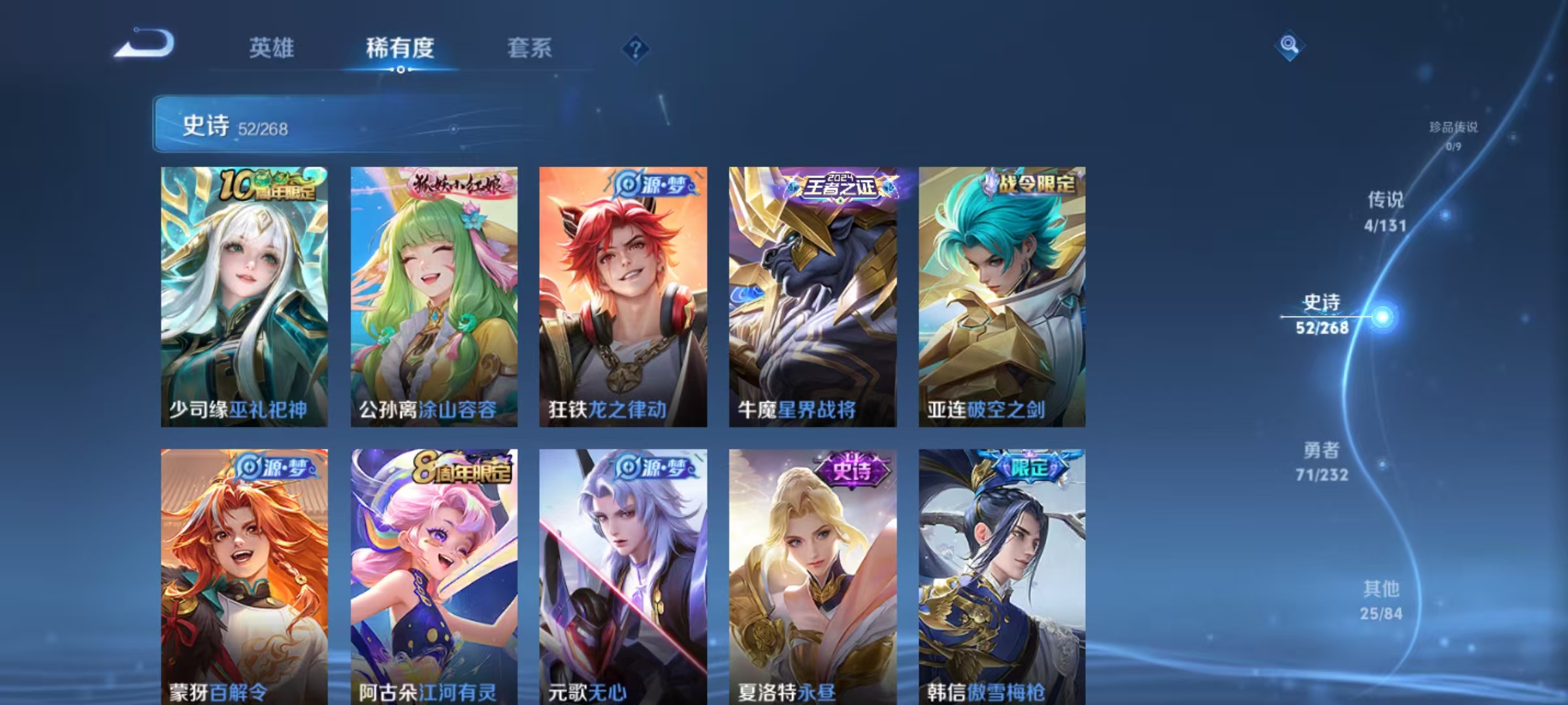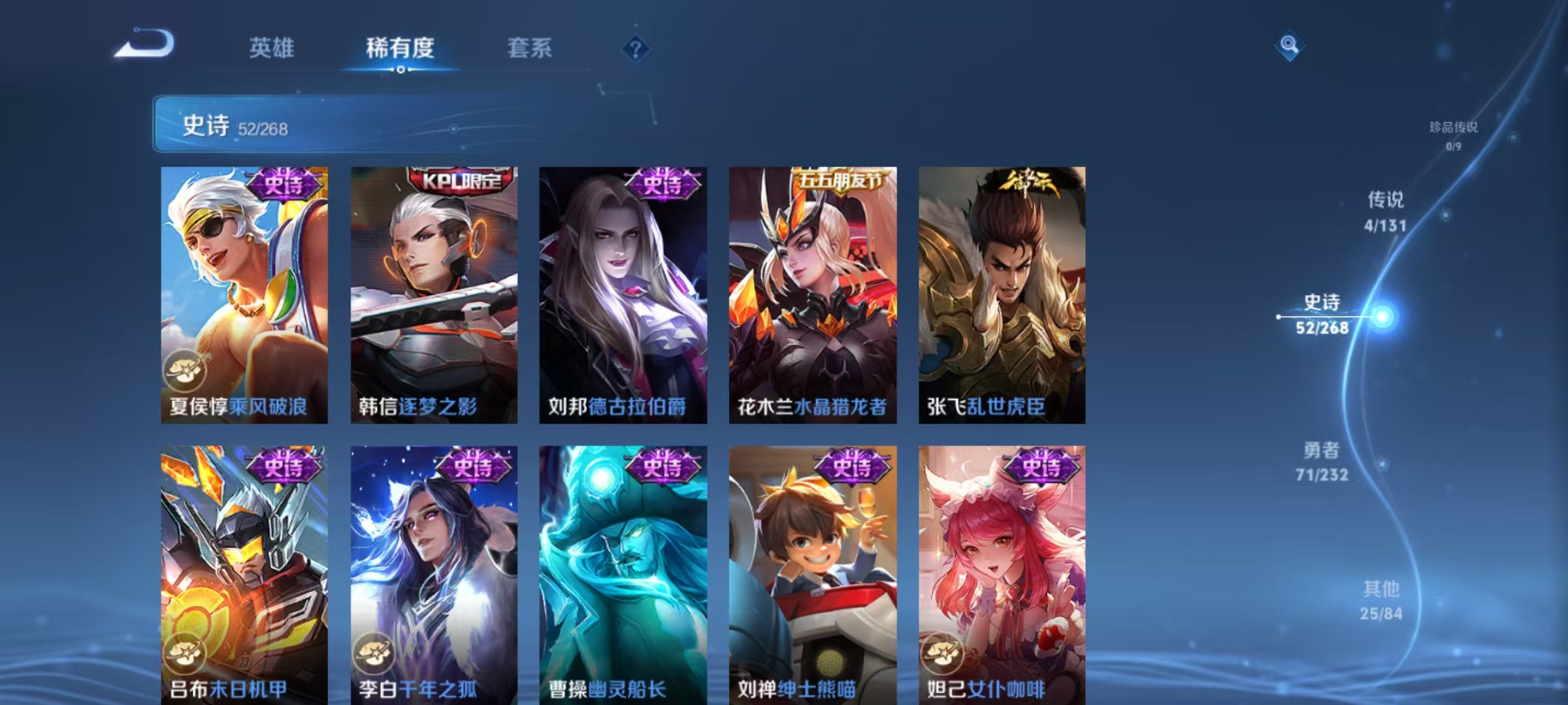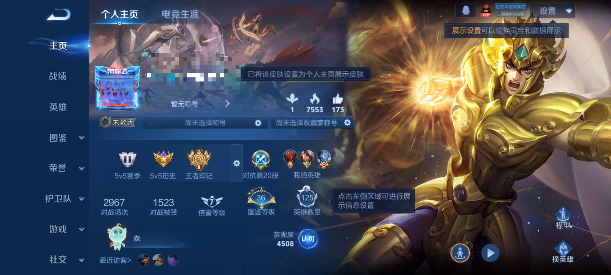 贵族等级:v6皮肤数:152情人节限定1 传说品质4 生肖限定1 英雄数:125