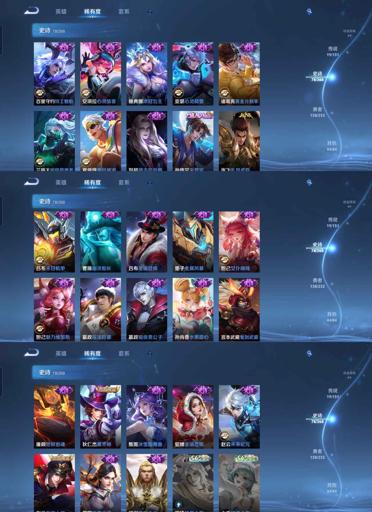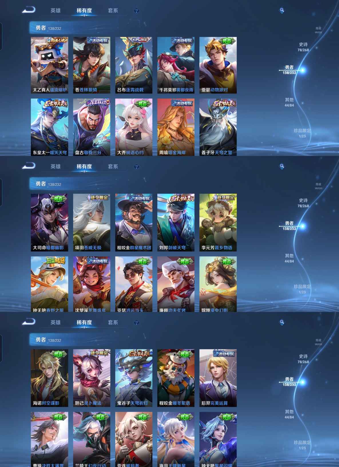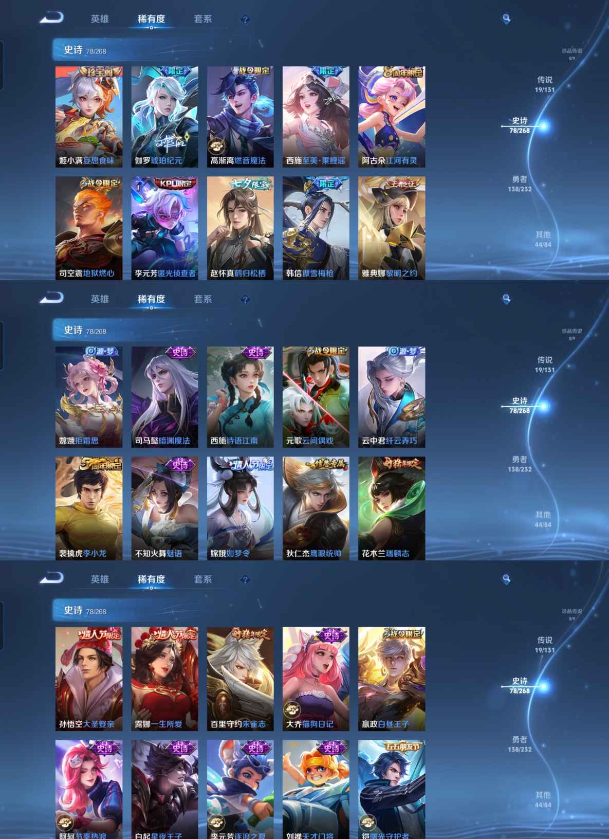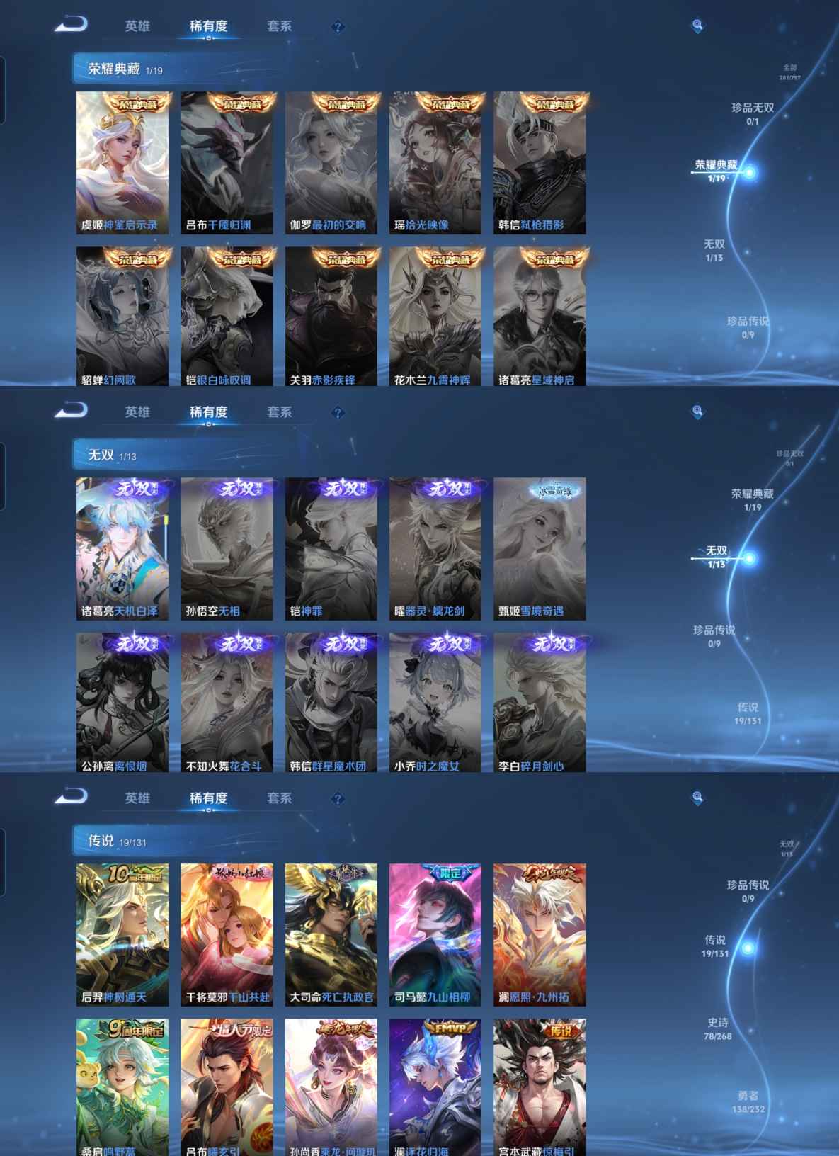 贵族等级:v8皮肤数:281传说品质19 生肖限定7 无双1 情人节限定5 荣耀典藏1 英雄数:128