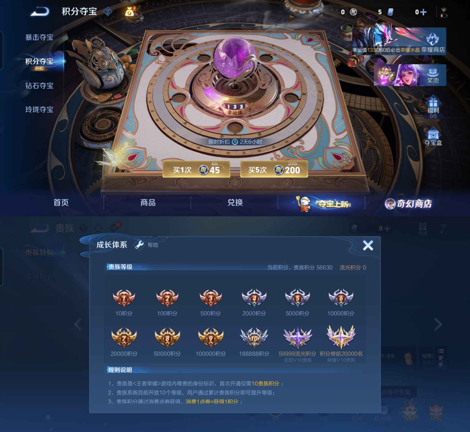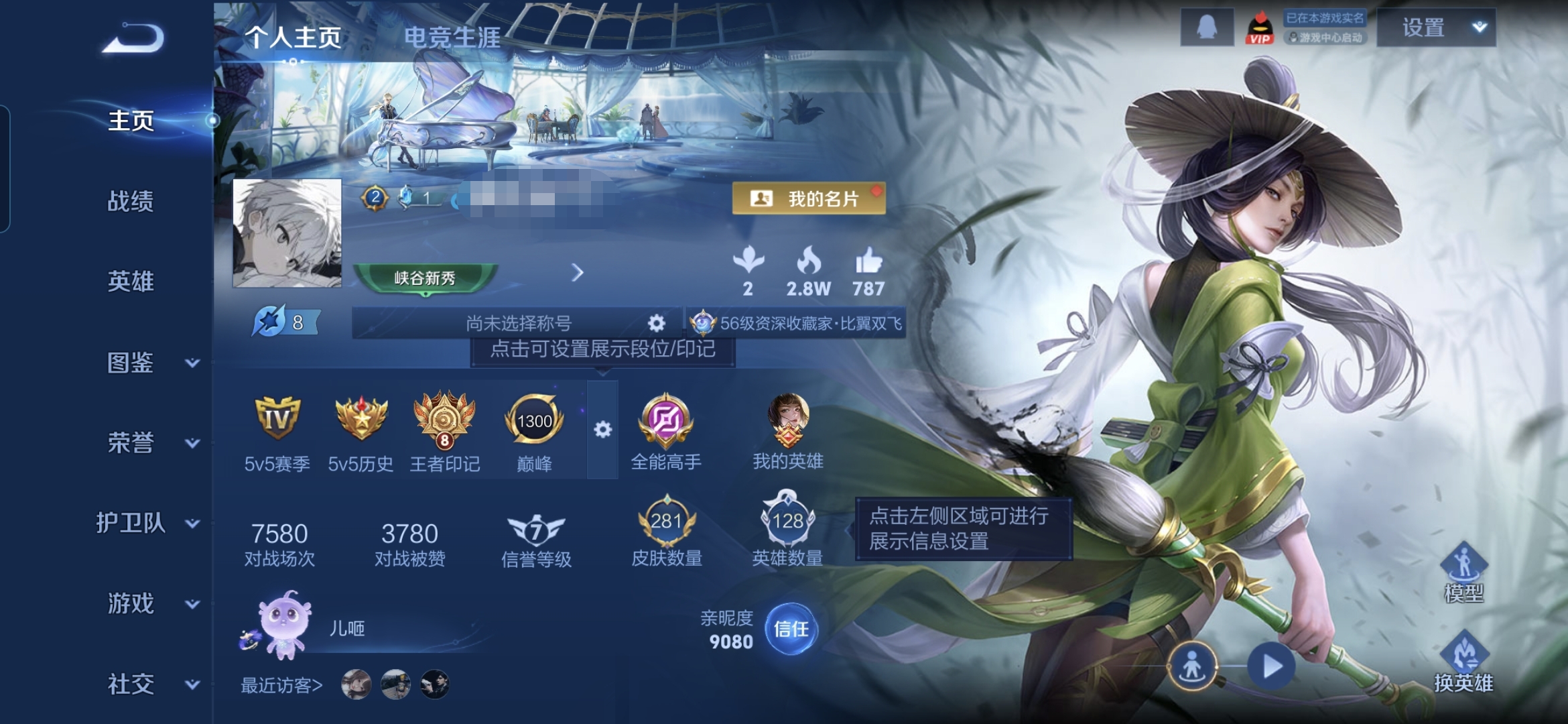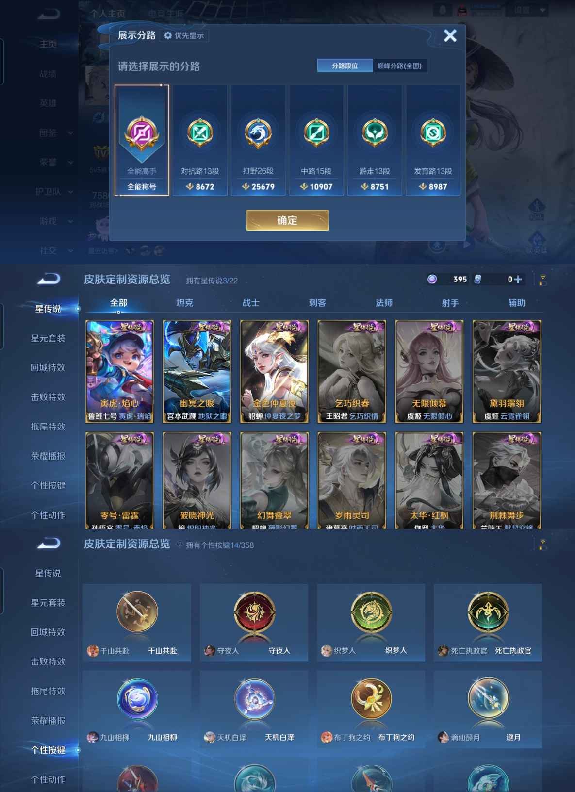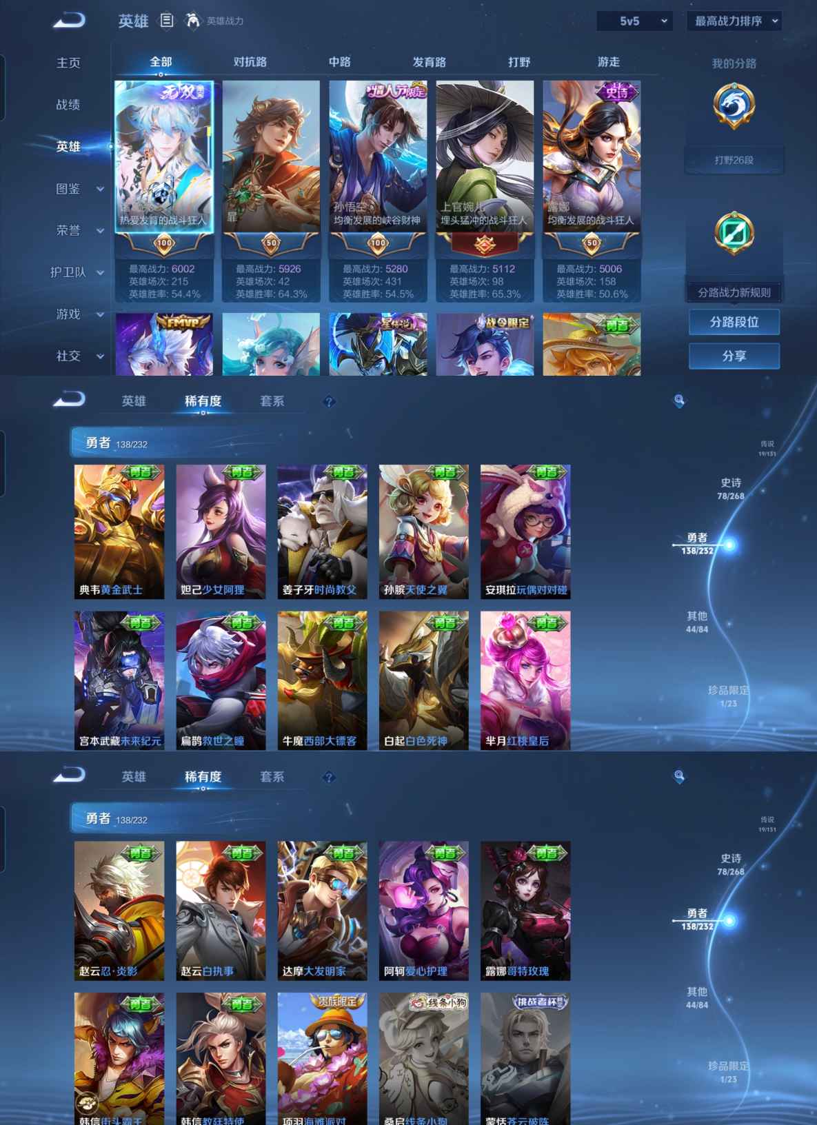 贵族等级:v8皮肤数:281传说品质19 生肖限定7 无双1 情人节限定5 荣耀典藏1 英雄数:128