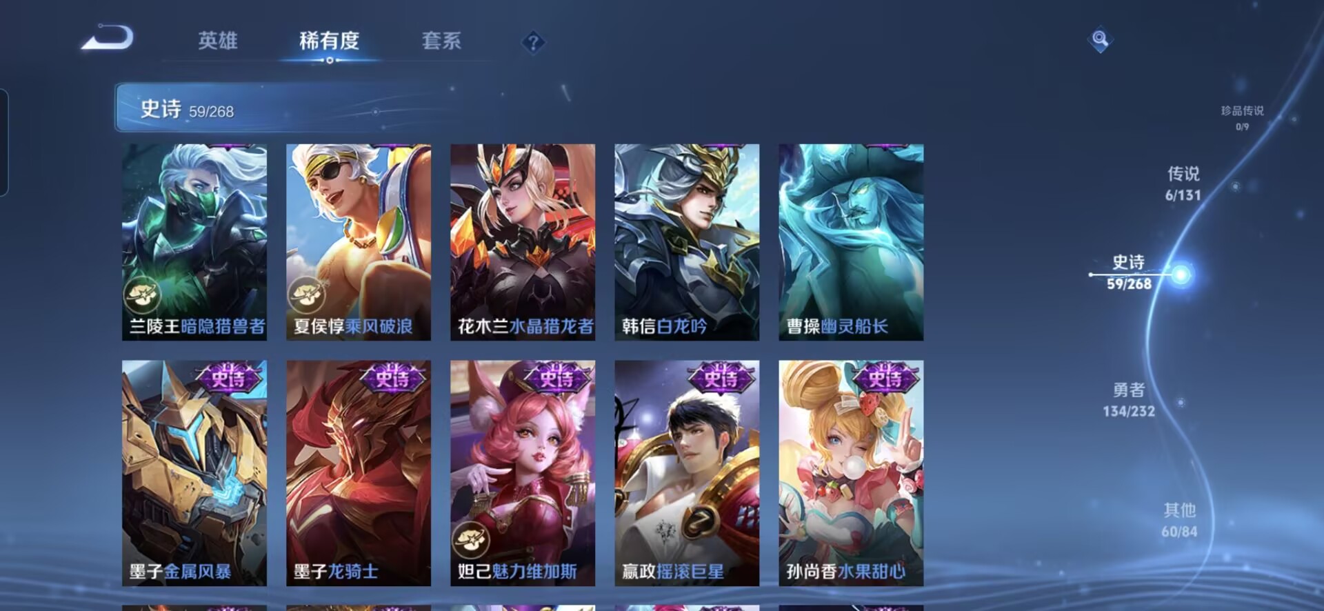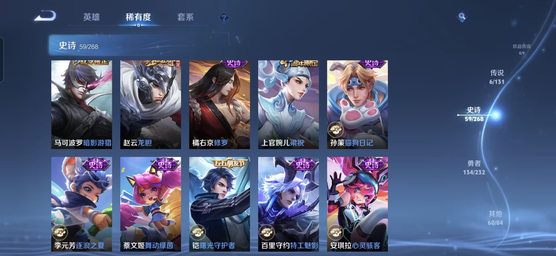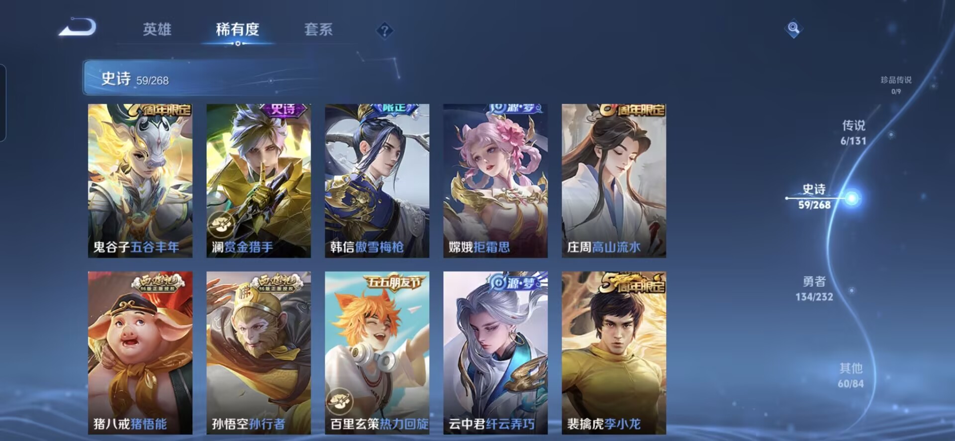 贵族等级:v7皮肤数:259传说品质6 生肖限定1 英雄数:125