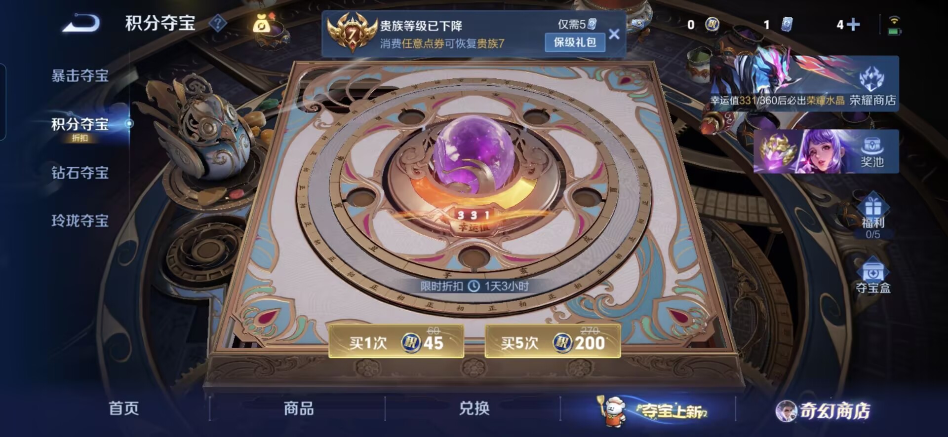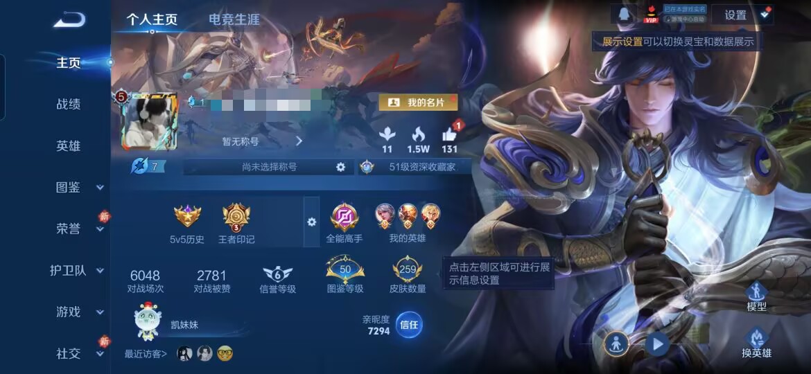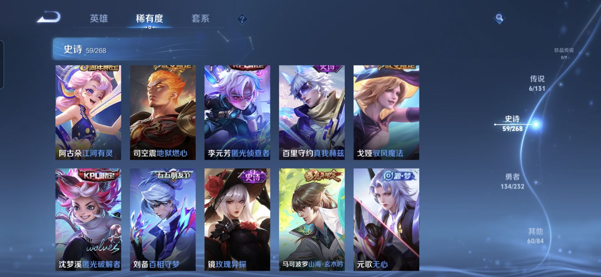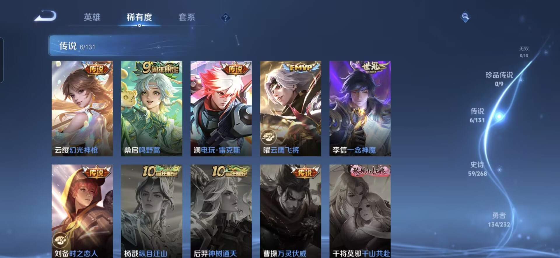 贵族等级:v7皮肤数:259传说品质6 生肖限定1 英雄数:125