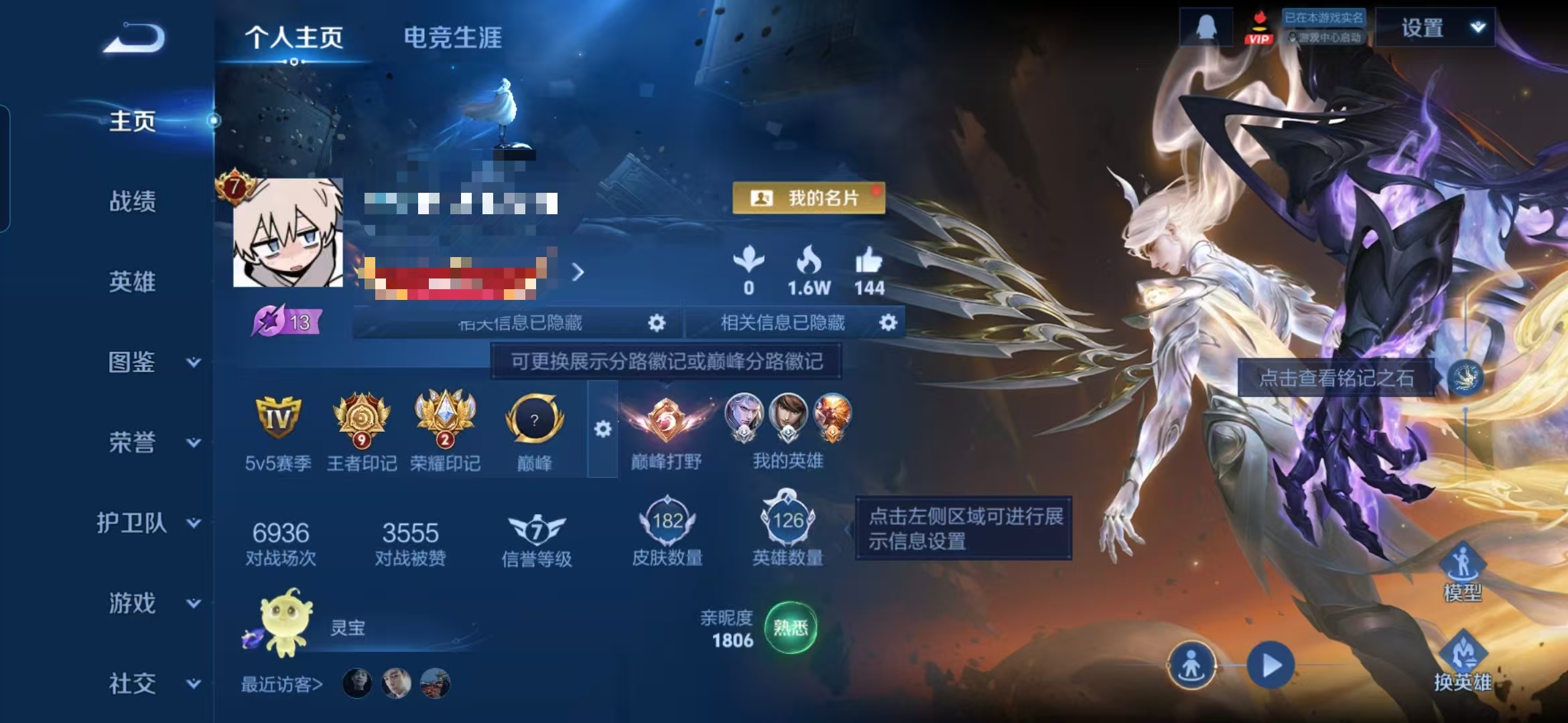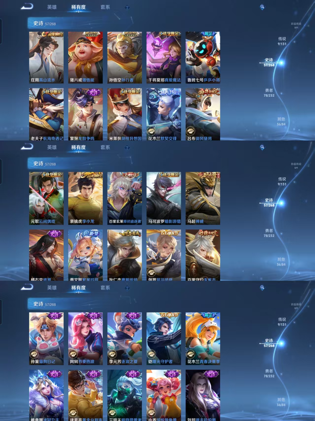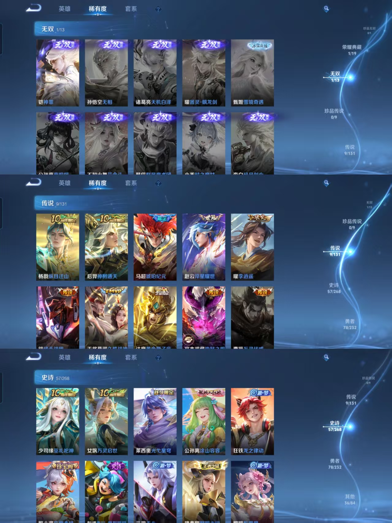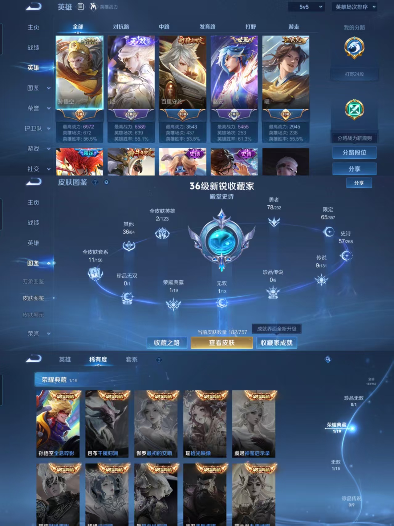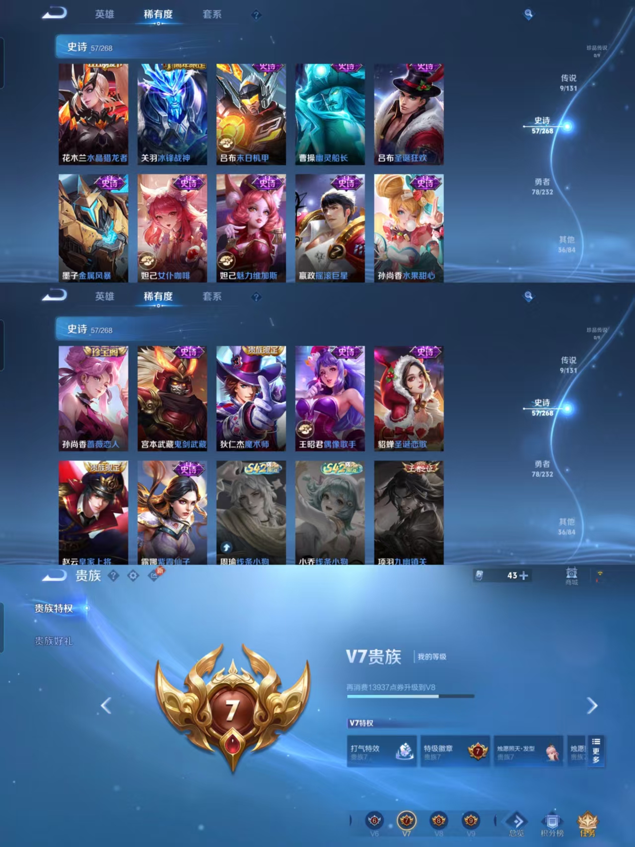 贵族等级:v7皮肤数:182传说品质9 荣耀典藏1 生肖限定2 情人节限定1 无双1 英雄数:126