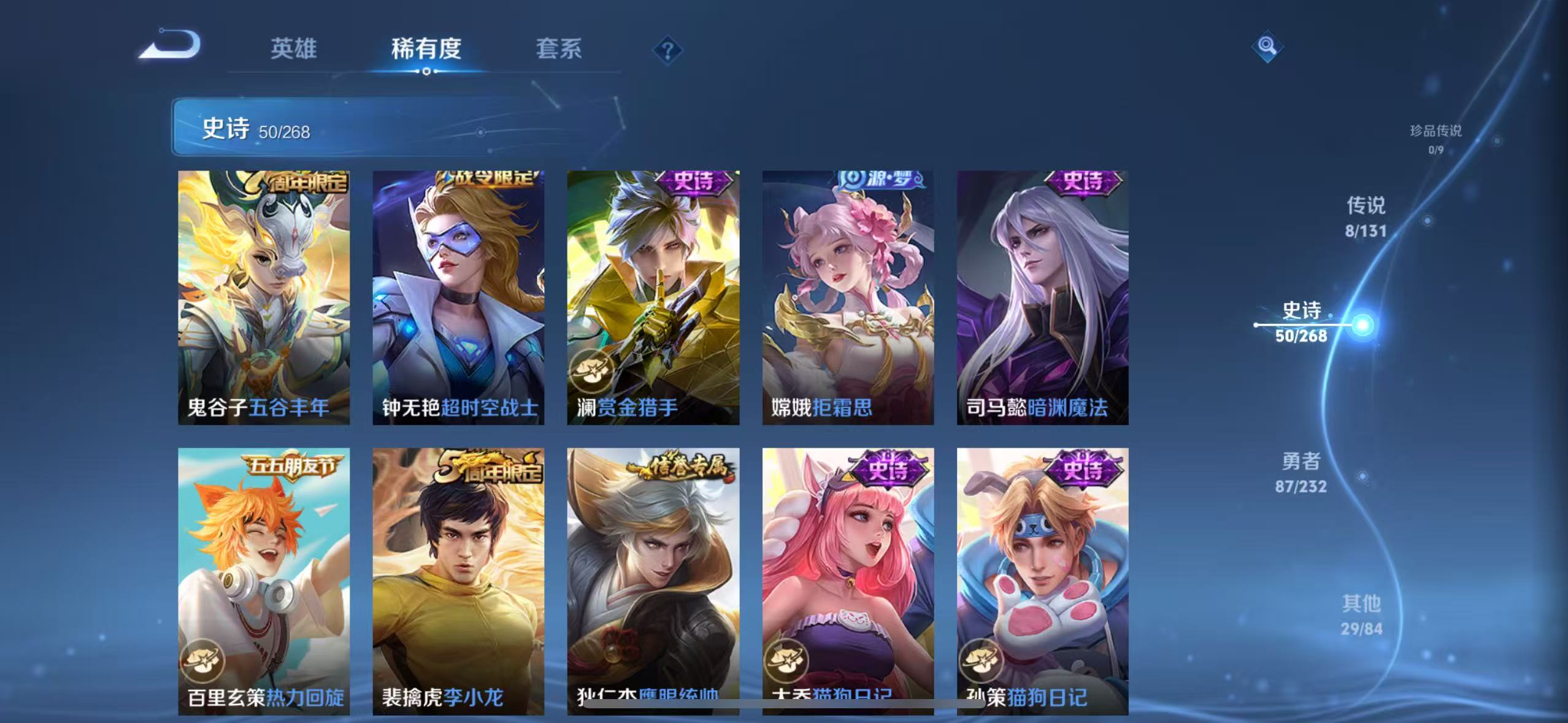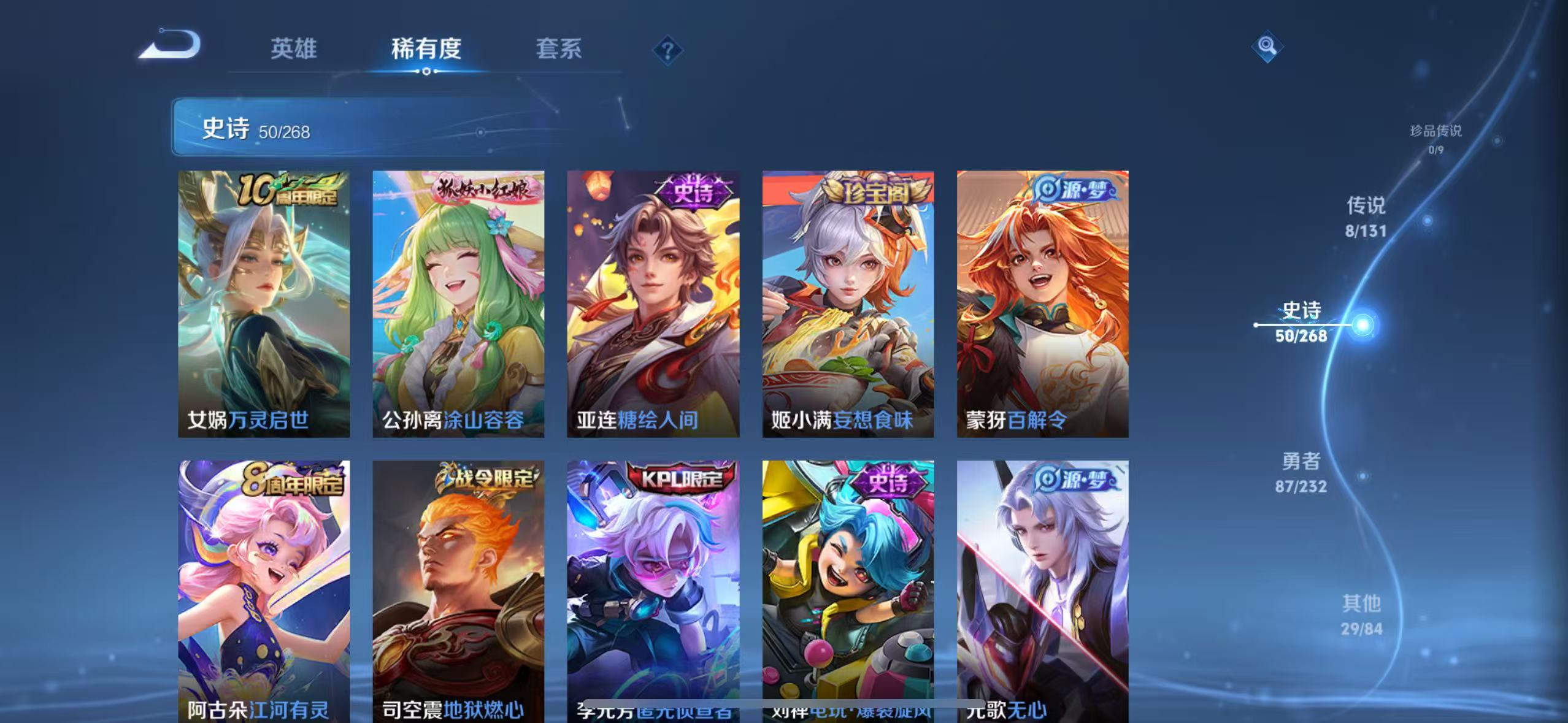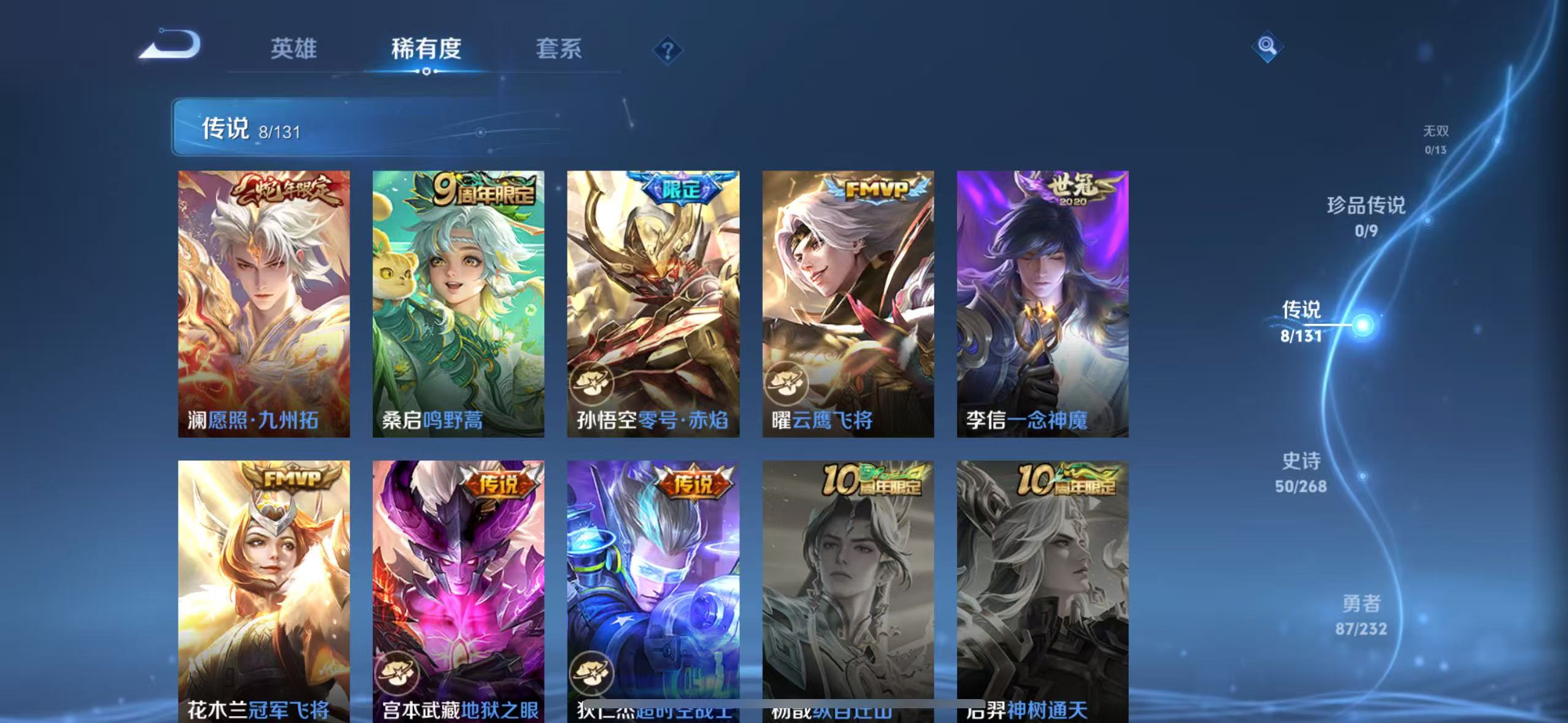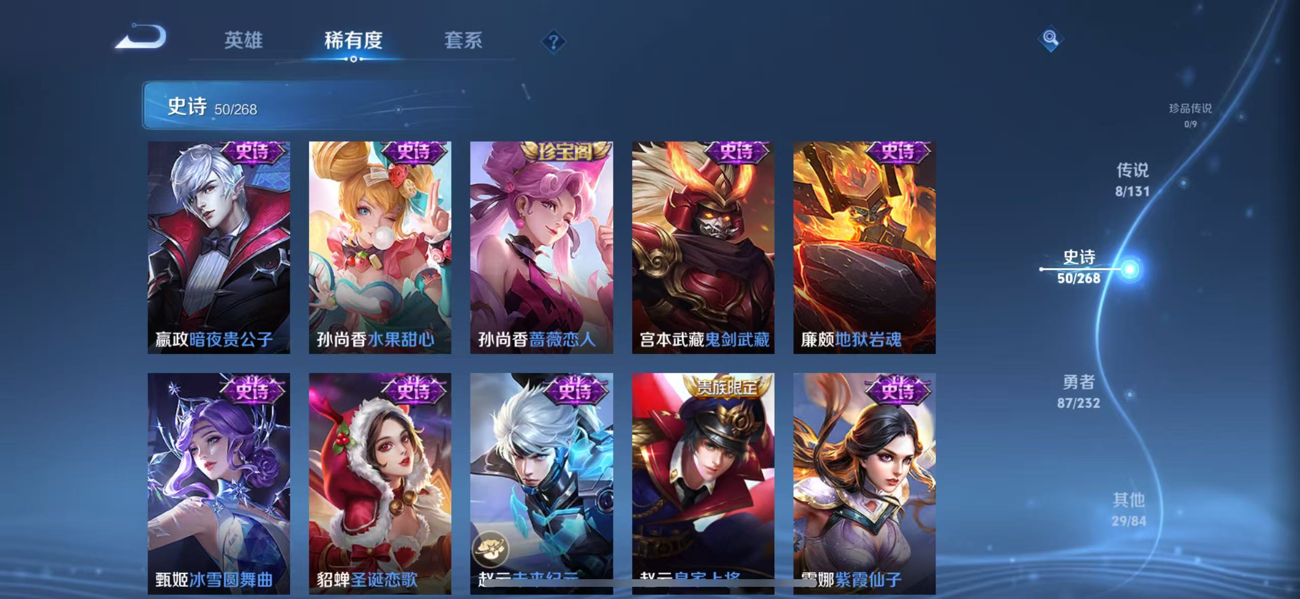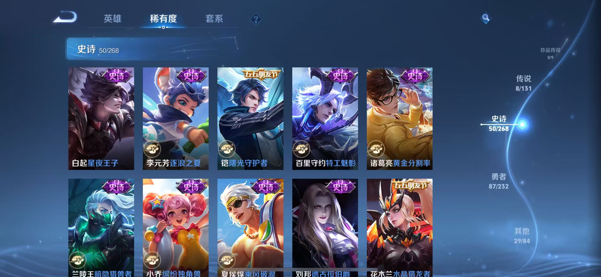 贵族等级:v5皮肤数:175传说品质8 生肖限定1 荣耀典藏1 英雄数:125