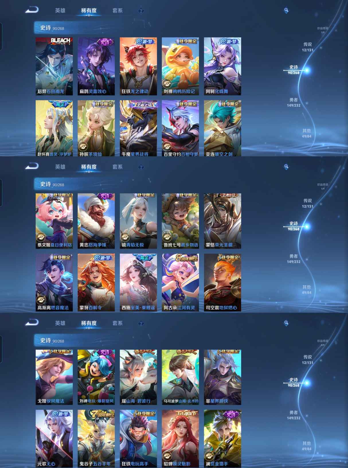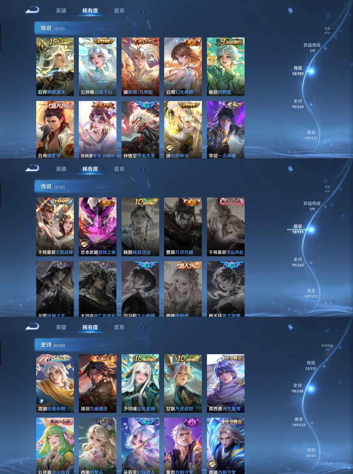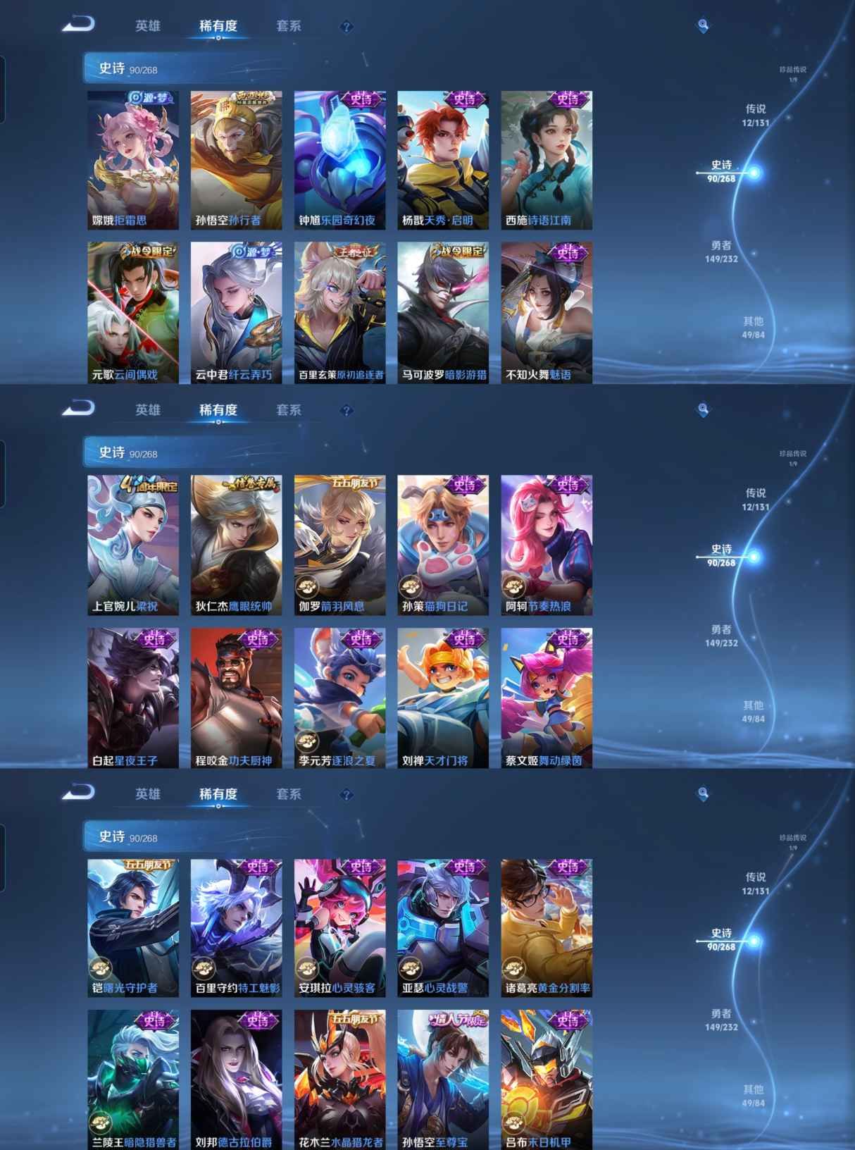 贵族等级:v7皮肤数:303传说品质12 生肖限定4 情人节限定2 珍品传说1 荣耀典藏2 英雄数:127