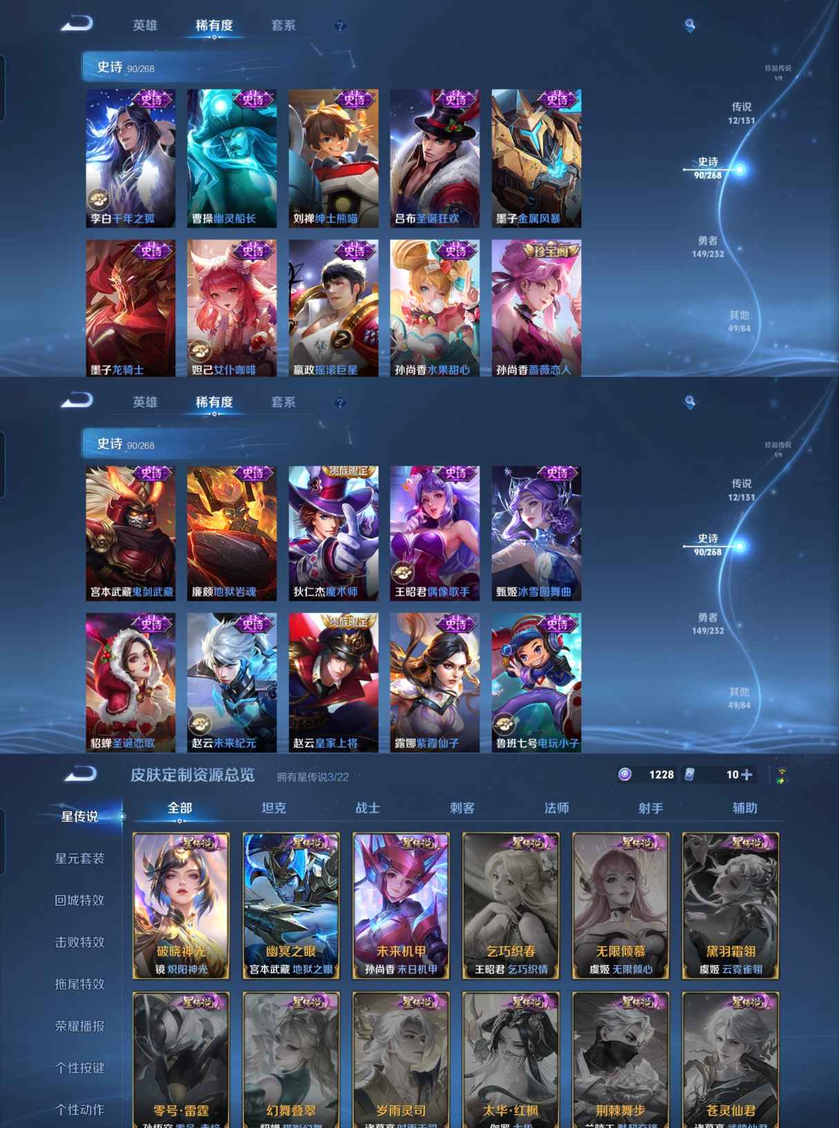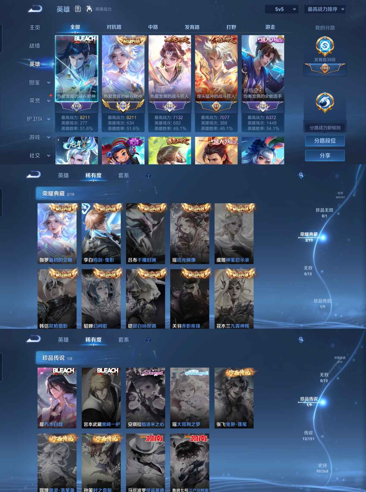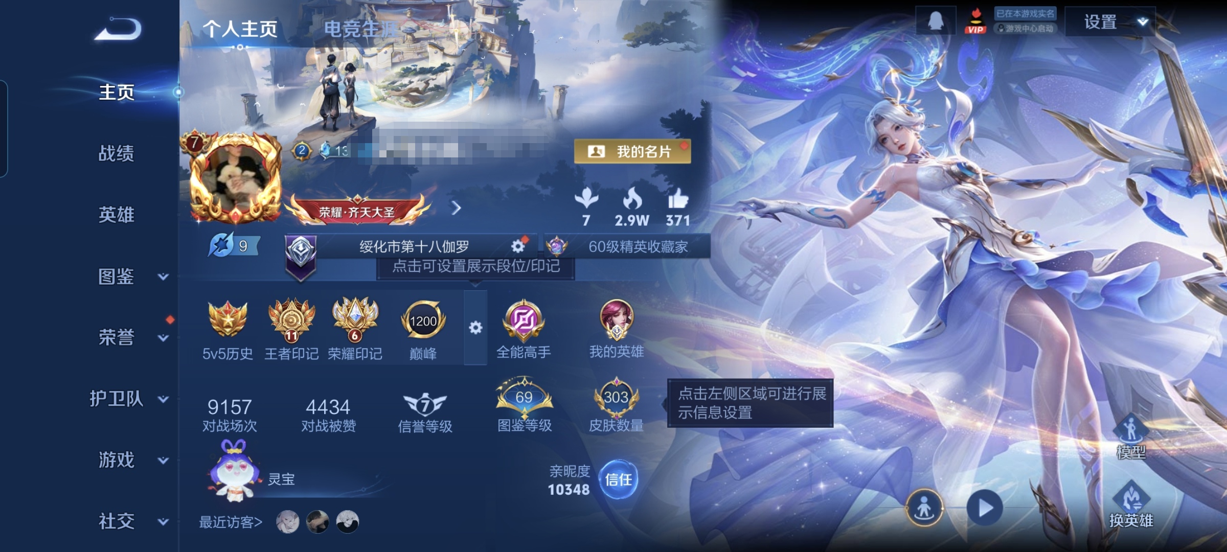 贵族等级:v7皮肤数:303传说品质12 生肖限定4 情人节限定2 珍品传说1 荣耀典藏2 英雄数:127