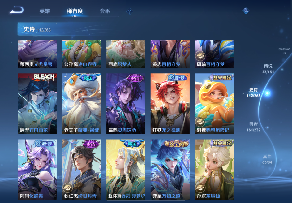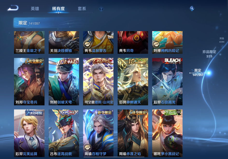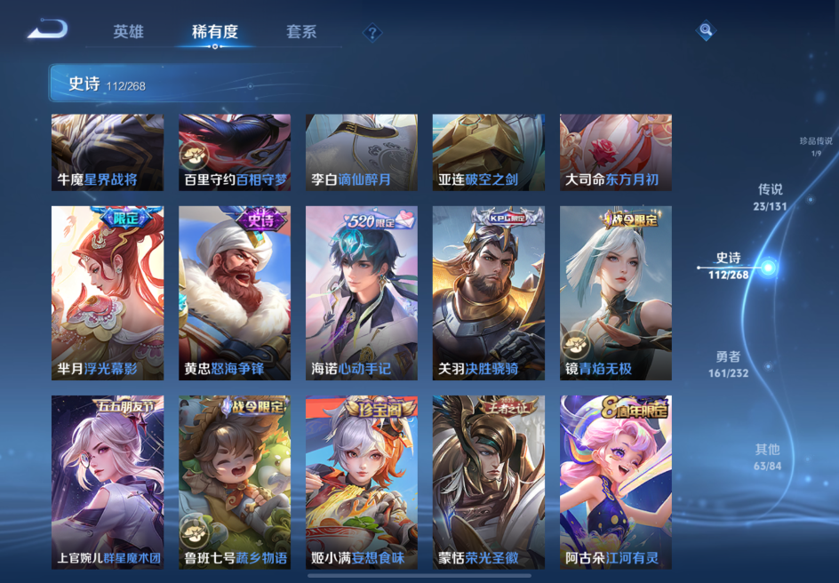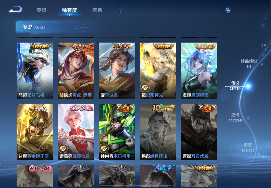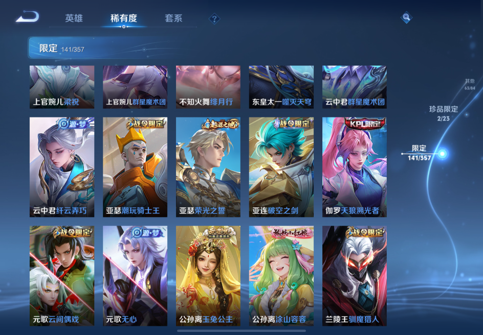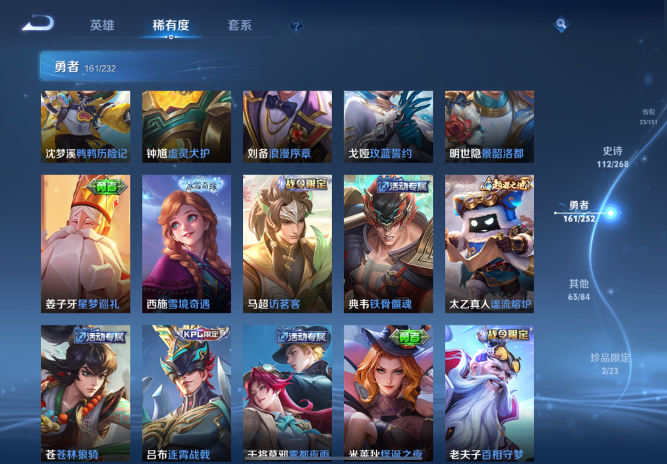 贵族等级:v8皮肤数:363传说品质23 生肖限定6 情人节限定2 荣耀典藏2 珍品传说1 无双1 英雄数:128