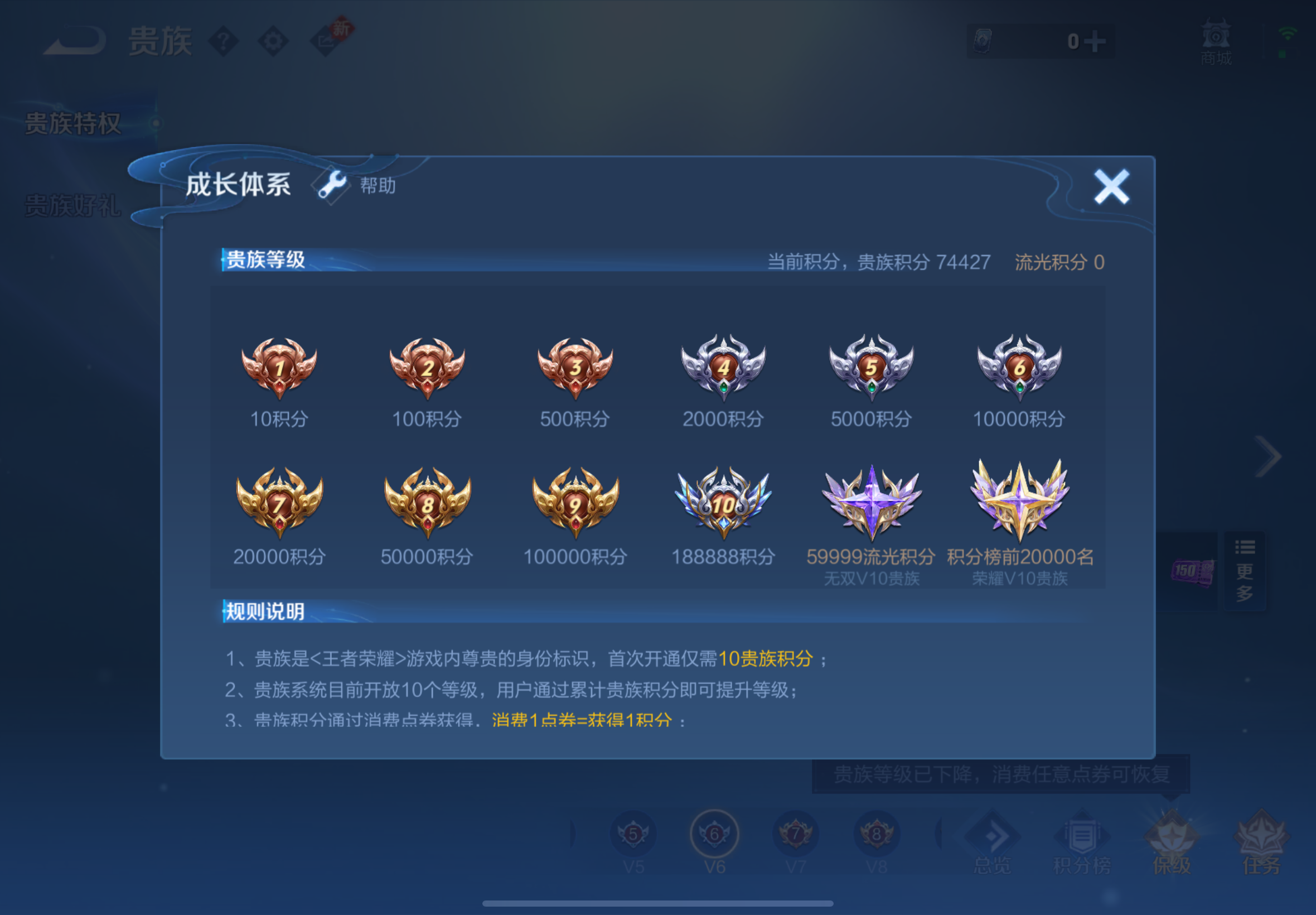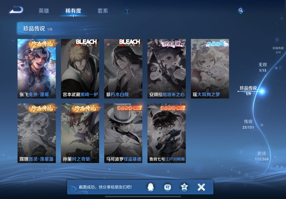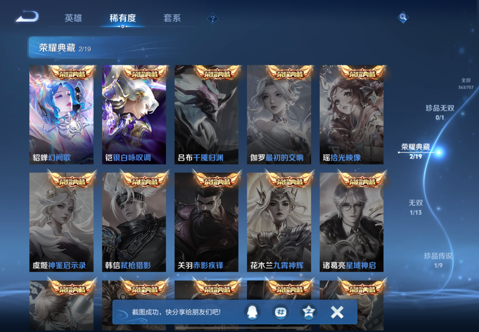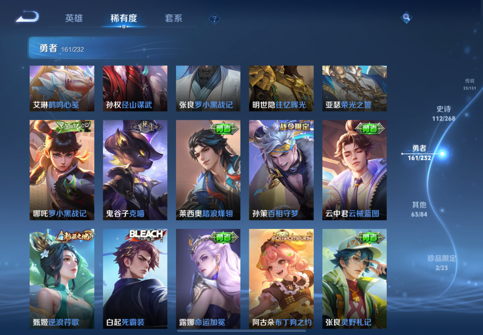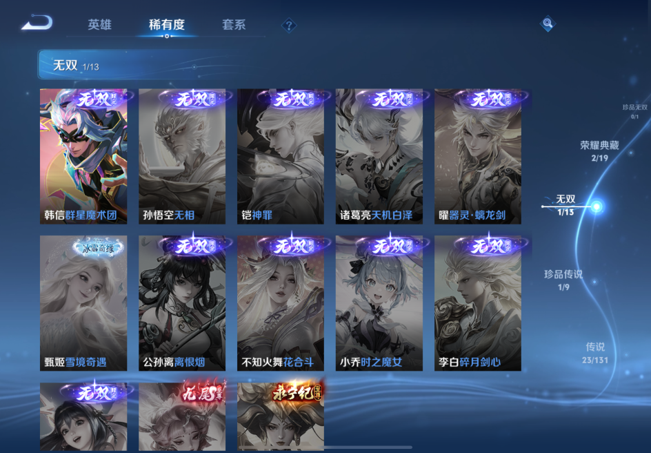 贵族等级:v8皮肤数:363传说品质23 生肖限定6 情人节限定2 荣耀典藏2 珍品传说1 无双1 英雄数:128