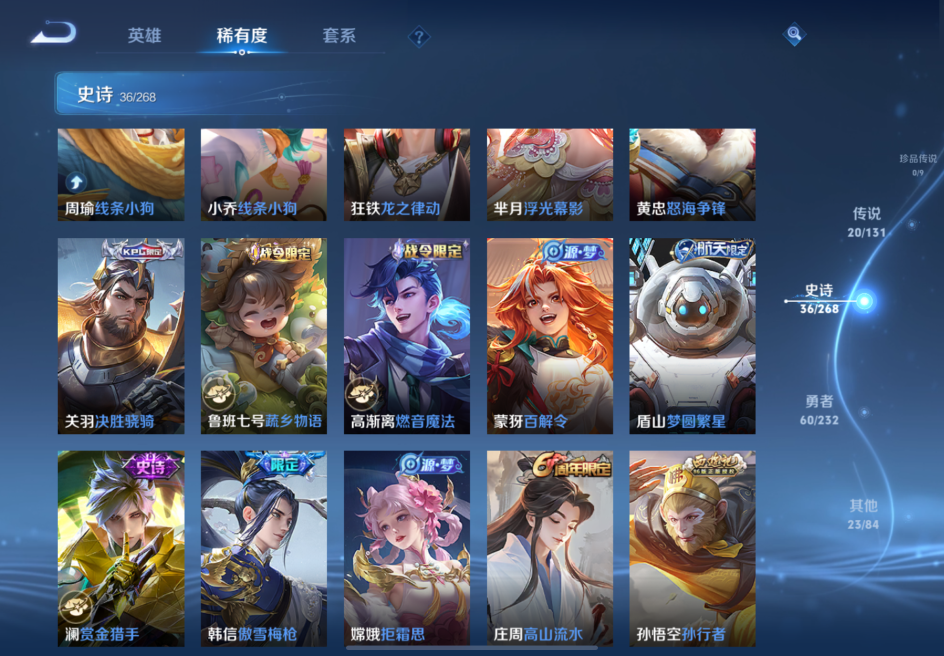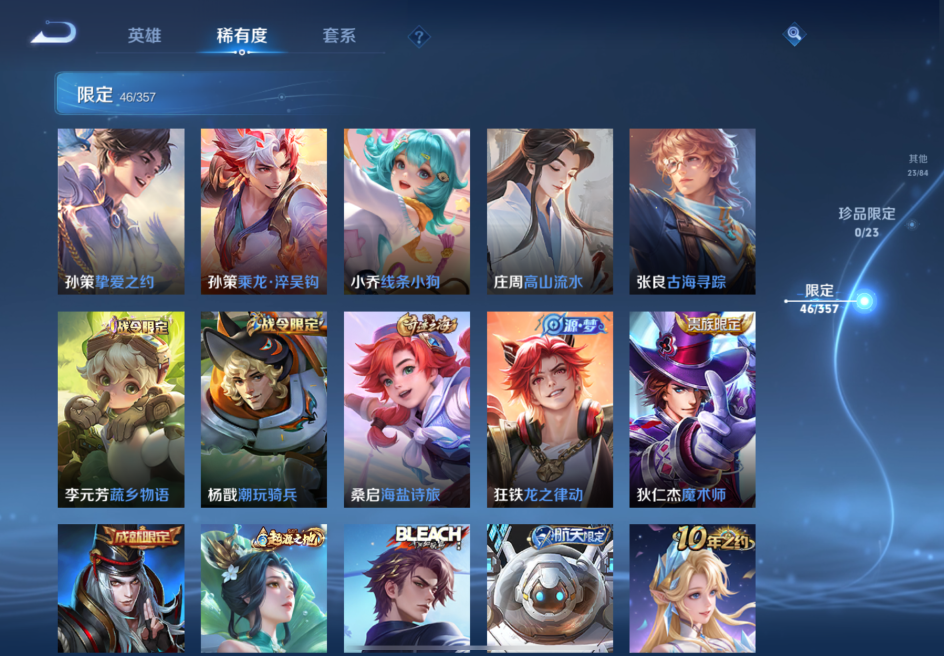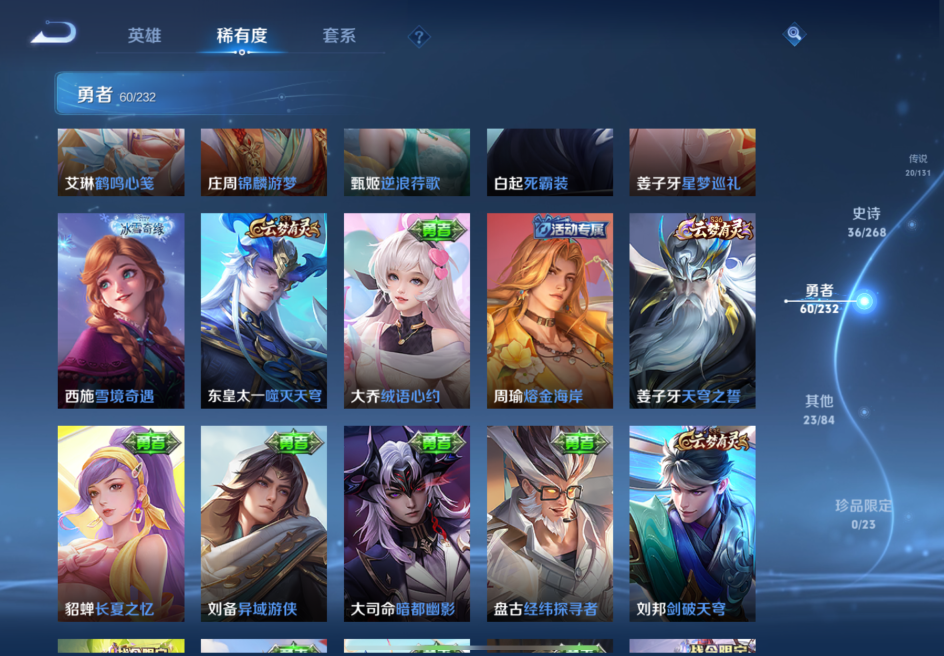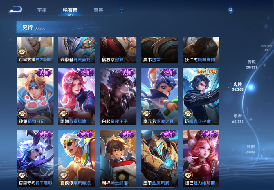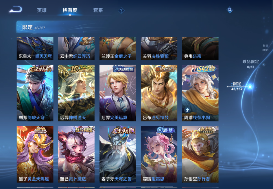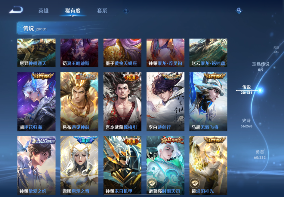贵族等级:v7皮肤数:139传说品质20 生肖限定4 英雄数:124