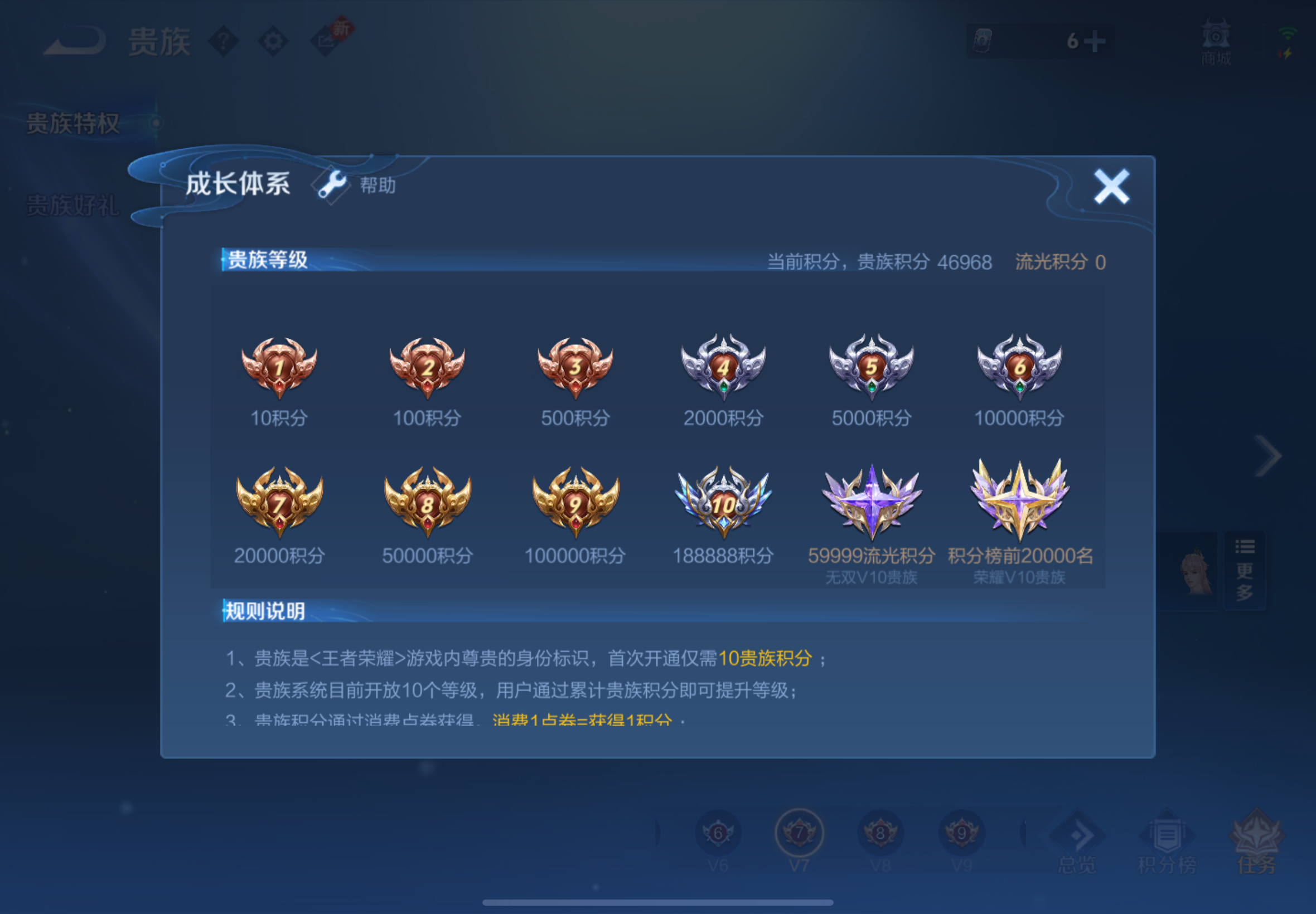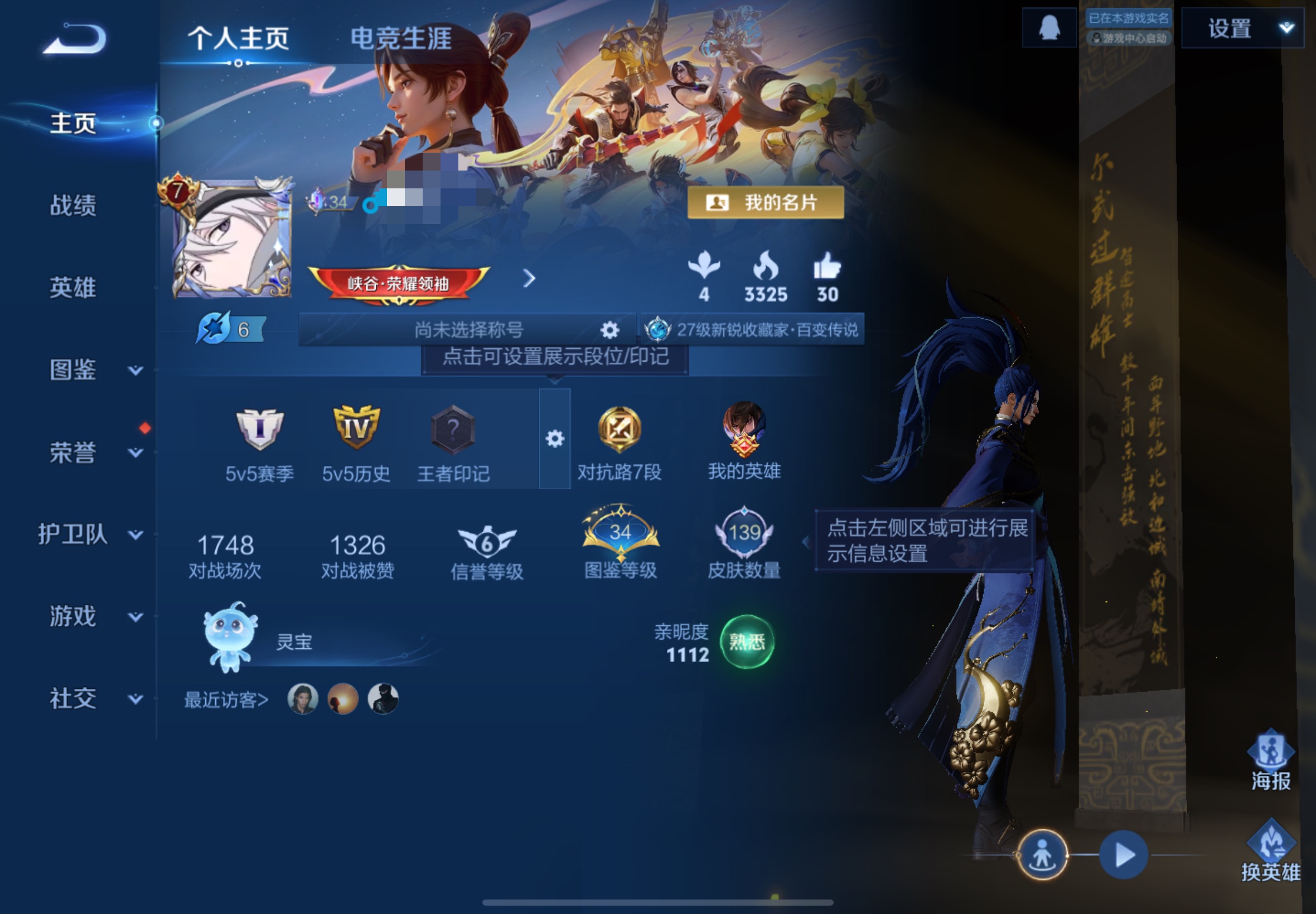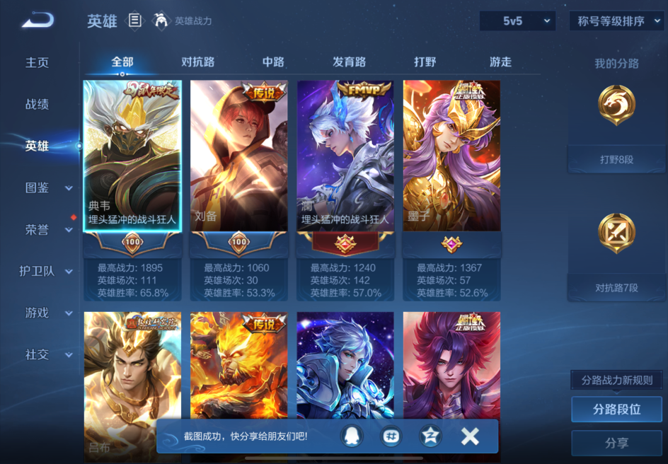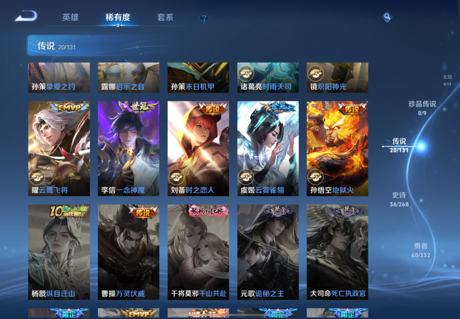 贵族等级:v7皮肤数:139传说品质20 生肖限定4 英雄数:124