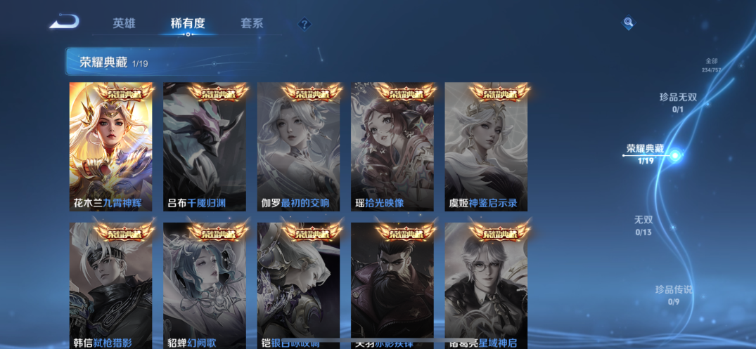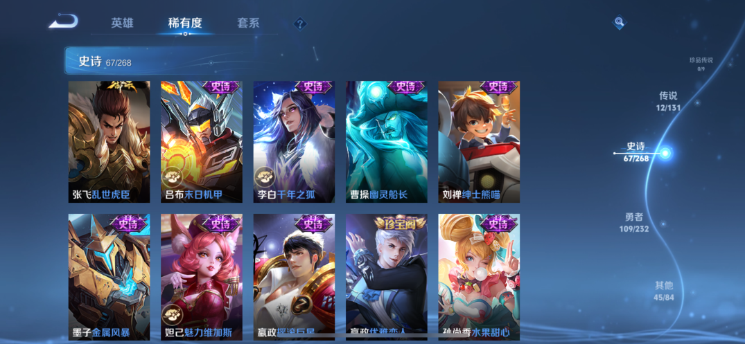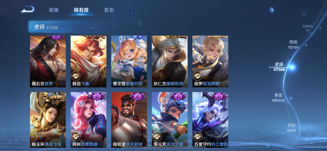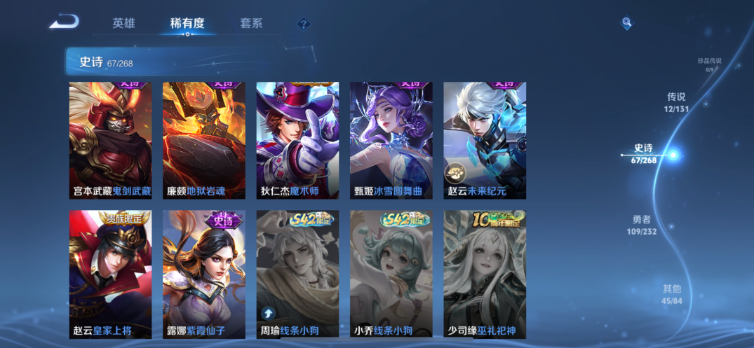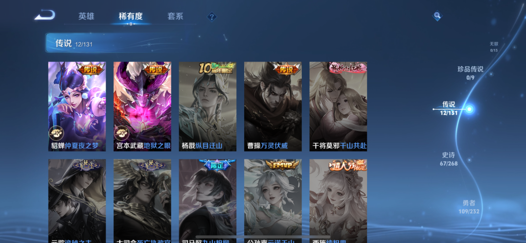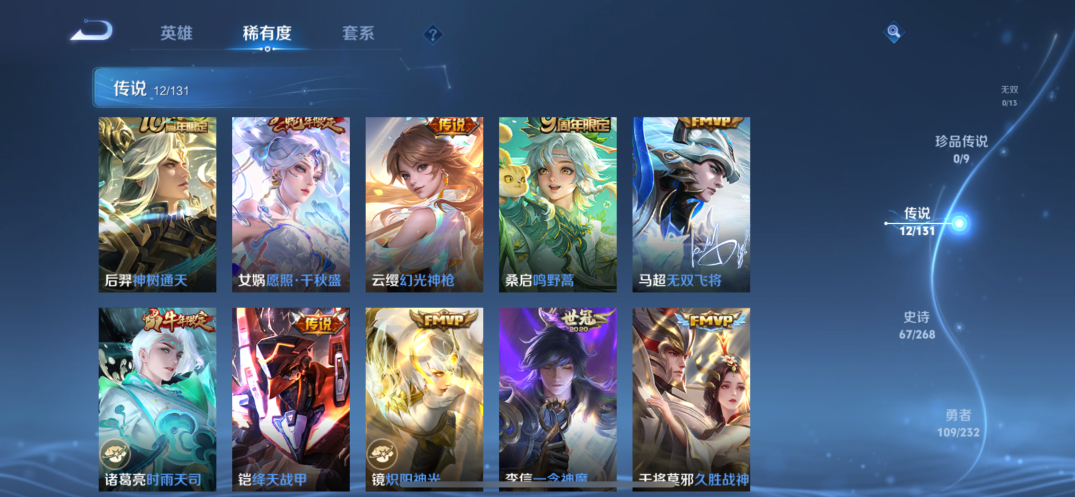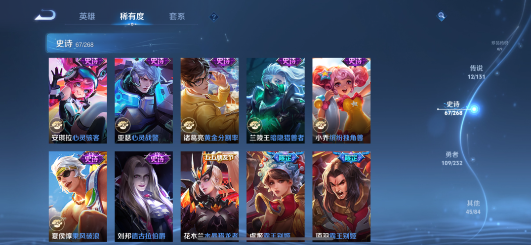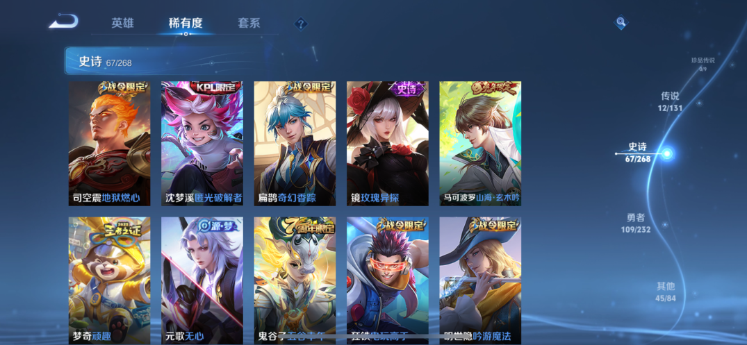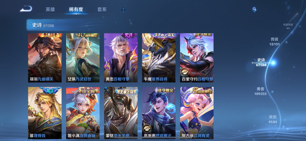 贵族等级:v7皮肤数:234传说品质12 生肖限定5 荣耀典藏1 英雄数:127
