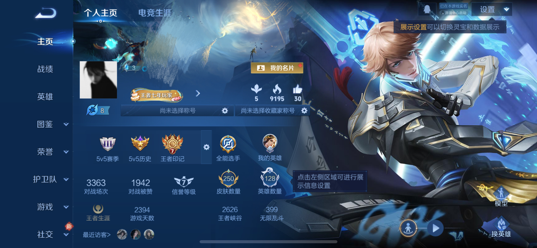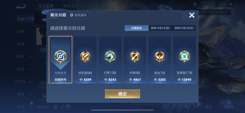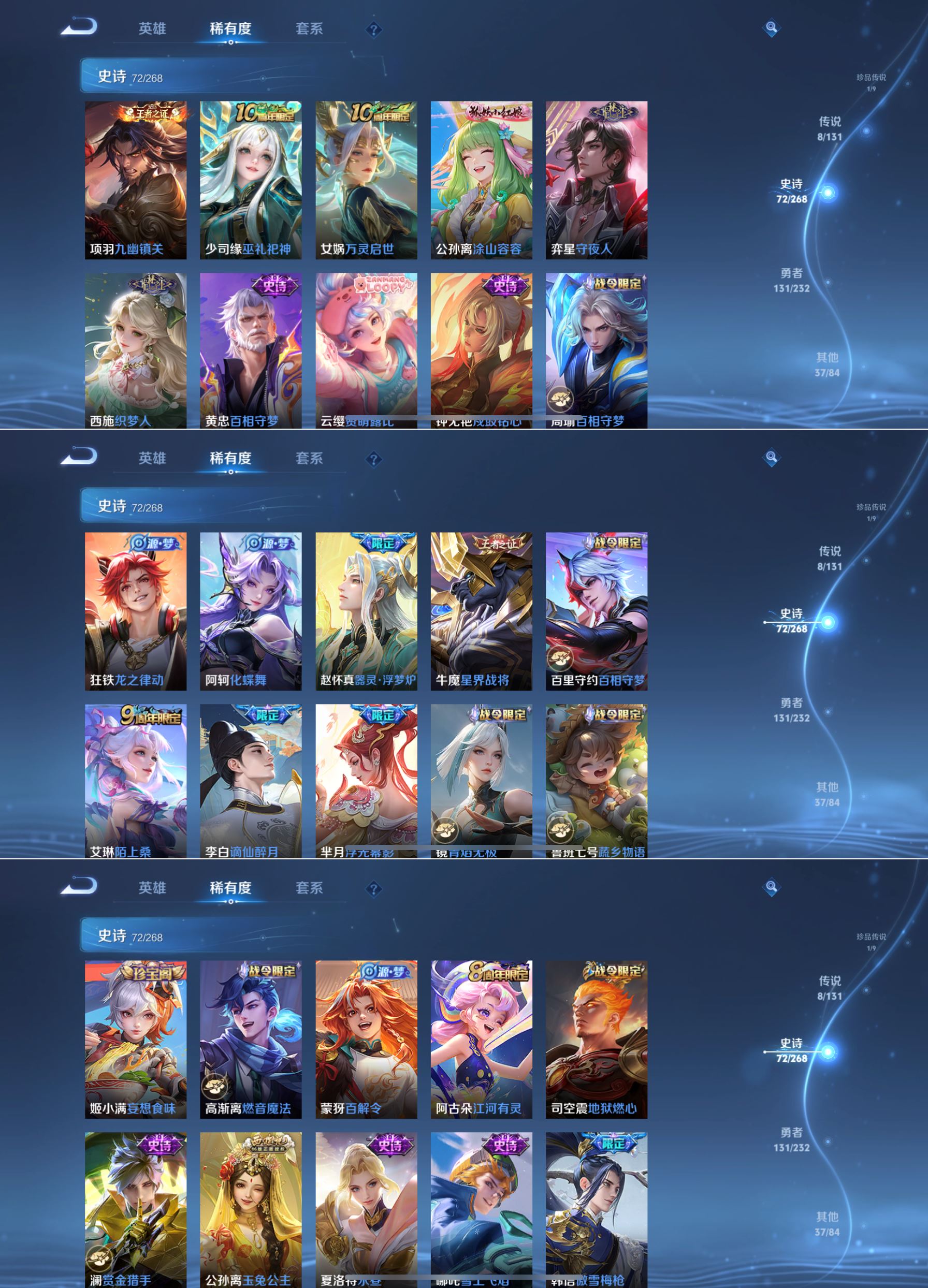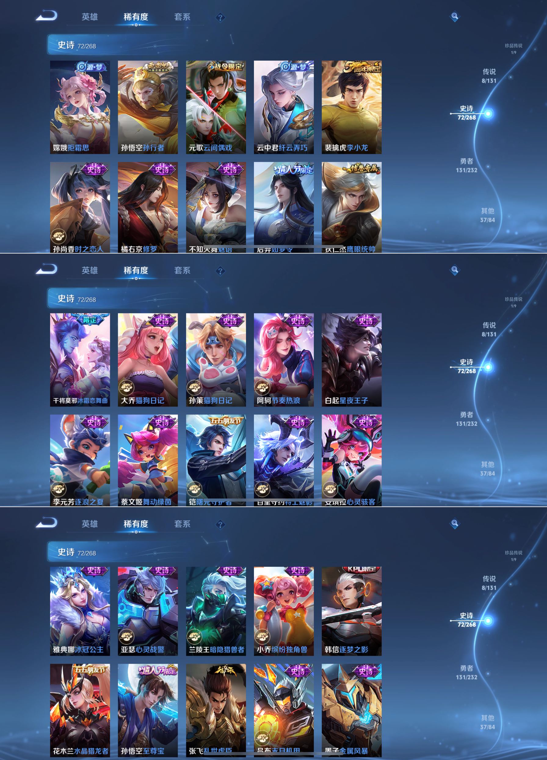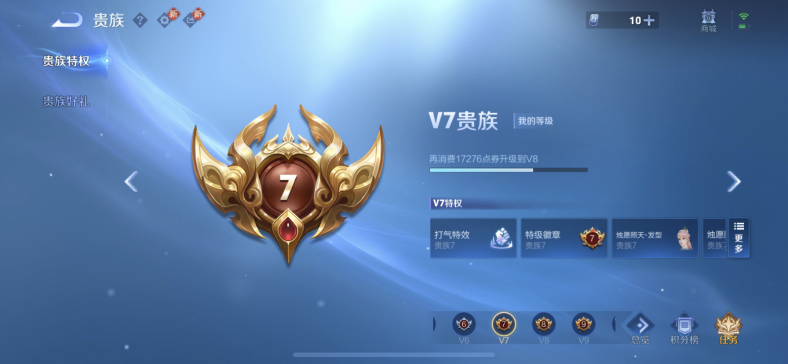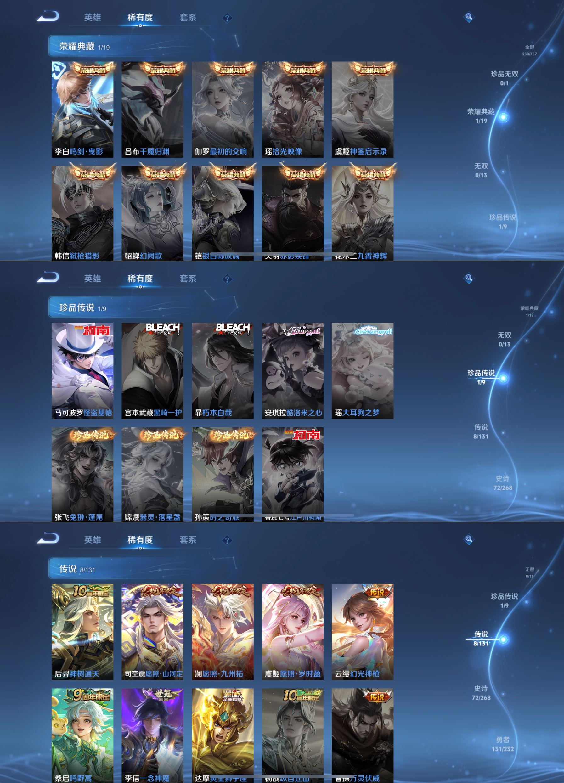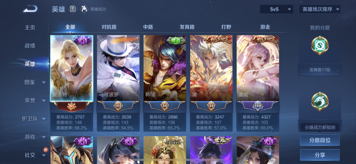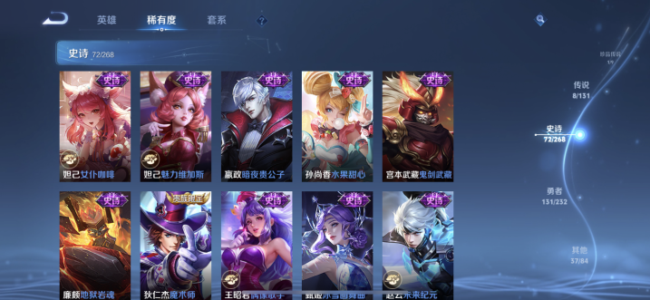 贵族等级:v7皮肤数:250情人节限定2 传说品质8 生肖限定3 珍品传说1 荣耀典藏1 英雄数:128