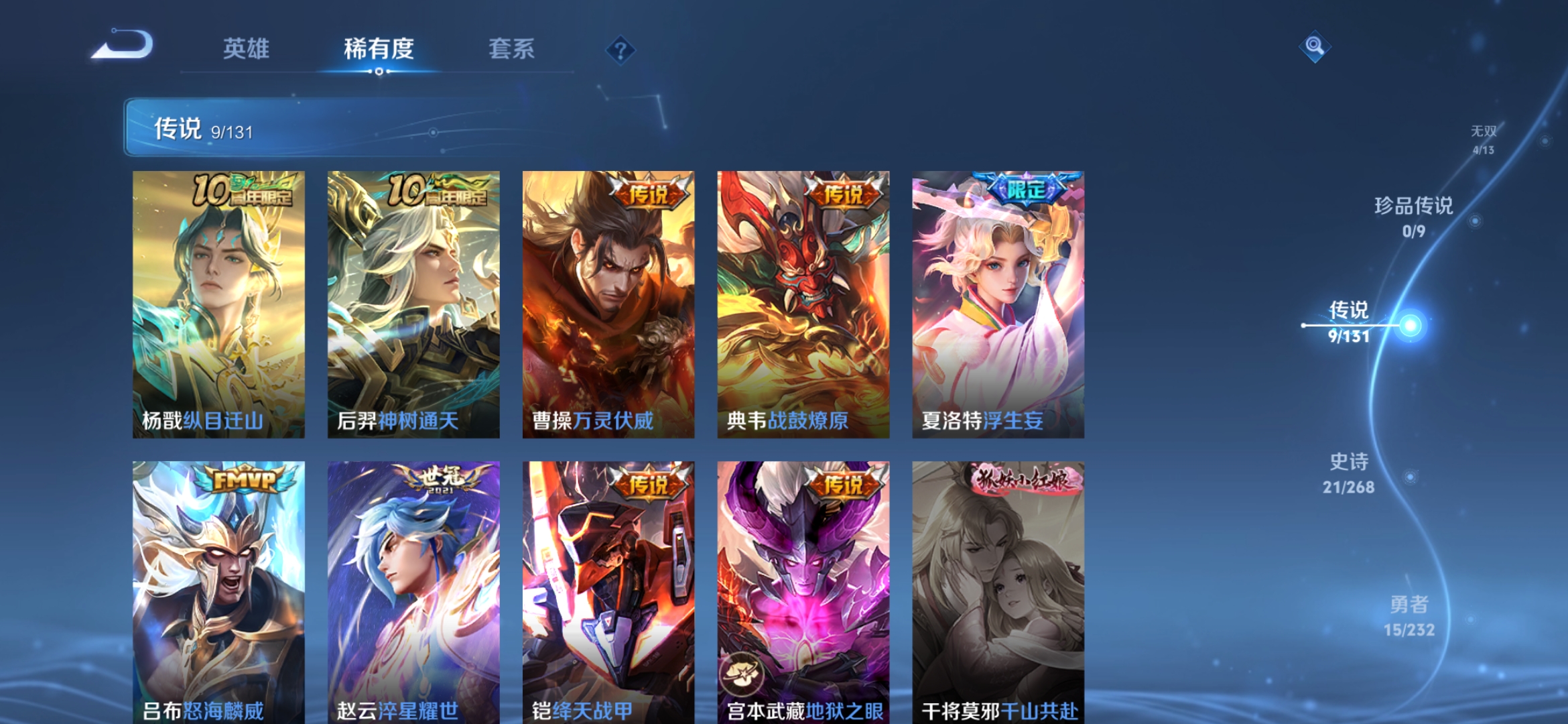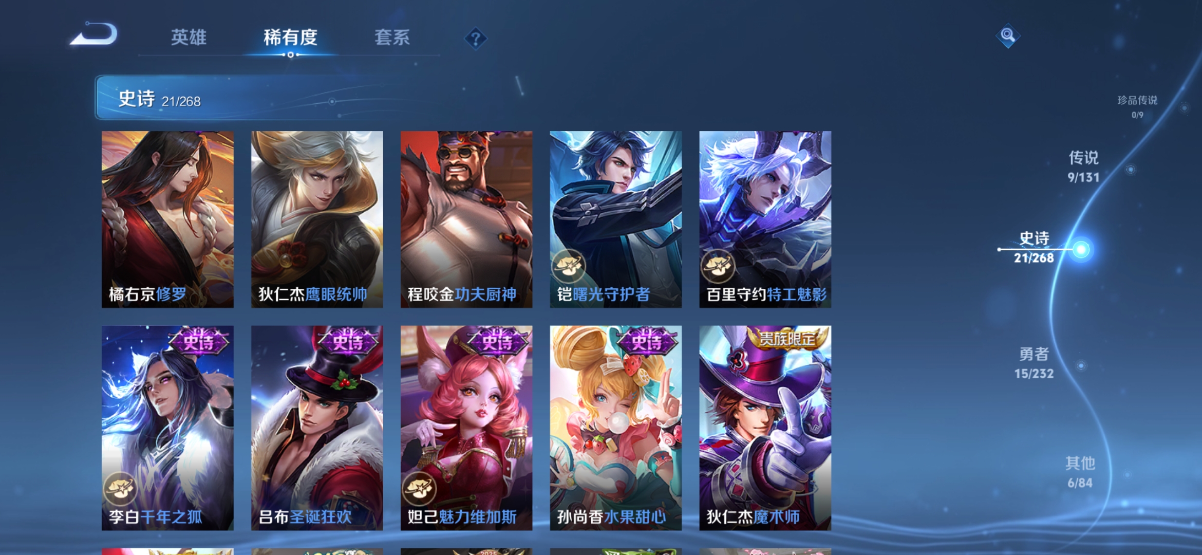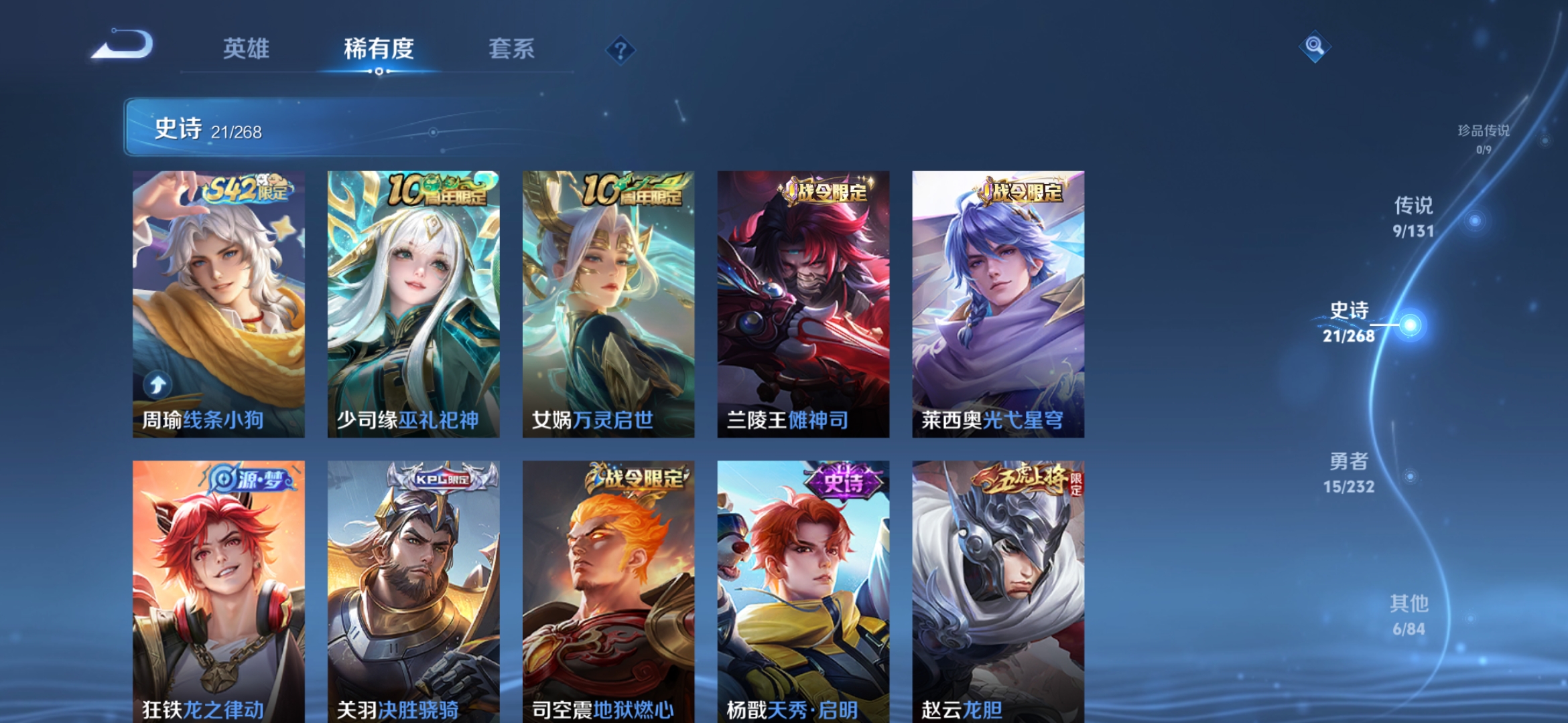 贵族等级:v7皮肤数:55传说品质9 无双4 英雄数:47