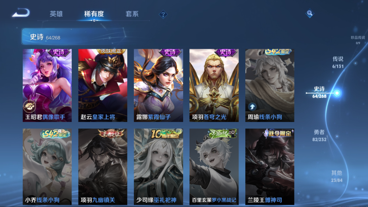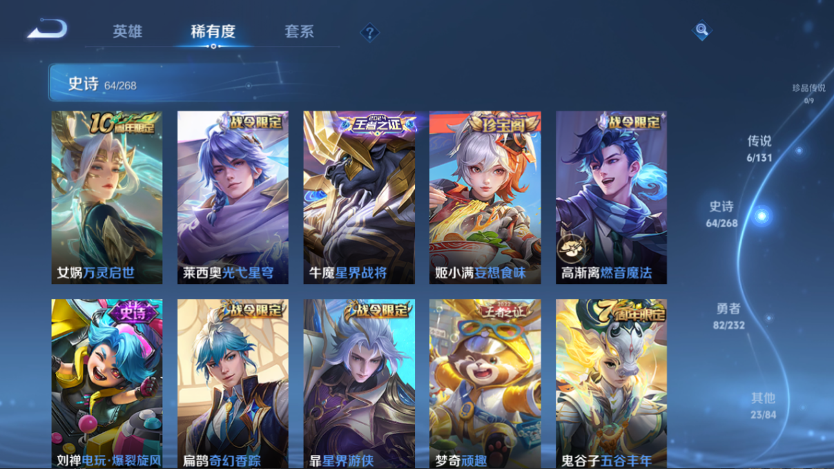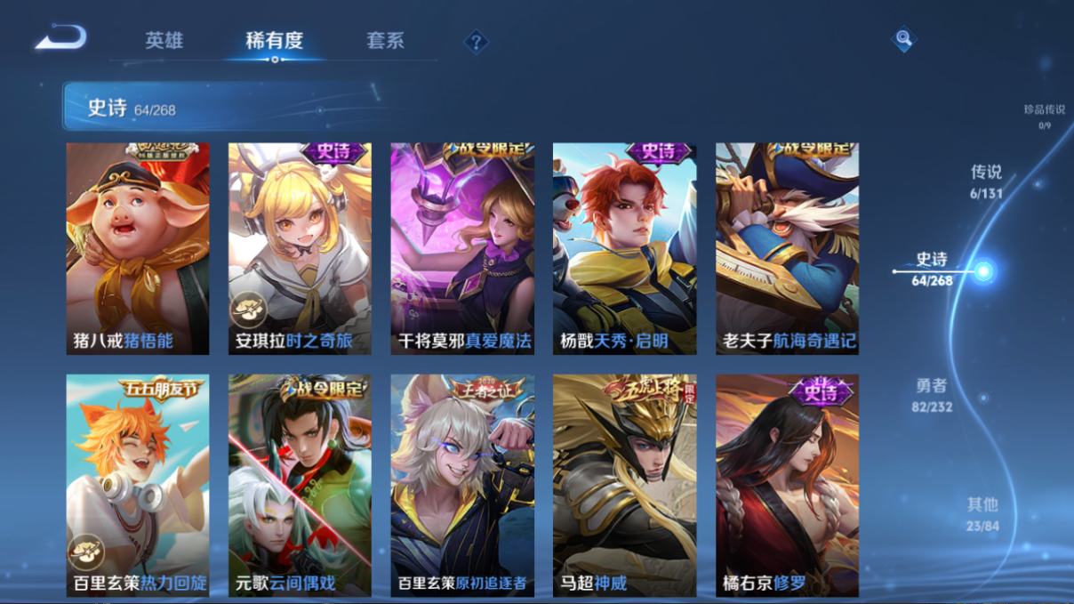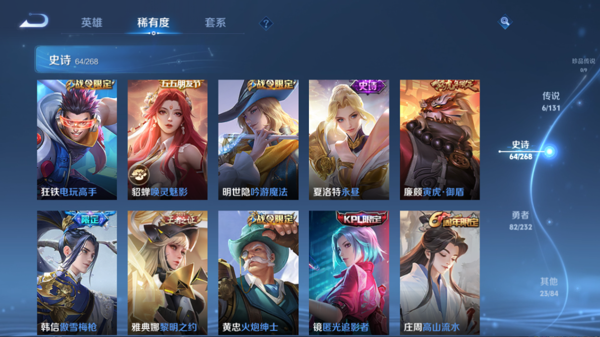 贵族等级:v7皮肤数:176传说品质6 情人节限定1 荣耀典藏1 生肖限定3 英雄数:127