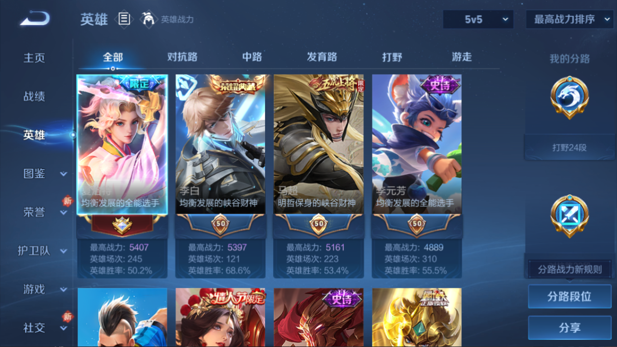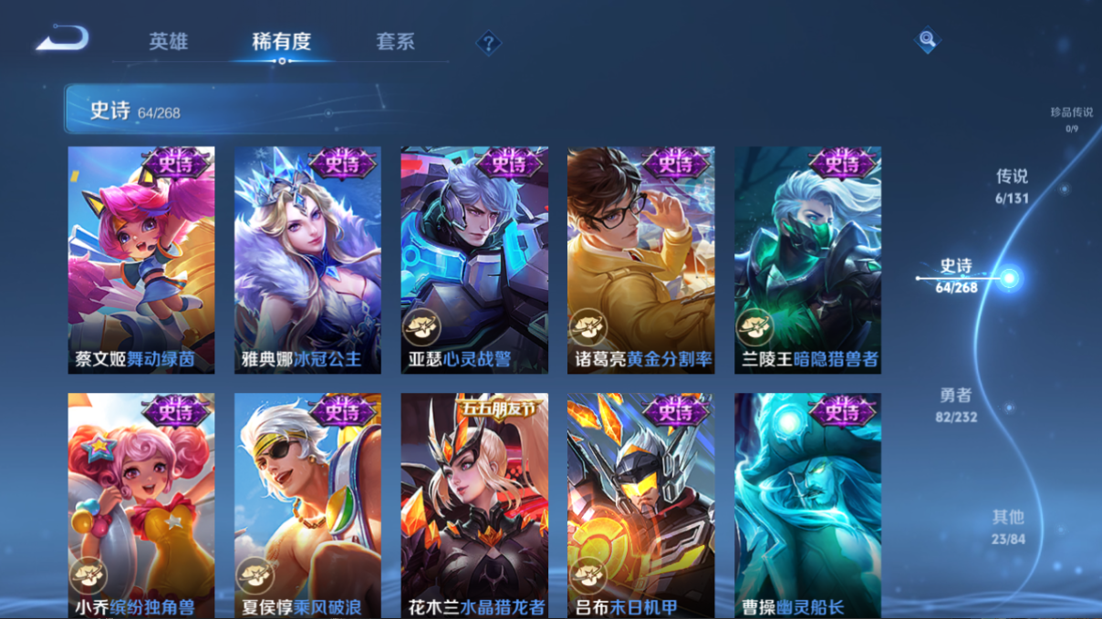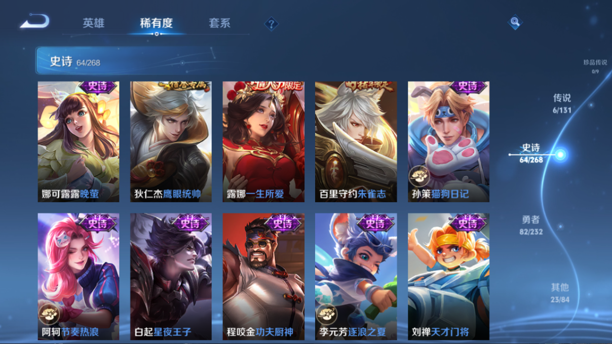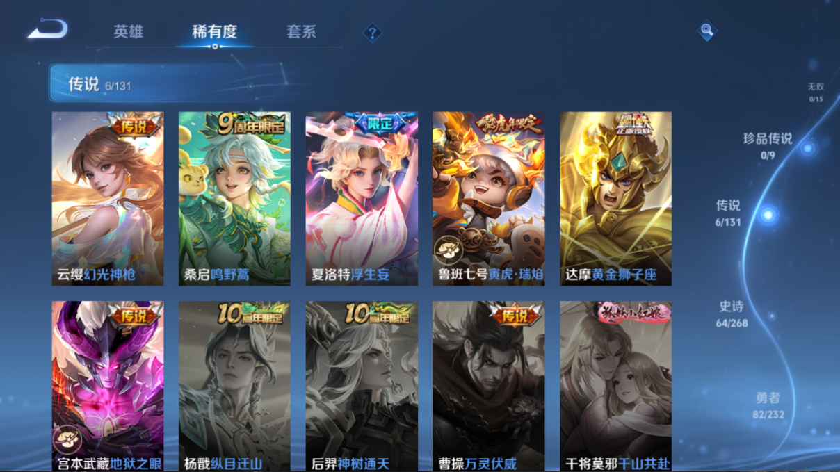 贵族等级:v7皮肤数:176传说品质6 情人节限定1 荣耀典藏1 生肖限定3 英雄数:127