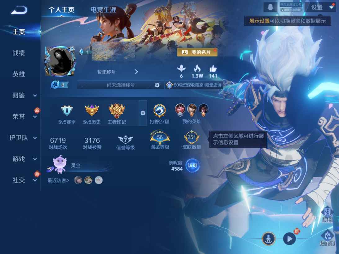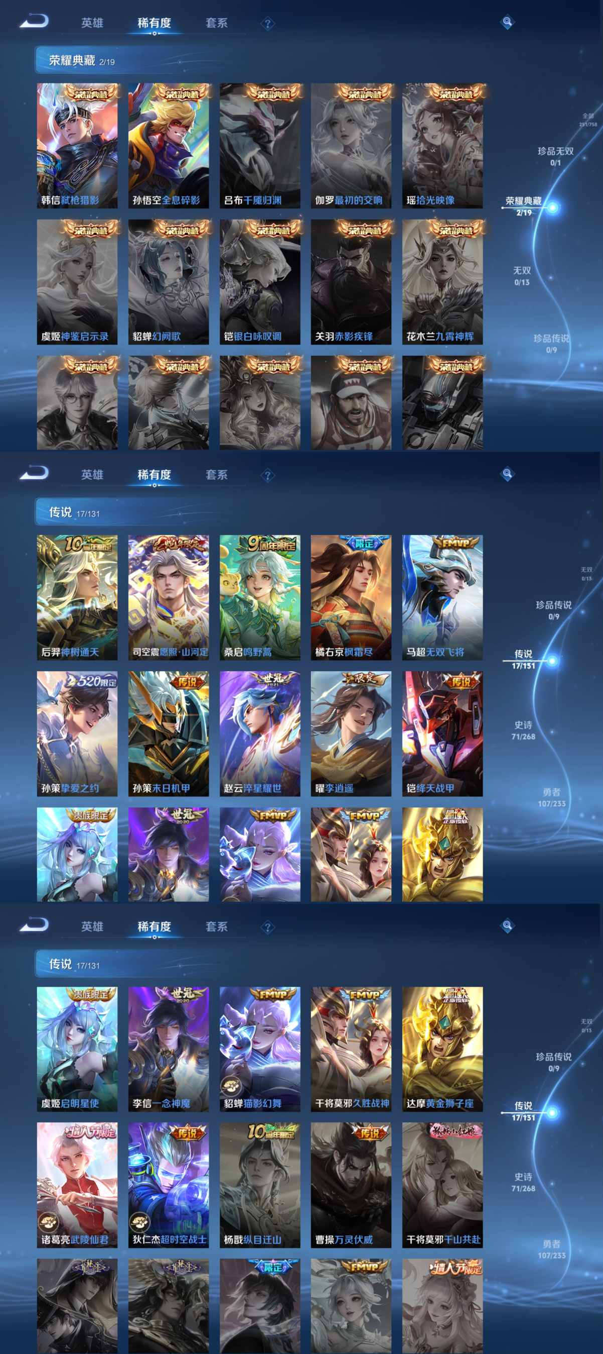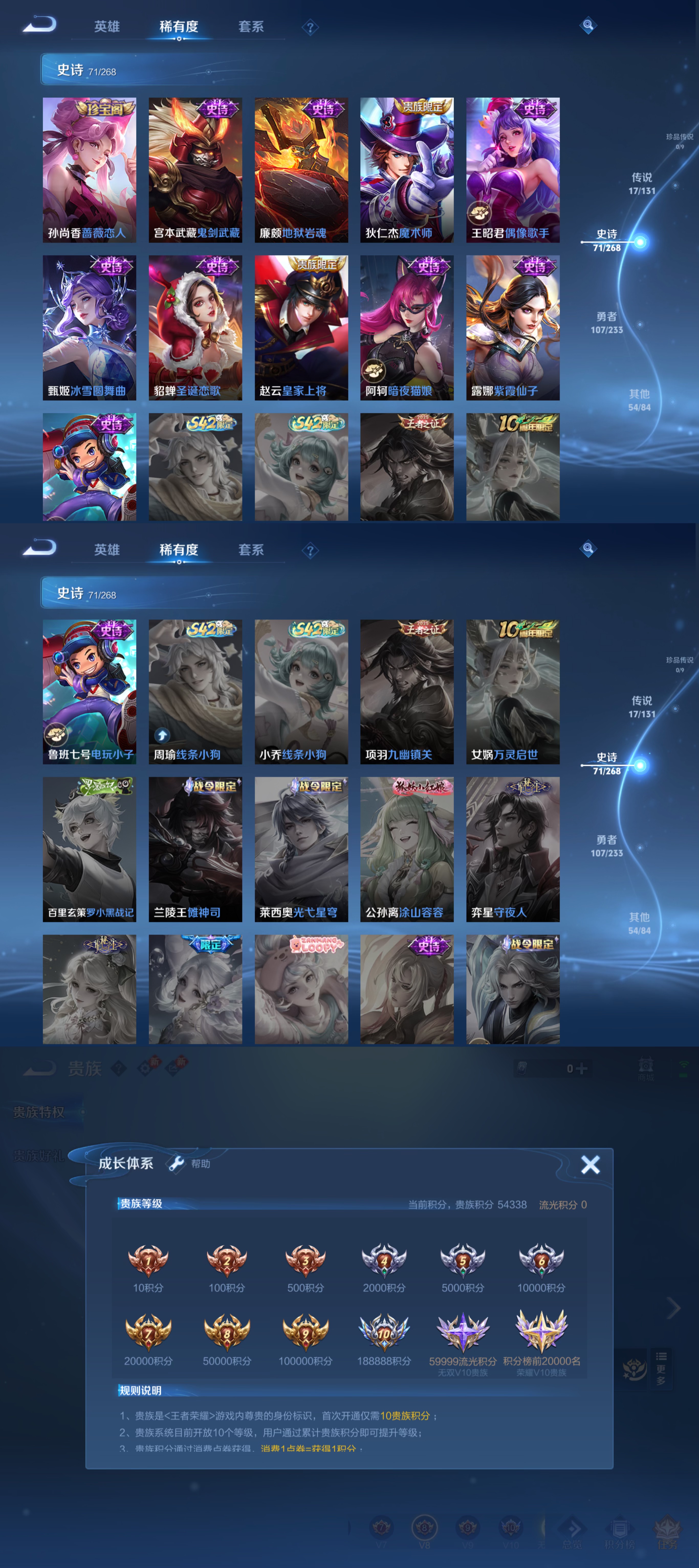 贵族等级:v8皮肤数:251传说品质17 生肖限定3 情人节限定1 荣耀典藏2 英雄数:127