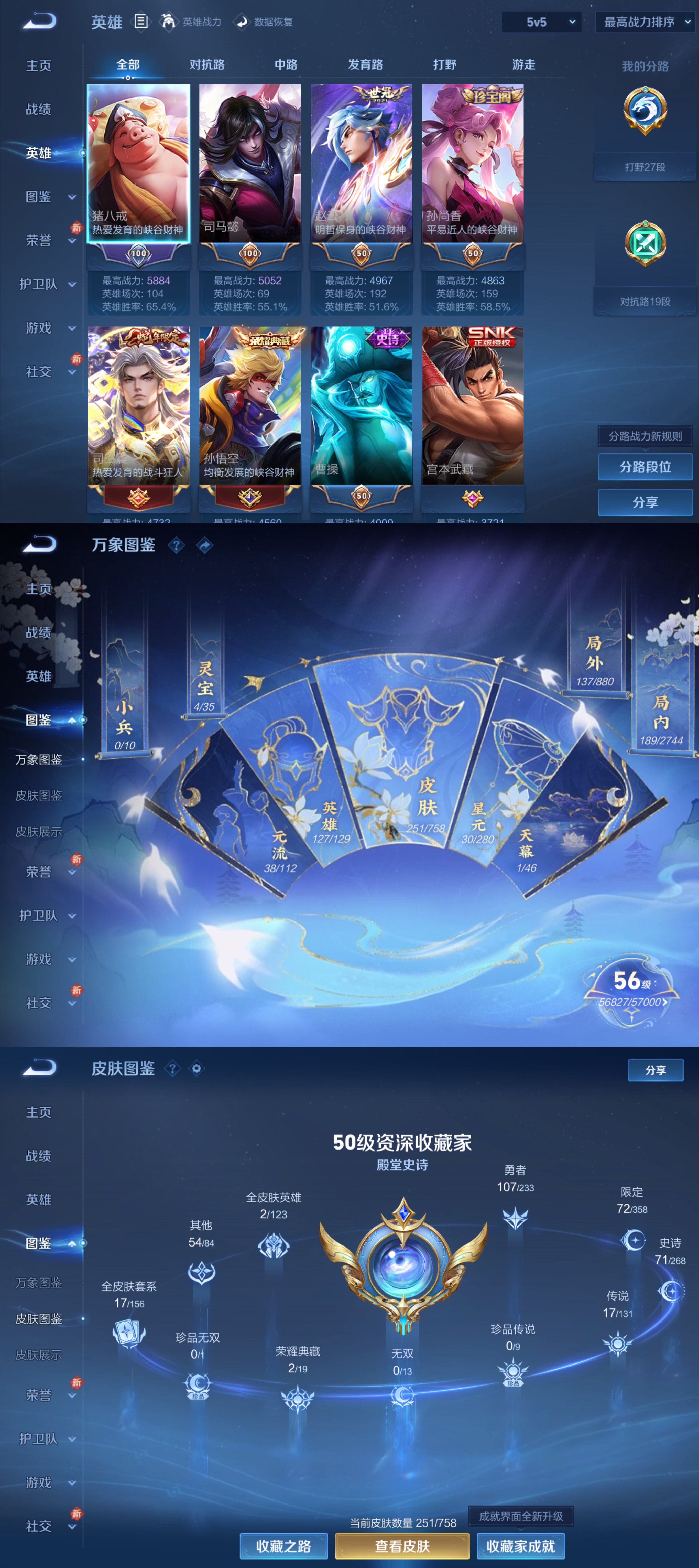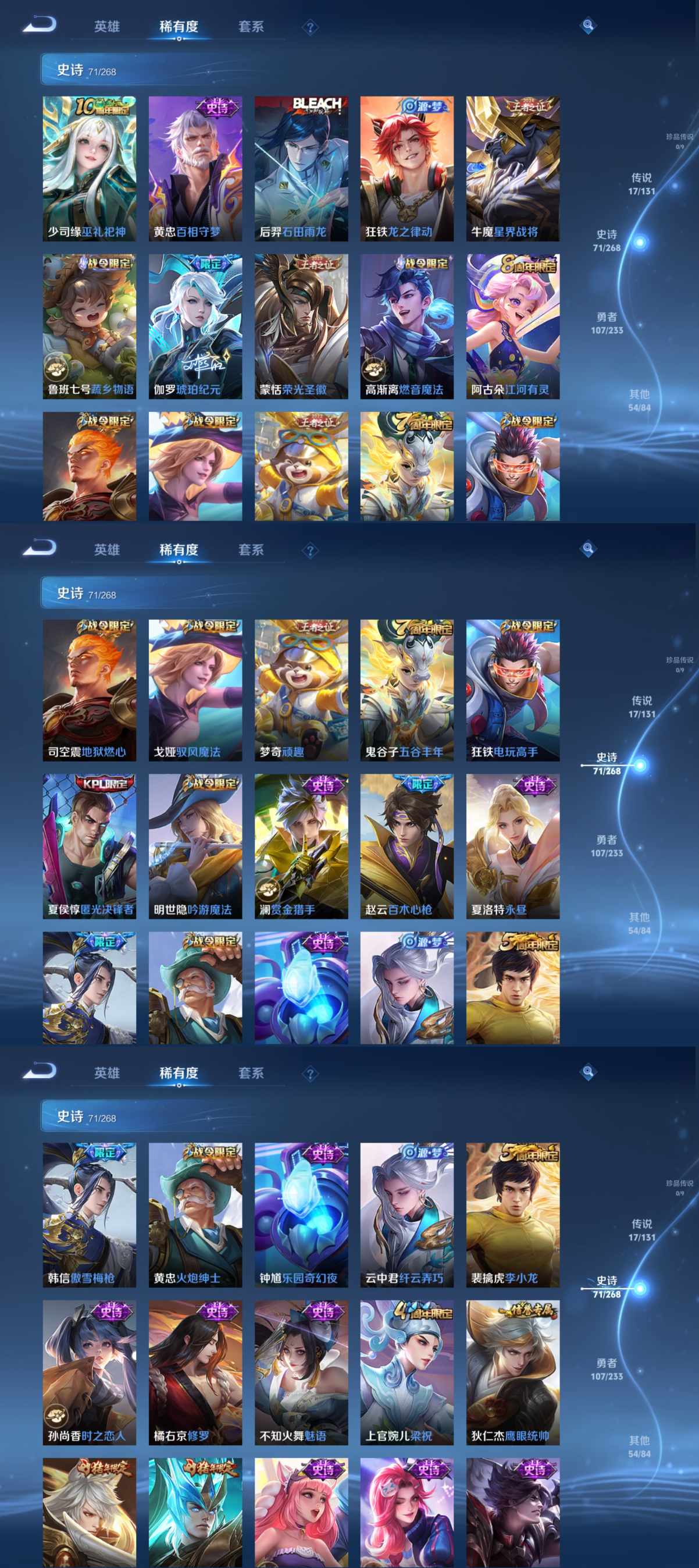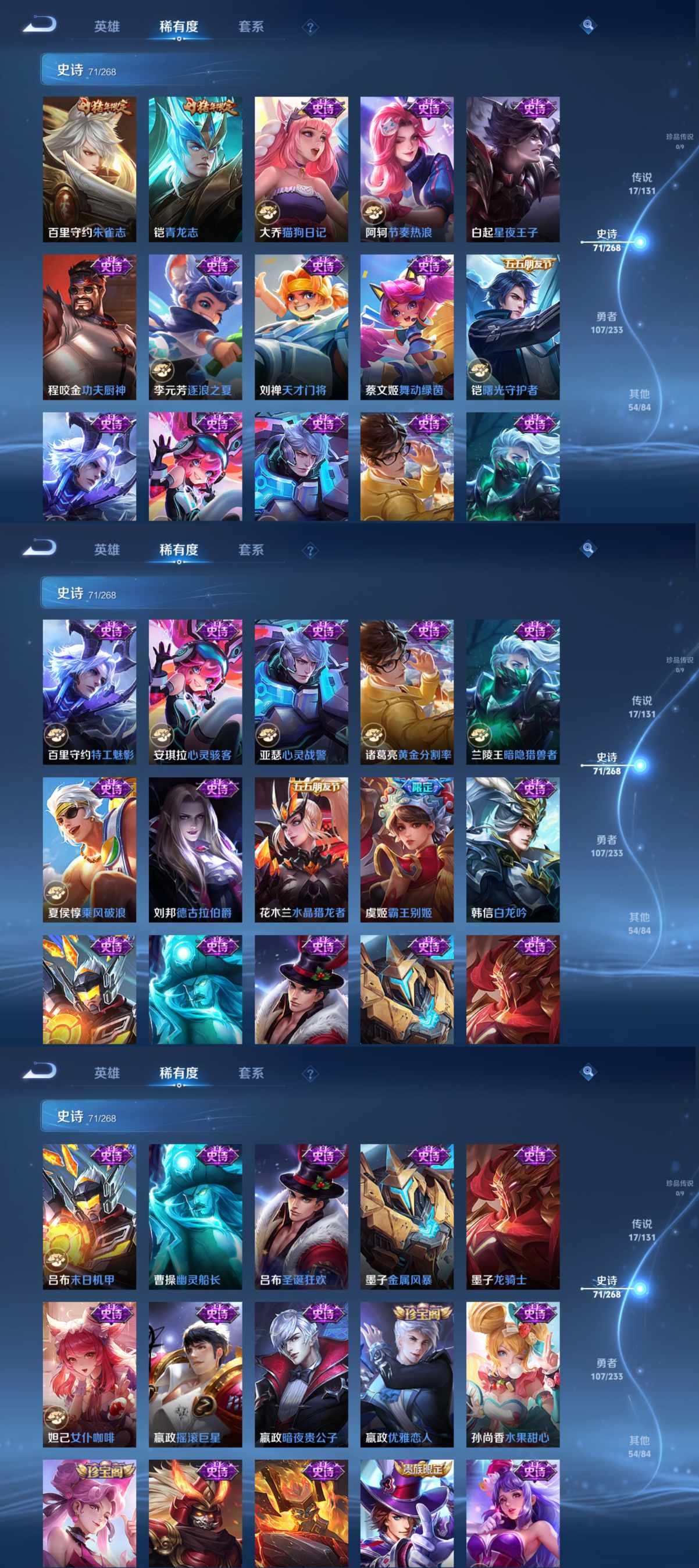 贵族等级:v8皮肤数:251传说品质17 生肖限定3 情人节限定1 荣耀典藏2 英雄数:127