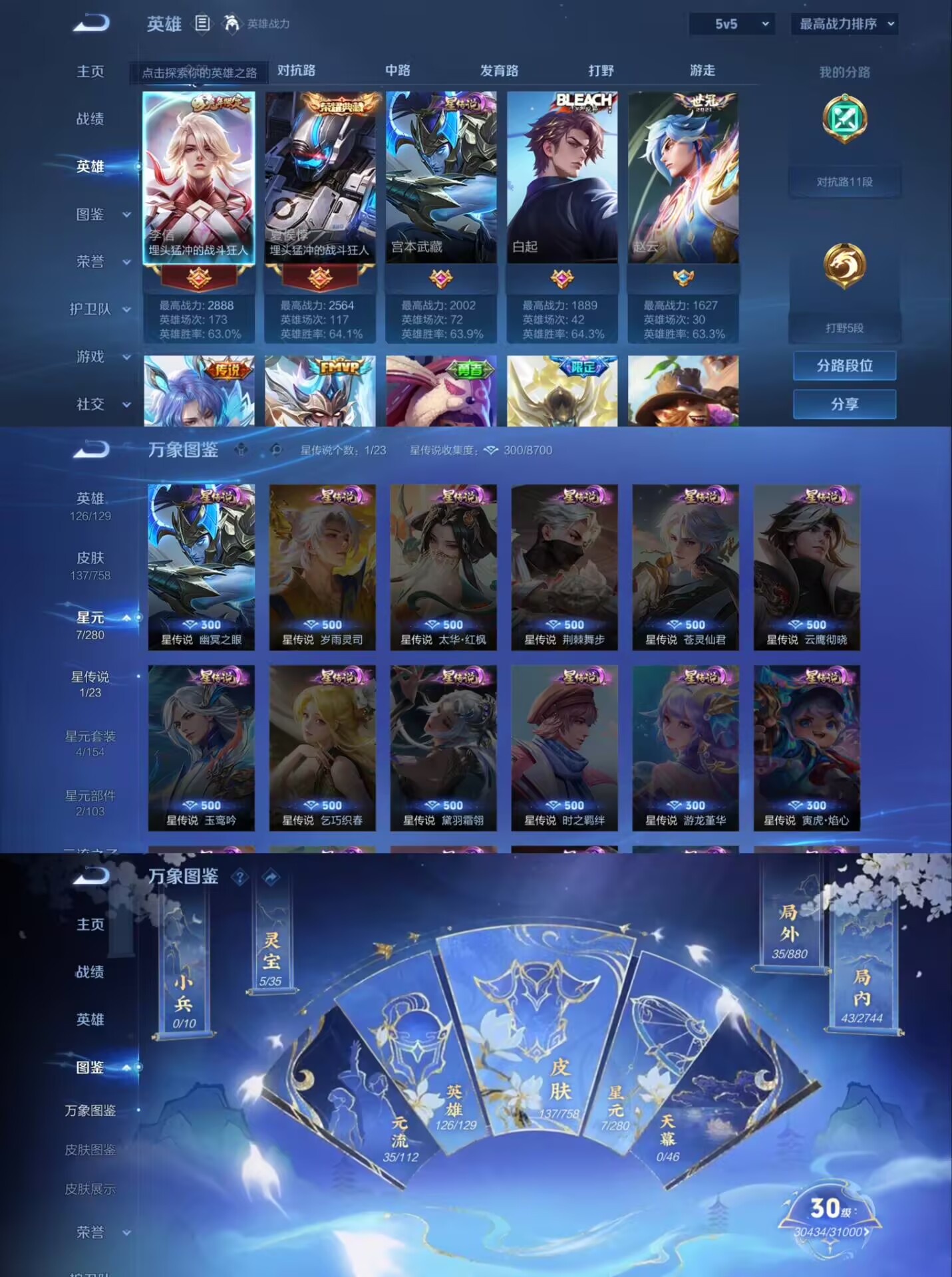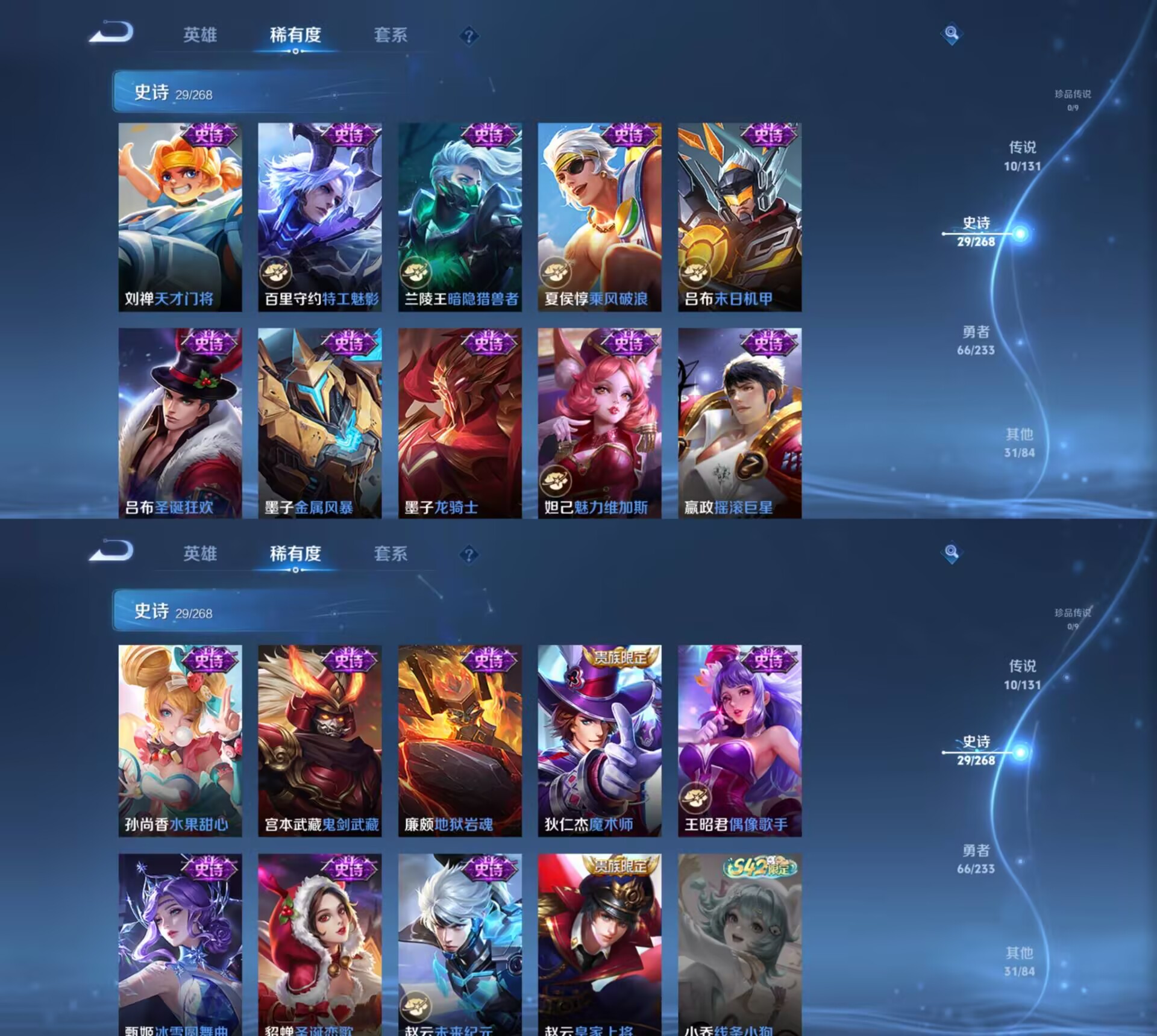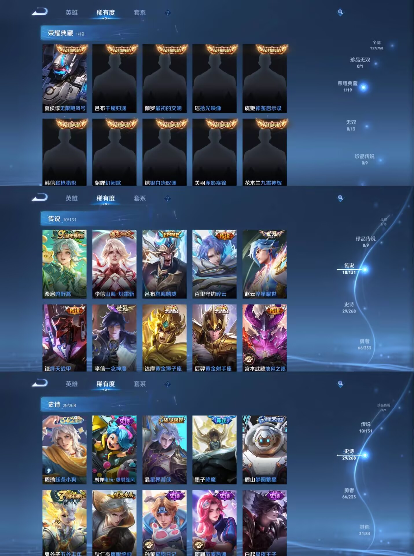 贵族等级:v7皮肤数:137传说品质10 生肖限定1 荣耀典藏1 英雄数:126