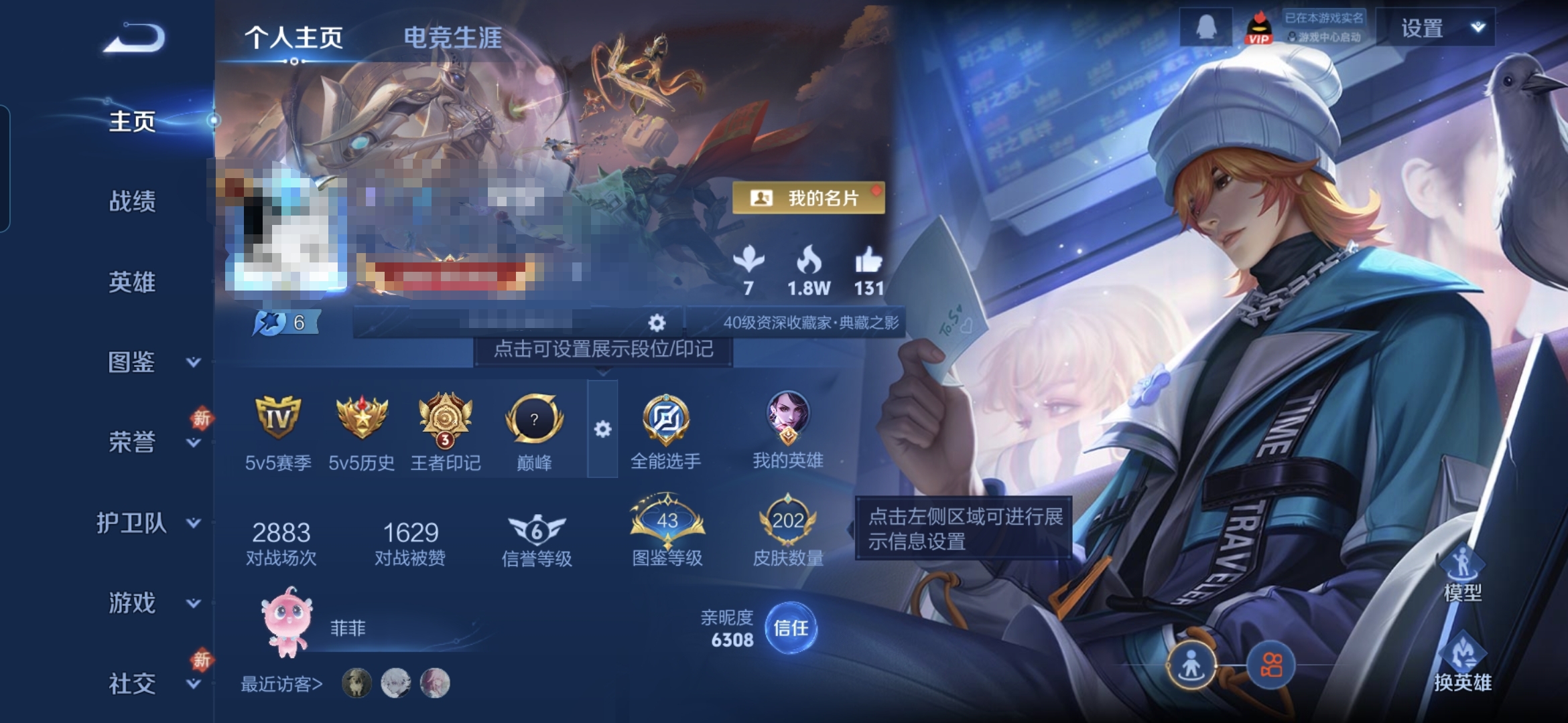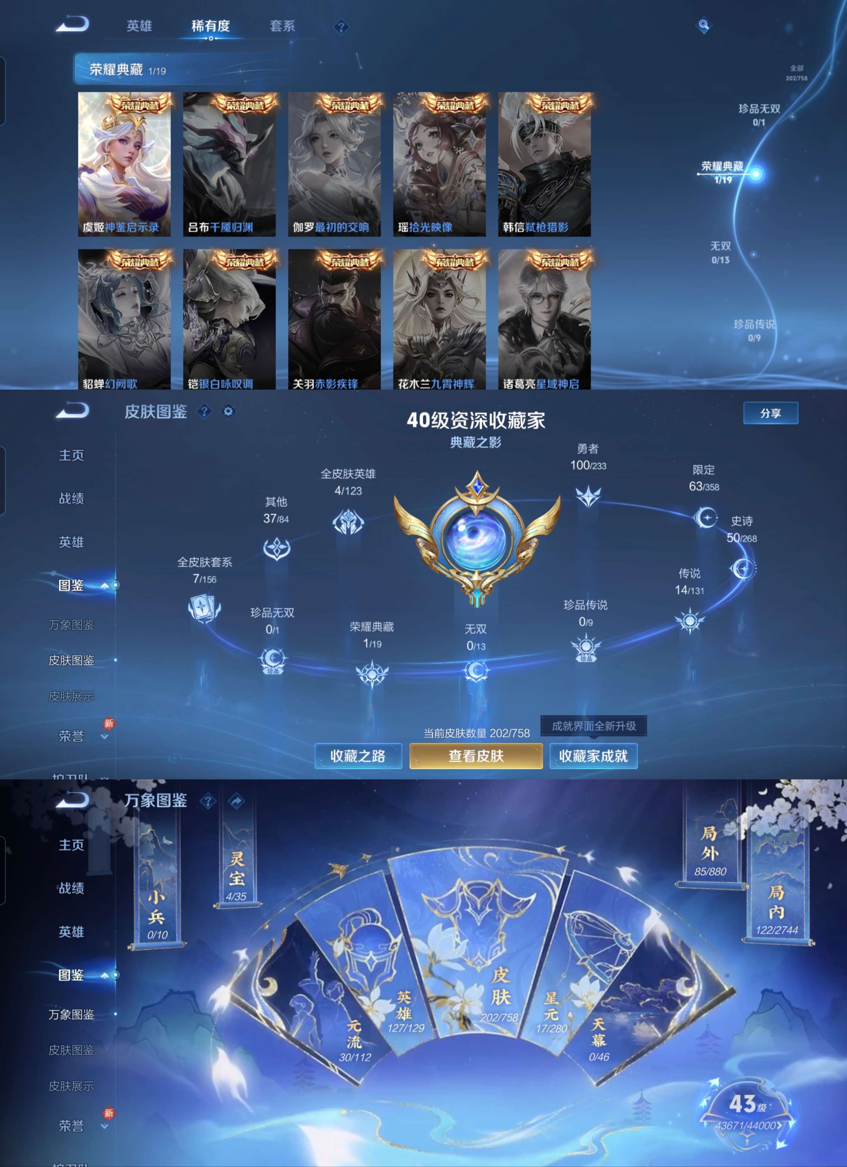 贵族等级:v7皮肤数:202传说品质14 生肖限定4 勇者品质1 限定1 线条小狗1 荣耀典藏1 英雄数:127