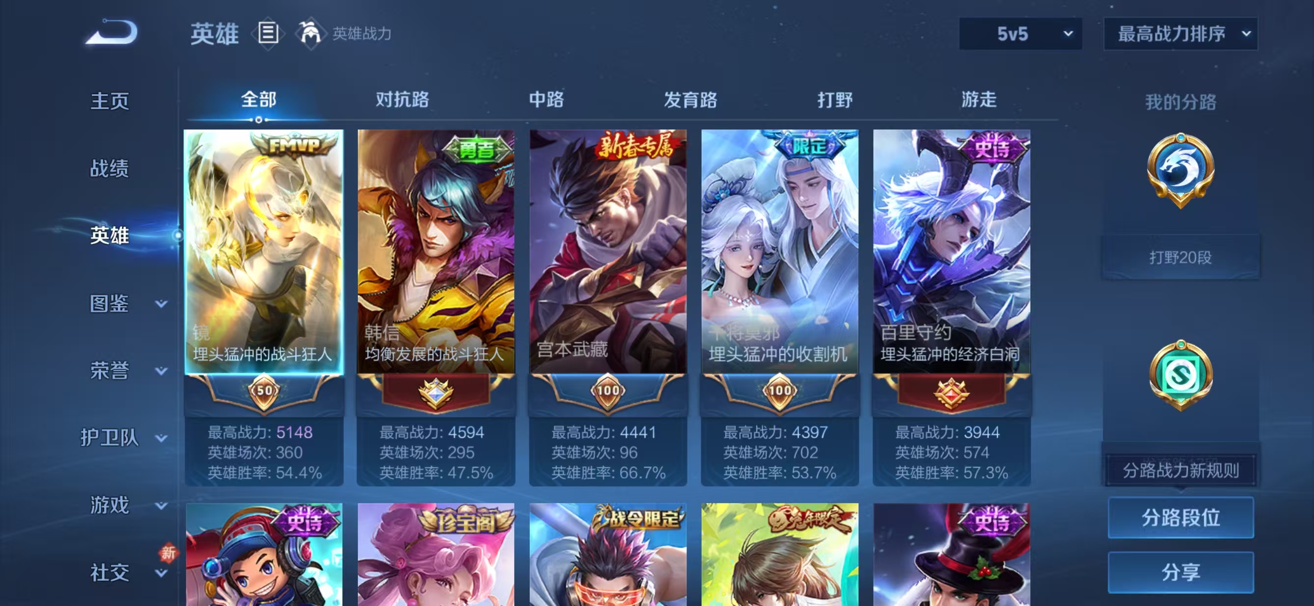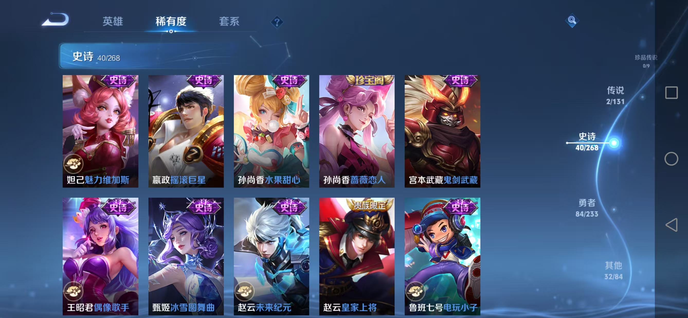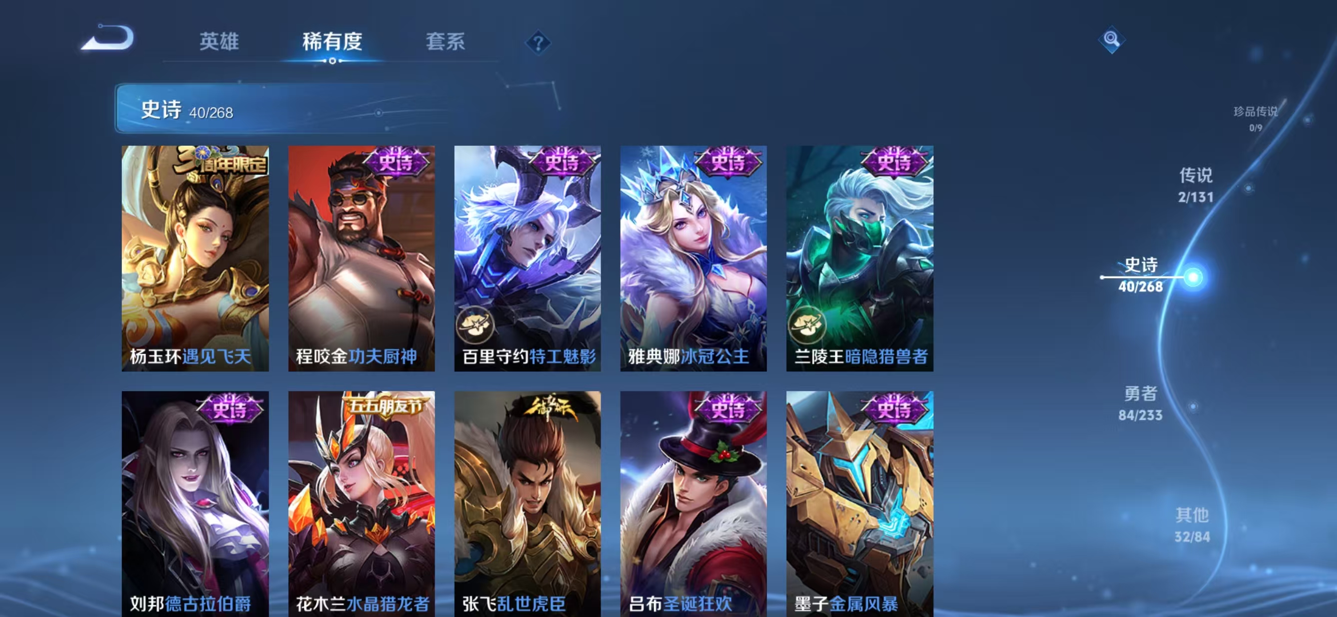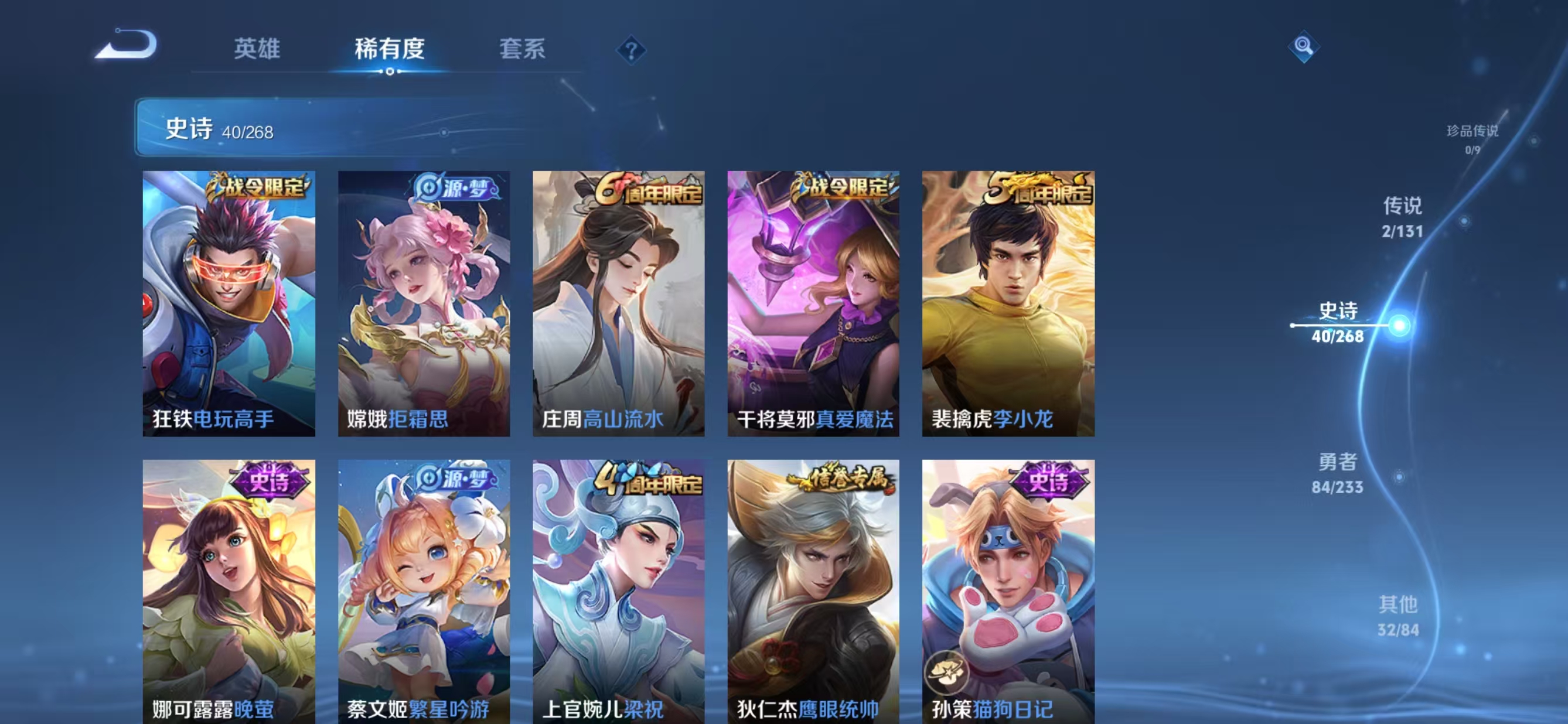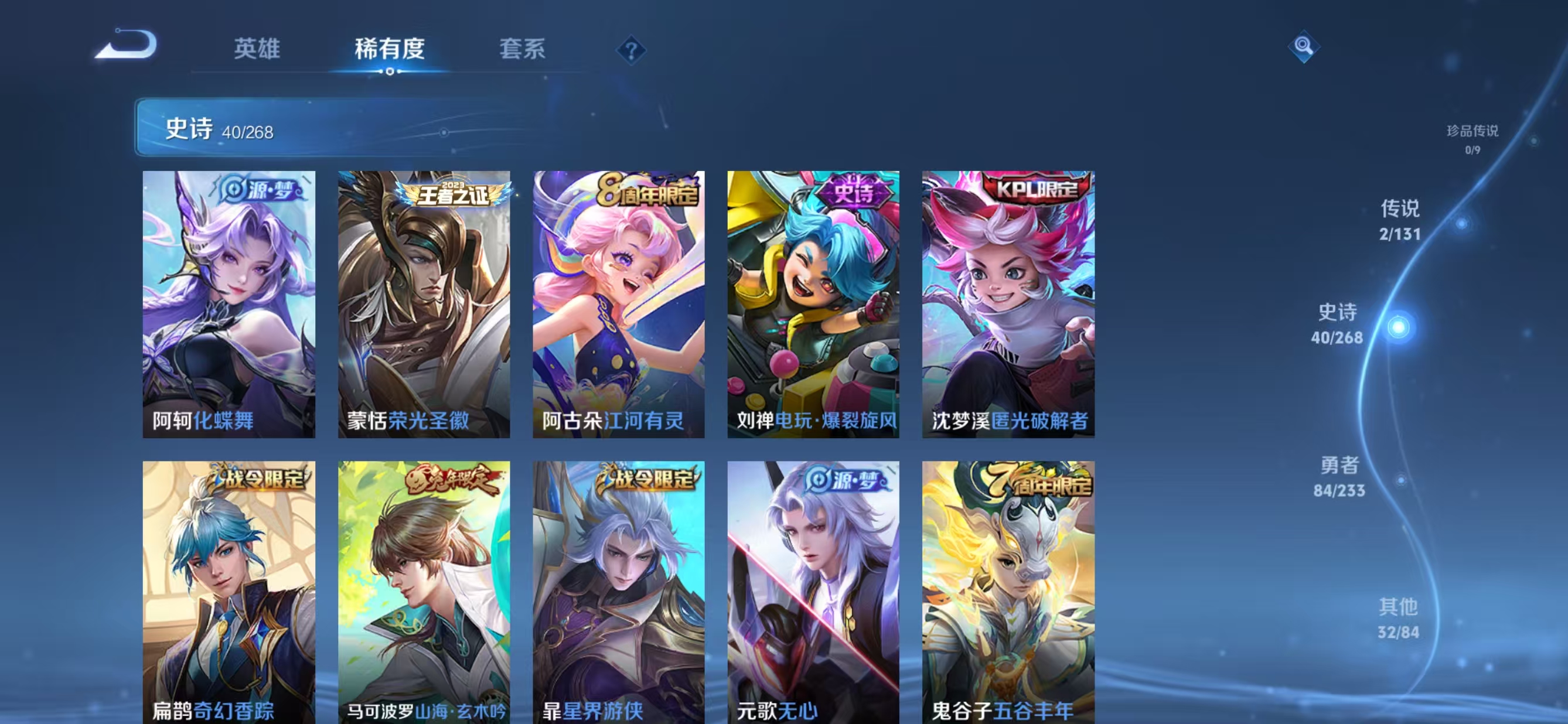 贵族等级:v5皮肤数:158传说品质2 生肖限定1 英雄数:121