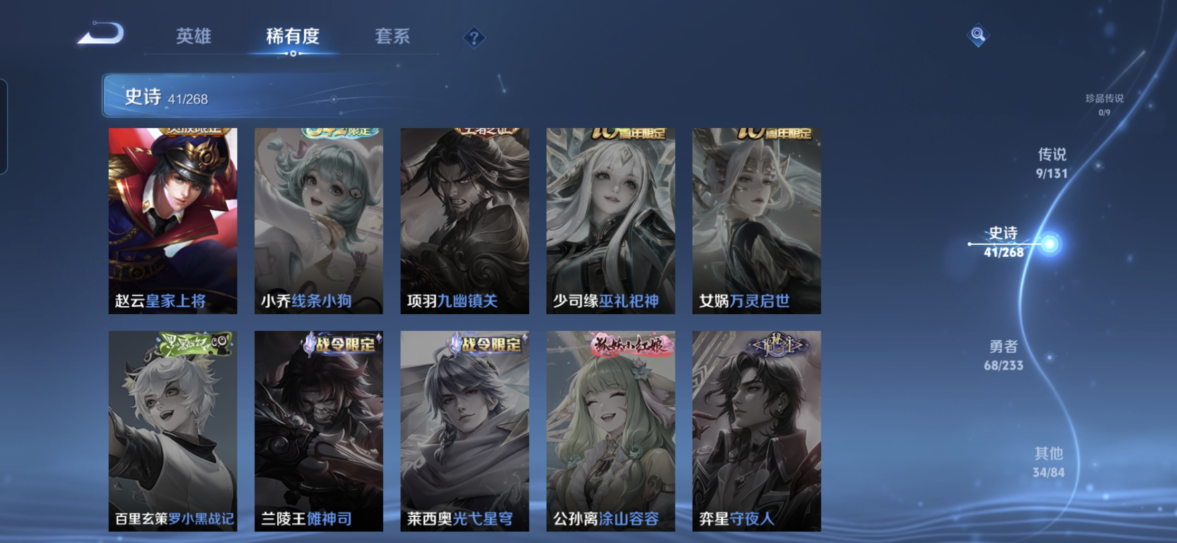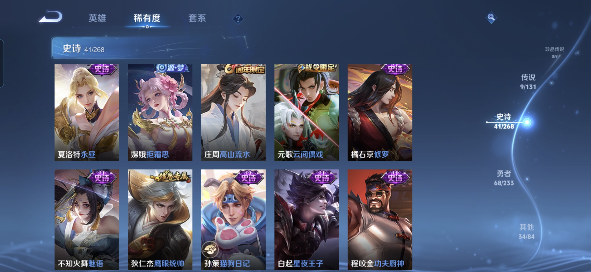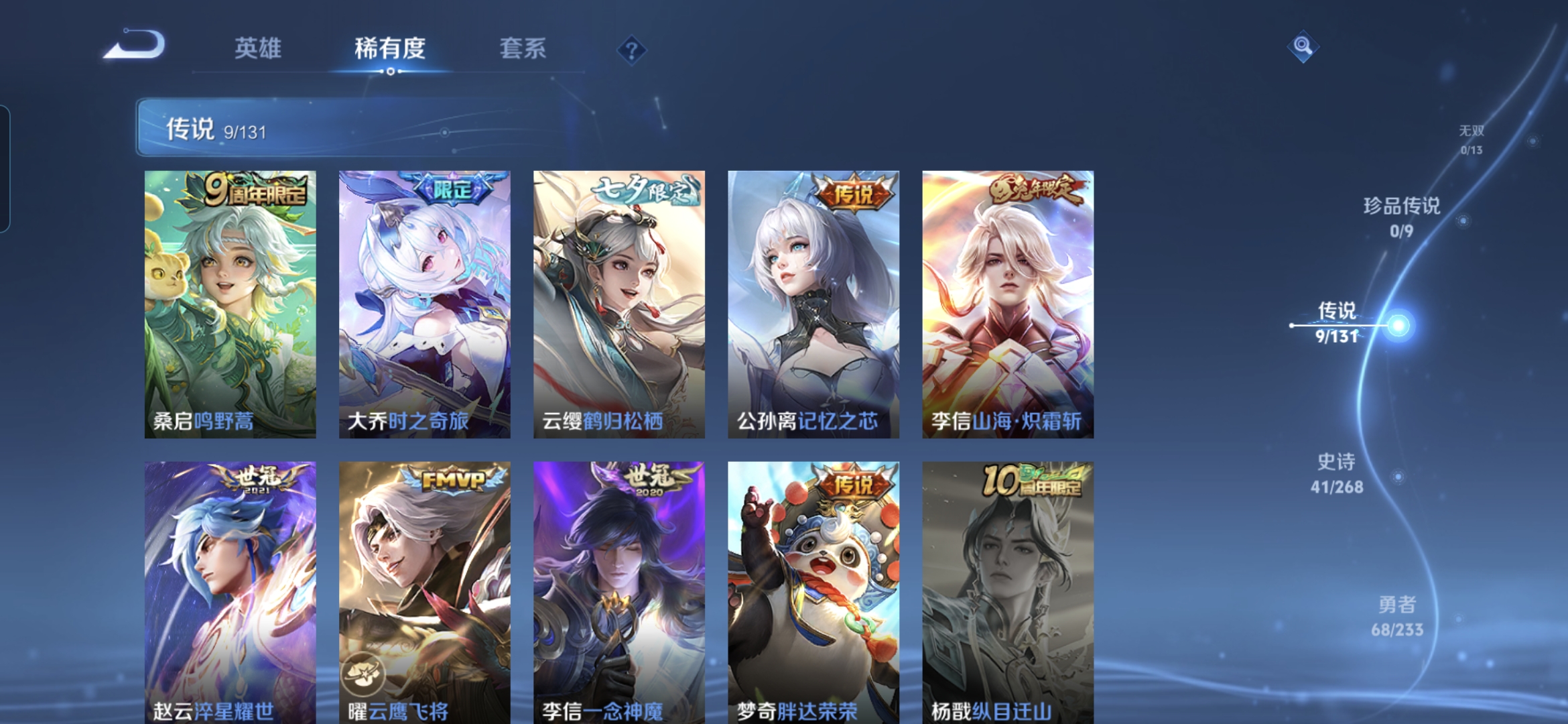 贵族等级:v7皮肤数:152传说品质9 生肖限定3 英雄数:125