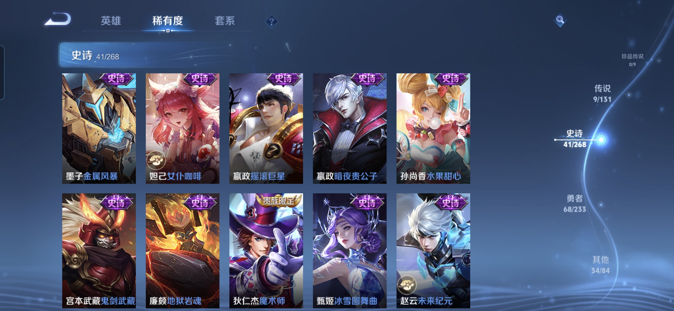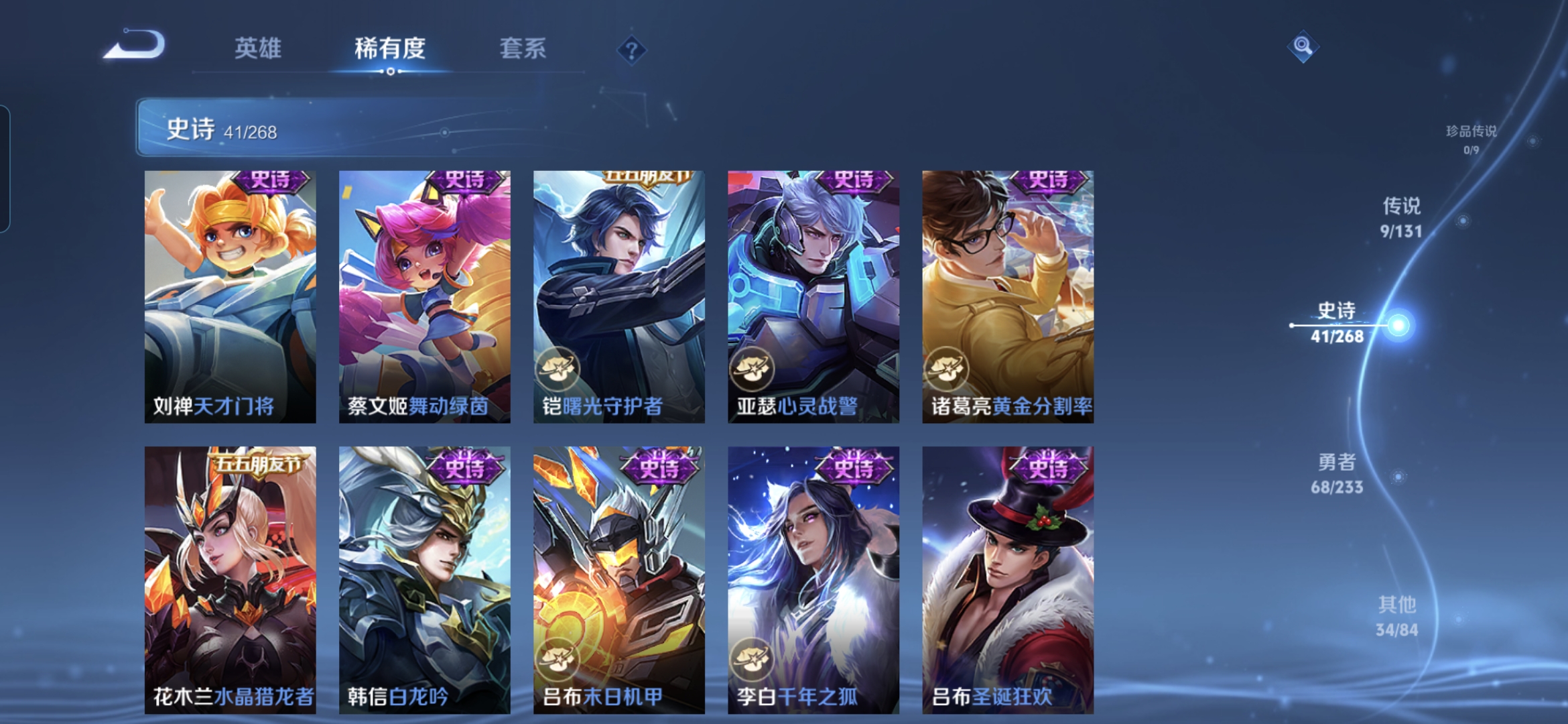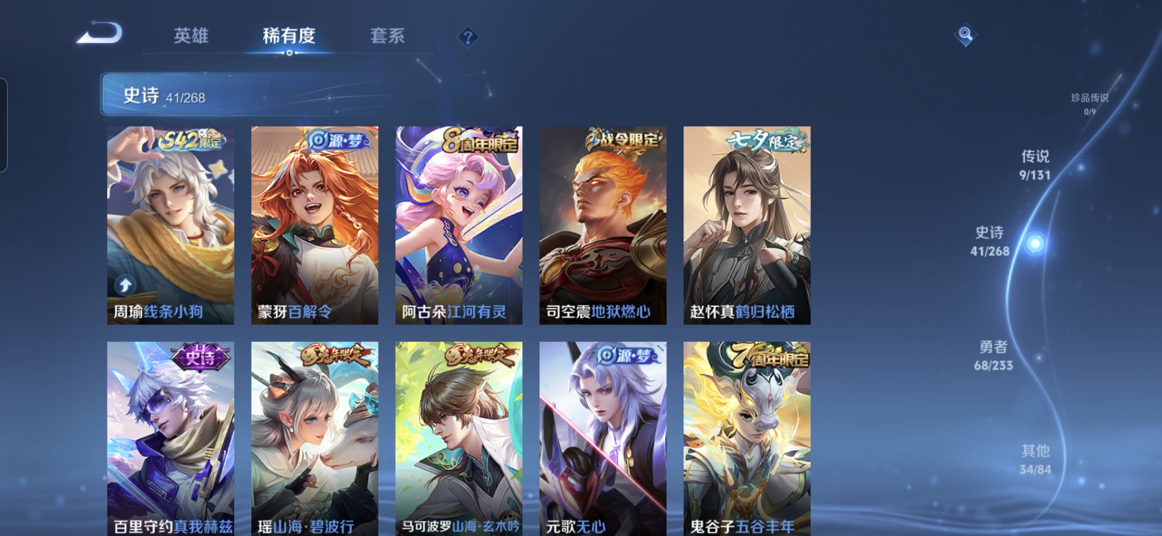 贵族等级:v7皮肤数:152传说品质9 生肖限定3 英雄数:125