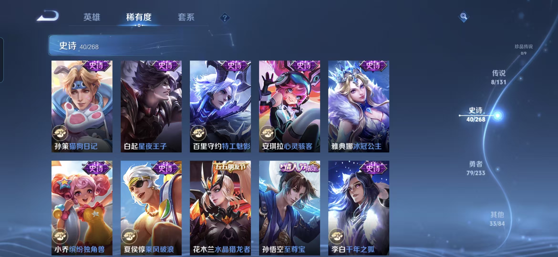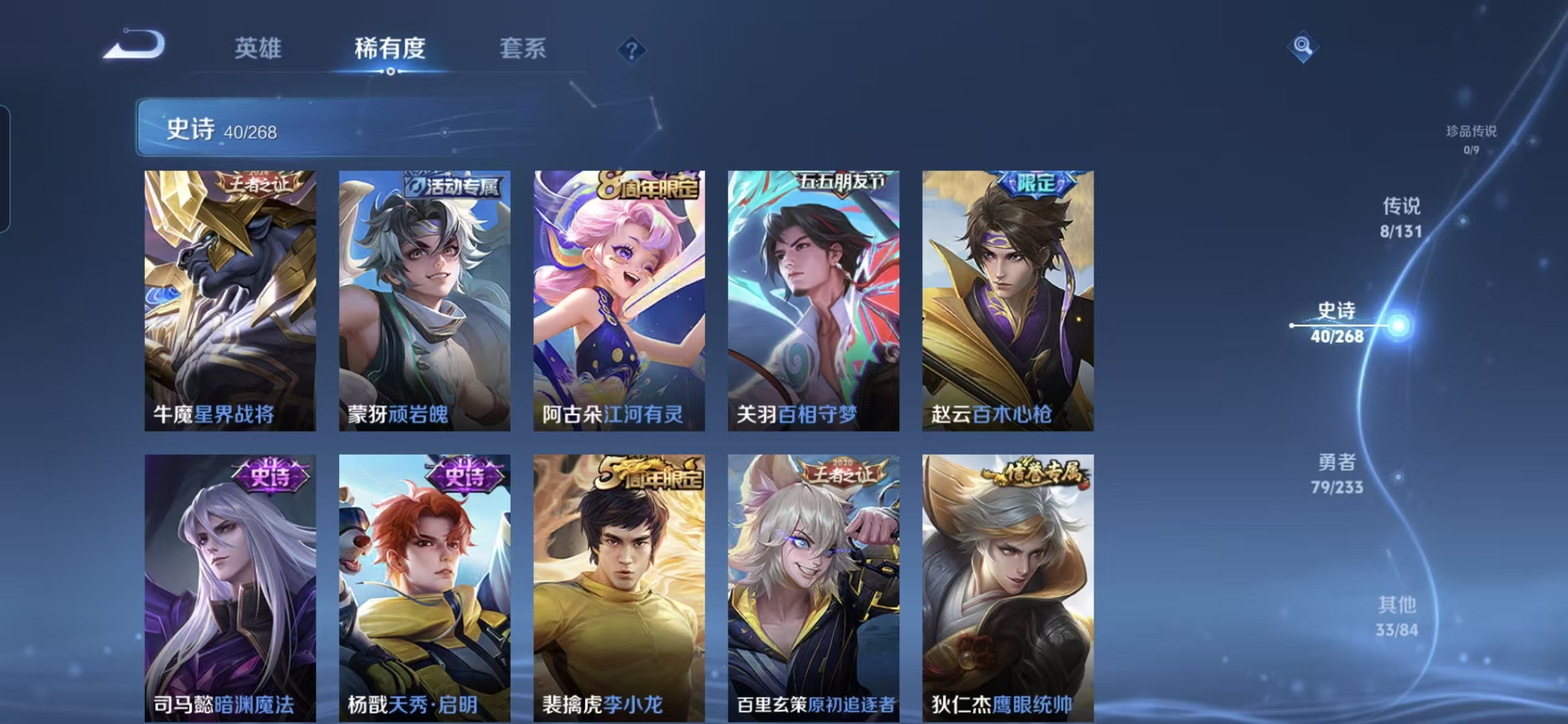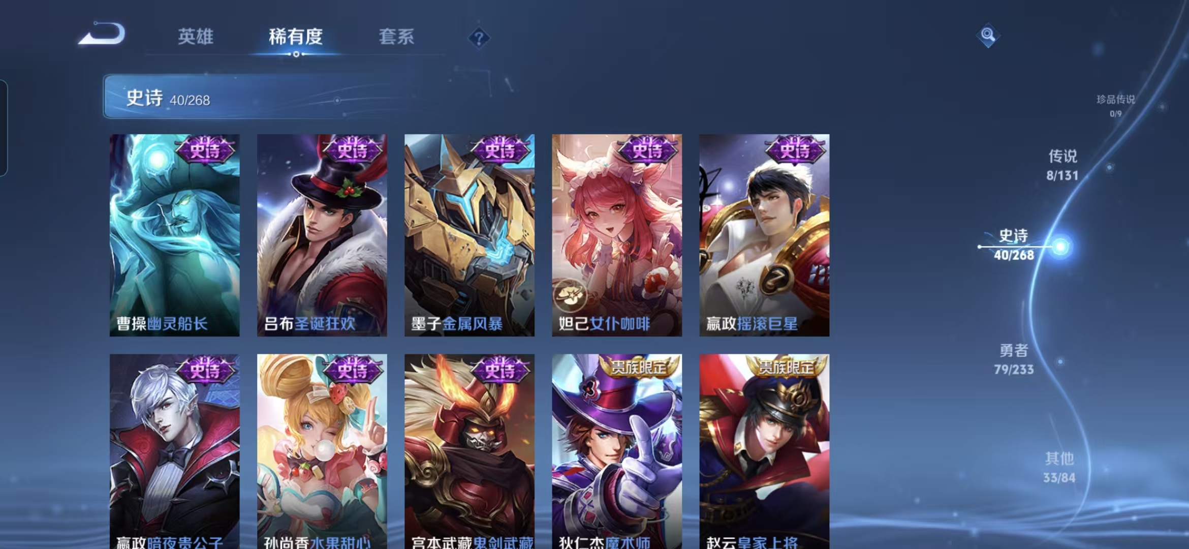贵族等级:v6皮肤数:160传说品质8 生肖限定1 情人节限定1 英雄数:127