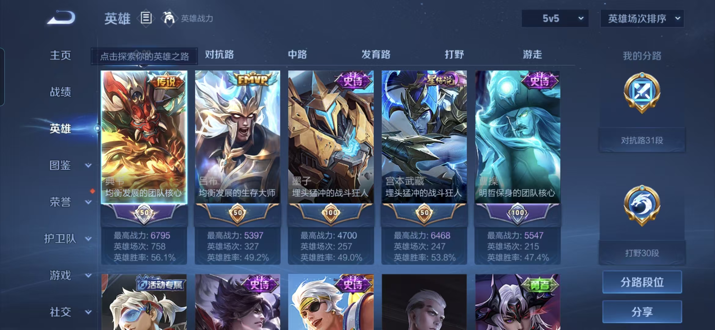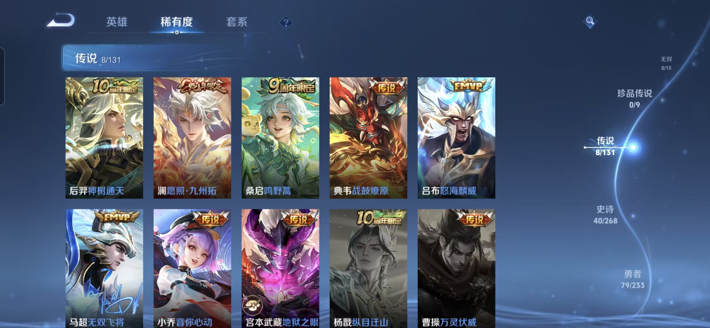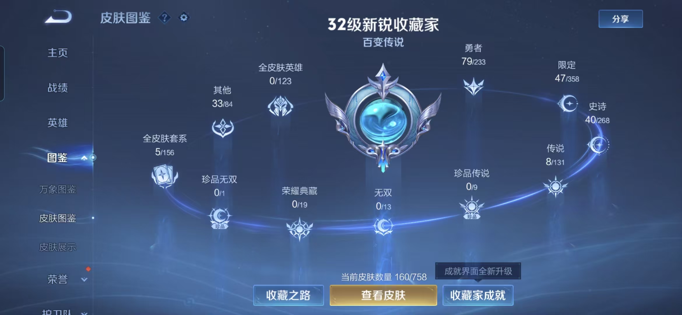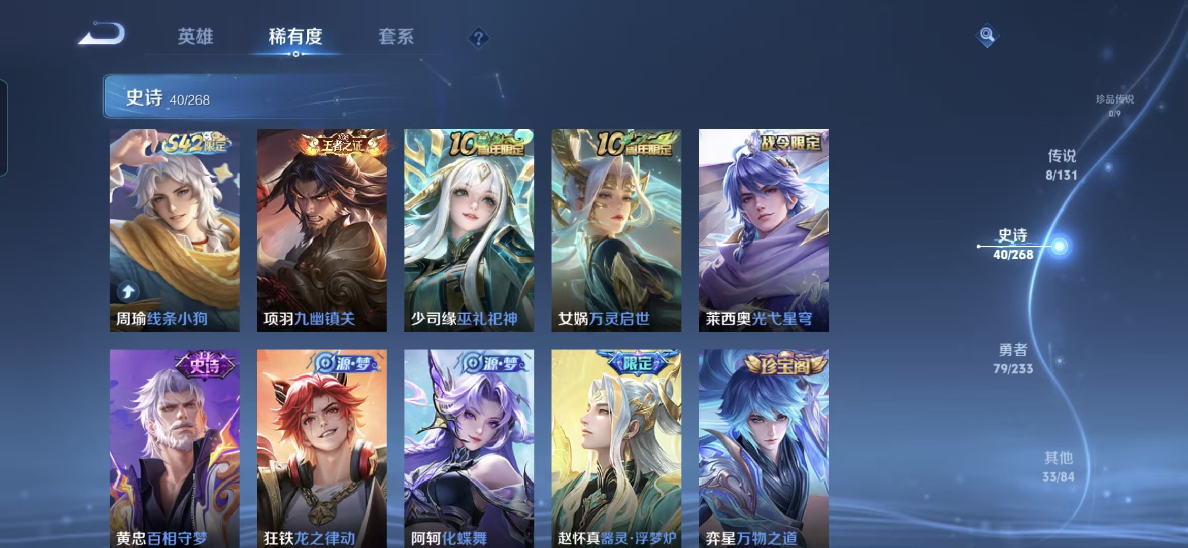 贵族等级:v6皮肤数:160传说品质8 生肖限定1 情人节限定1 英雄数:127