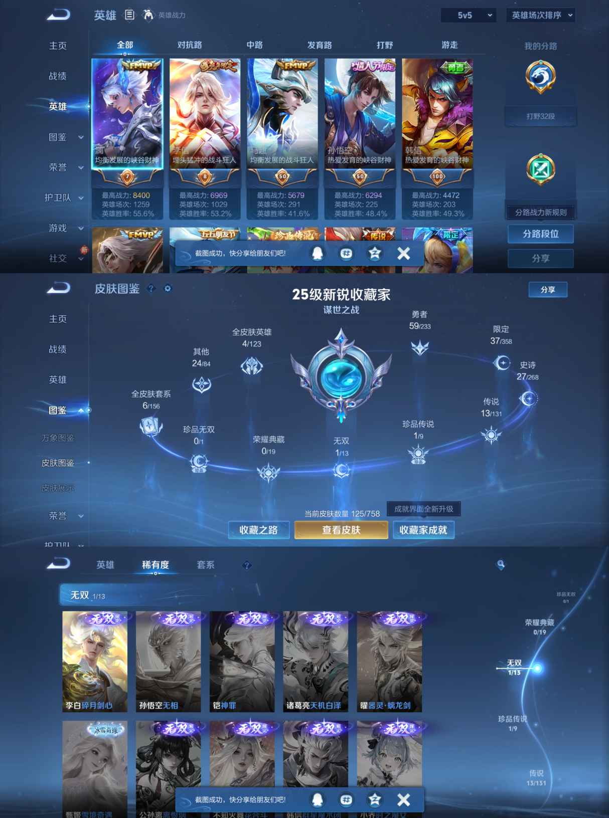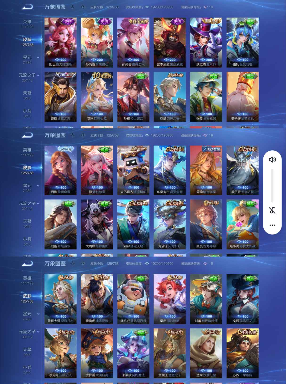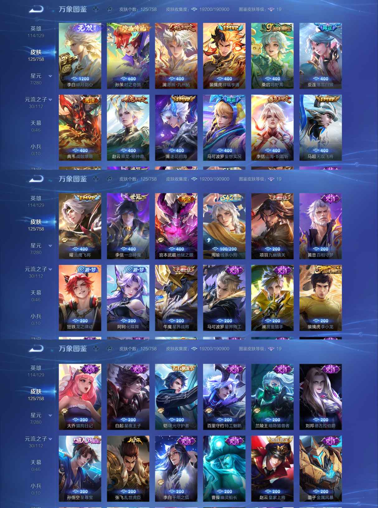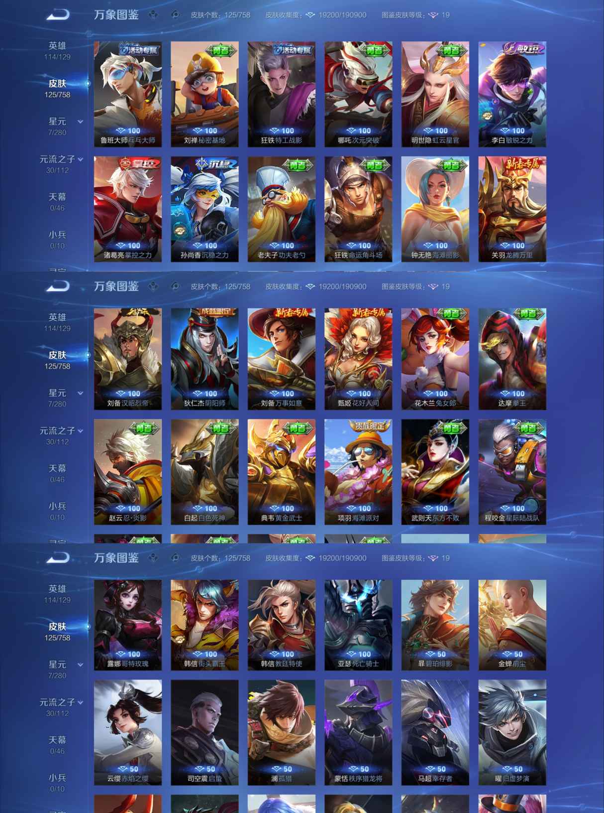 贵族等级:v7皮肤数:125传说品质13 生肖限定3 情人节限定1 无双1 珍品传说1 英雄数:114