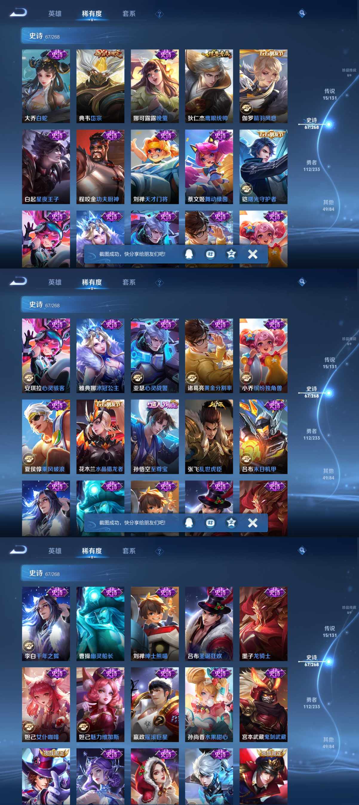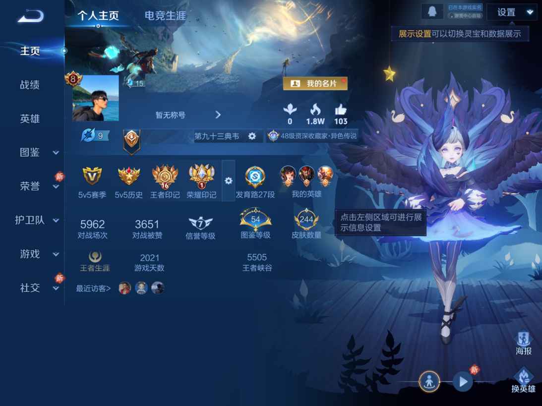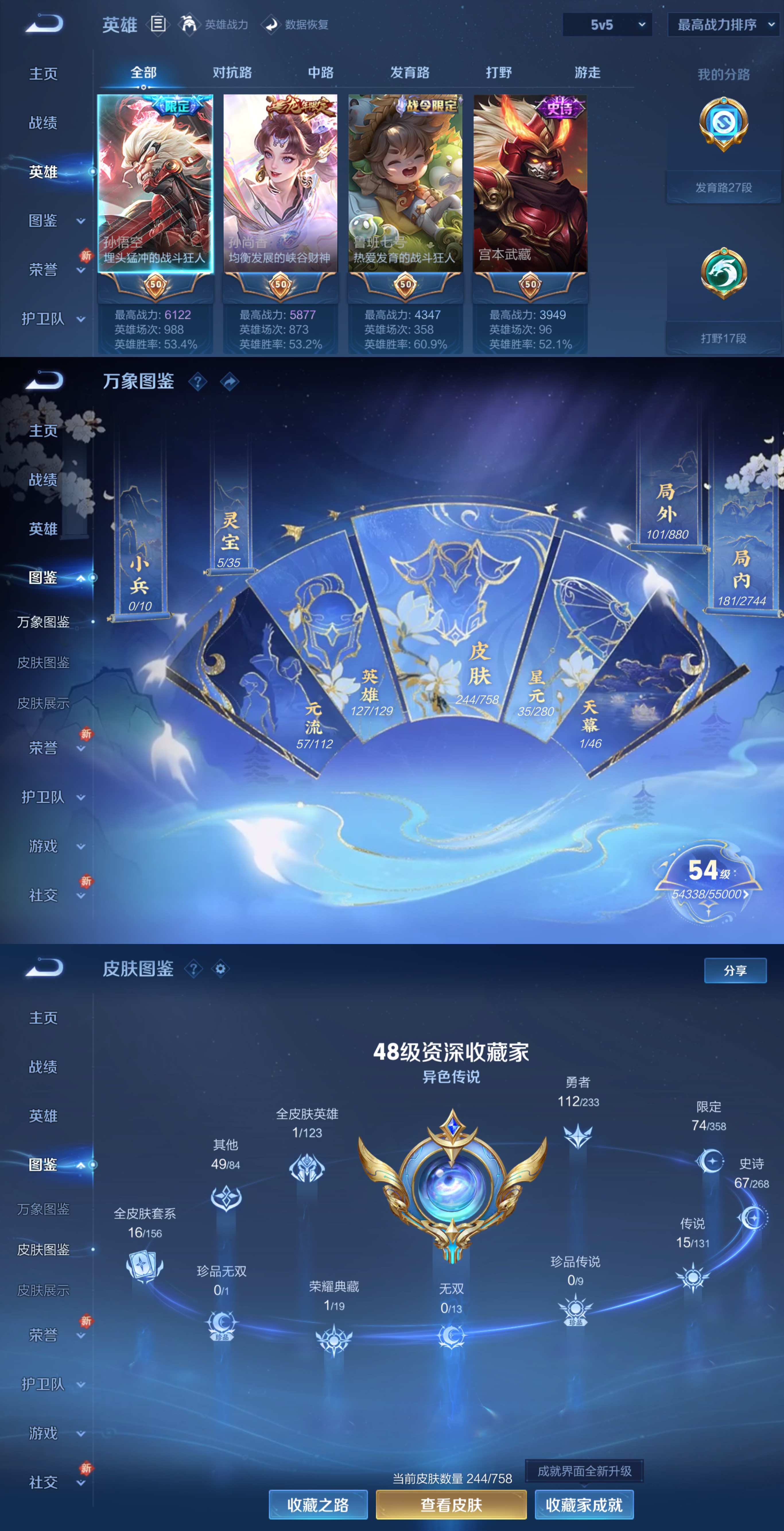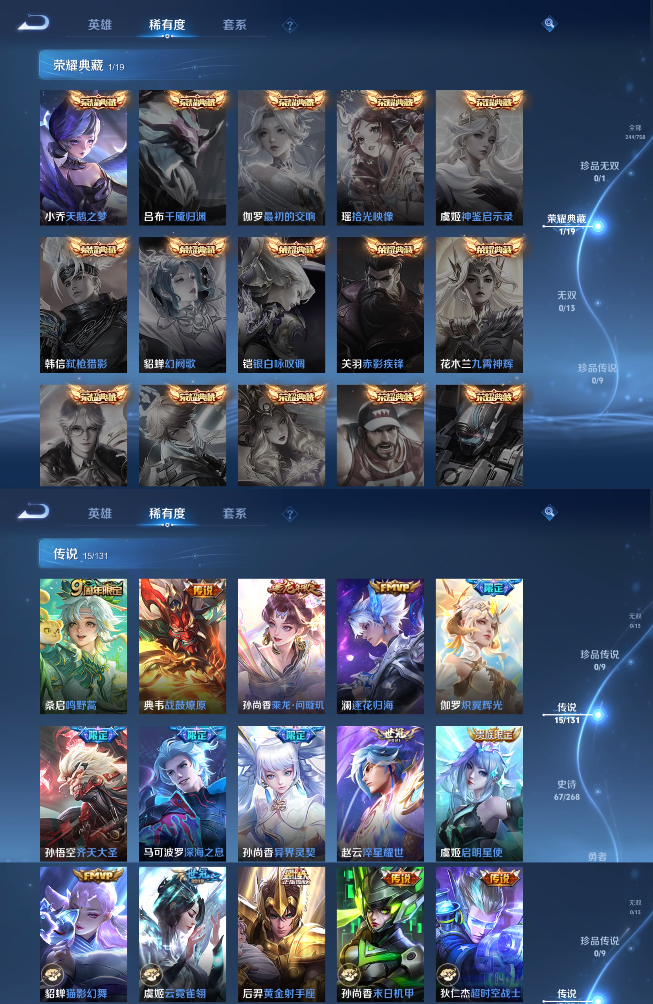 贵族等级:v8皮肤数:244传说品质15 生肖限定3 情人节限定1 荣耀典藏1 英雄数:127
