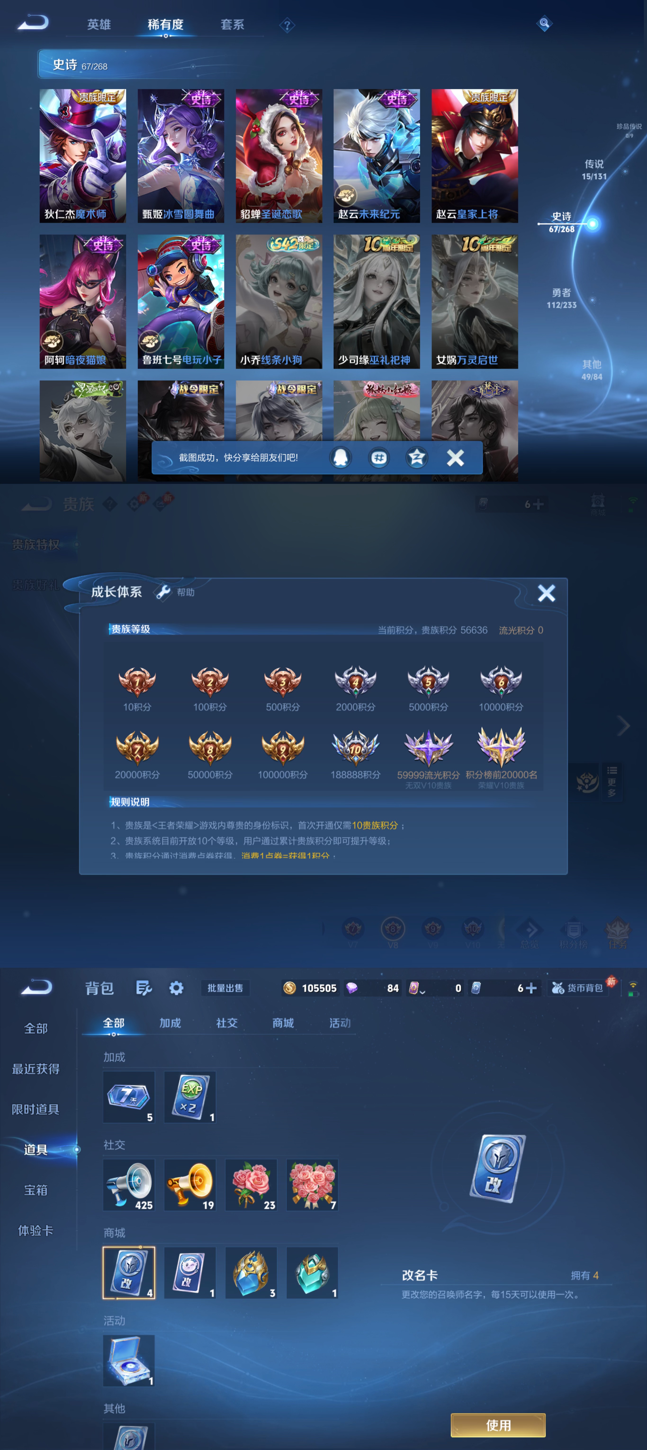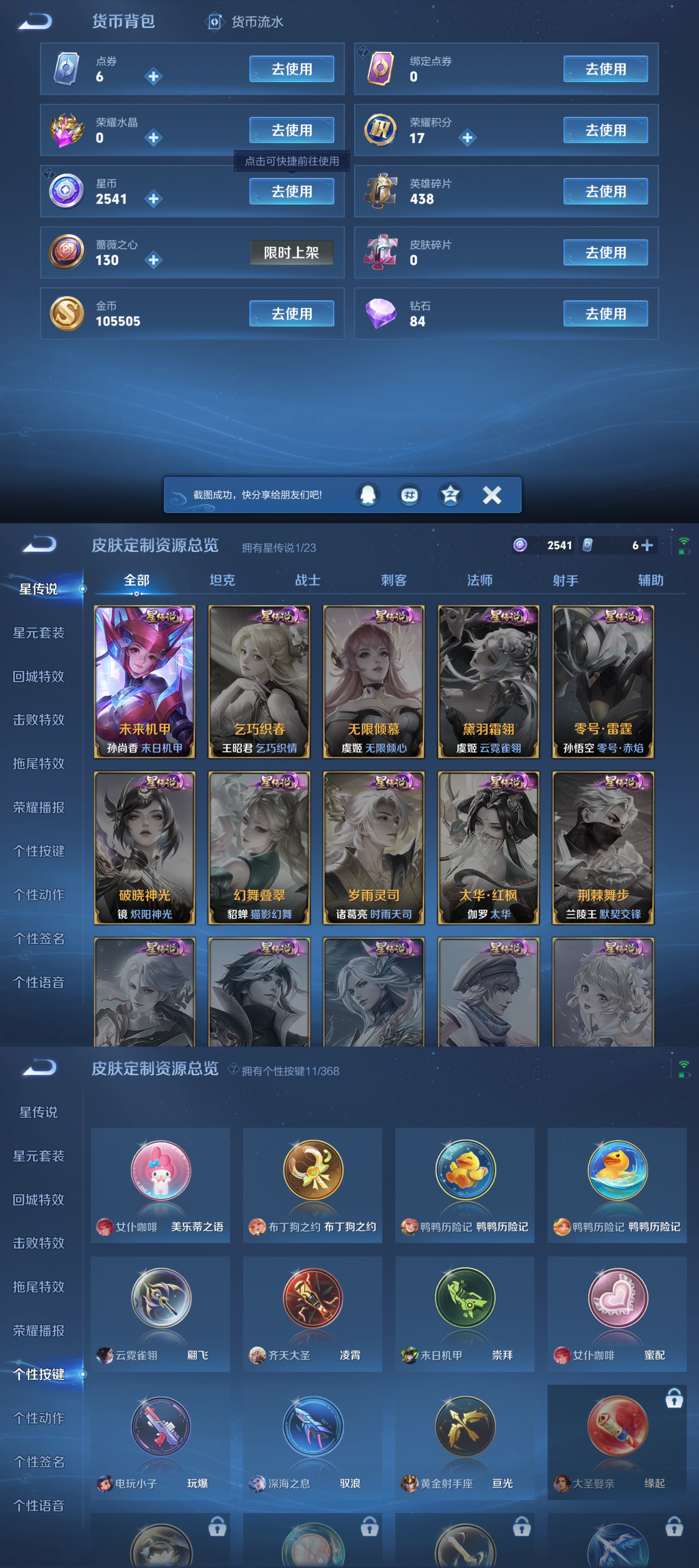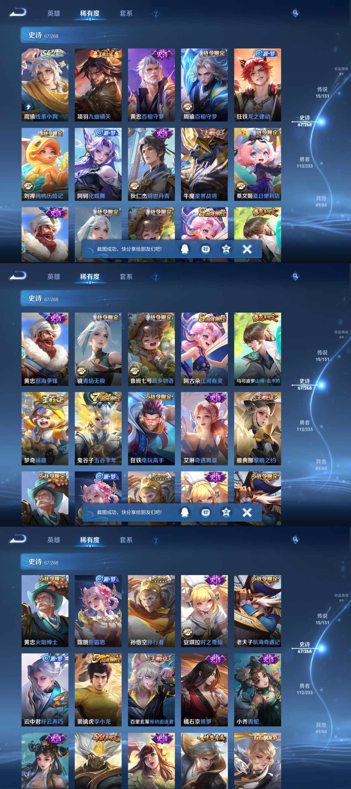 贵族等级:v8皮肤数:244传说品质15 生肖限定3 情人节限定1 荣耀典藏1 英雄数:127