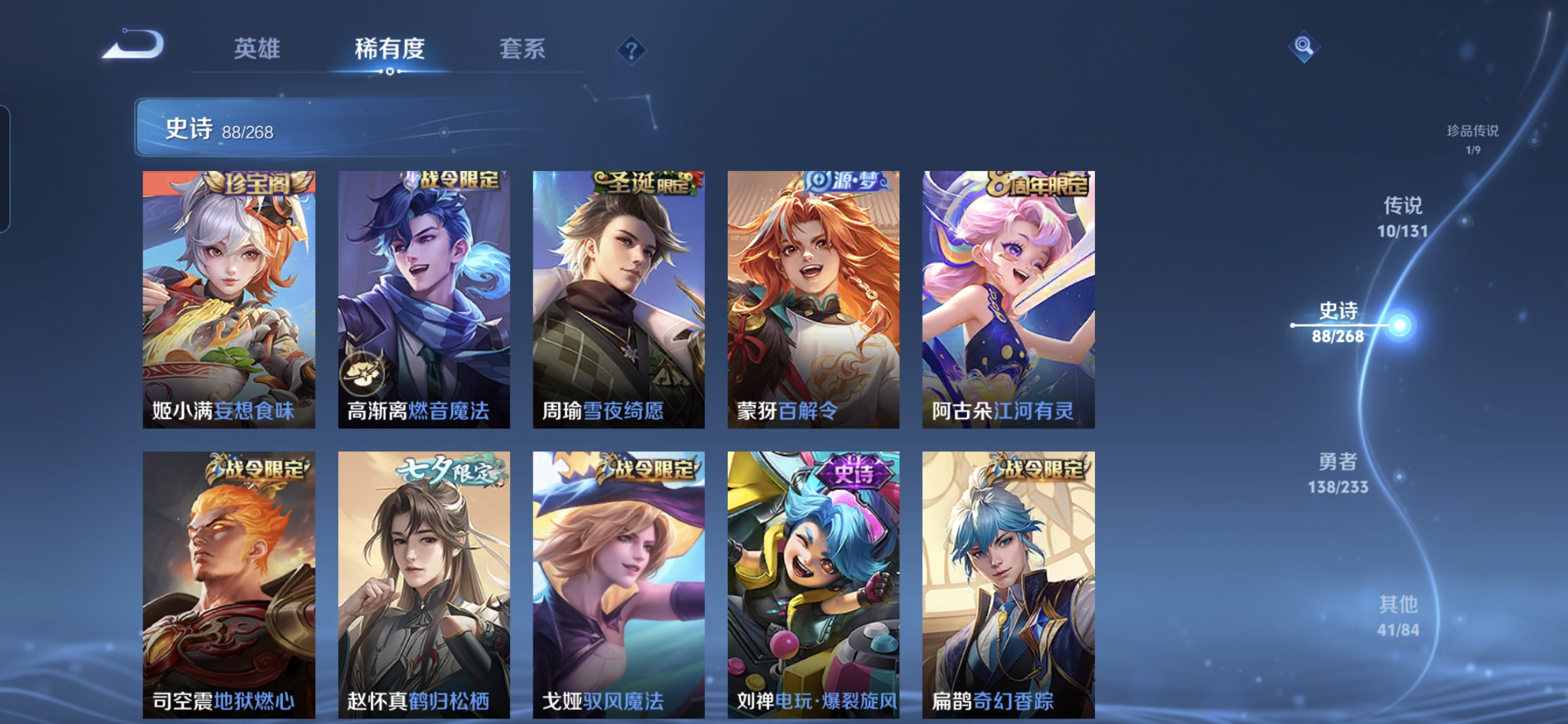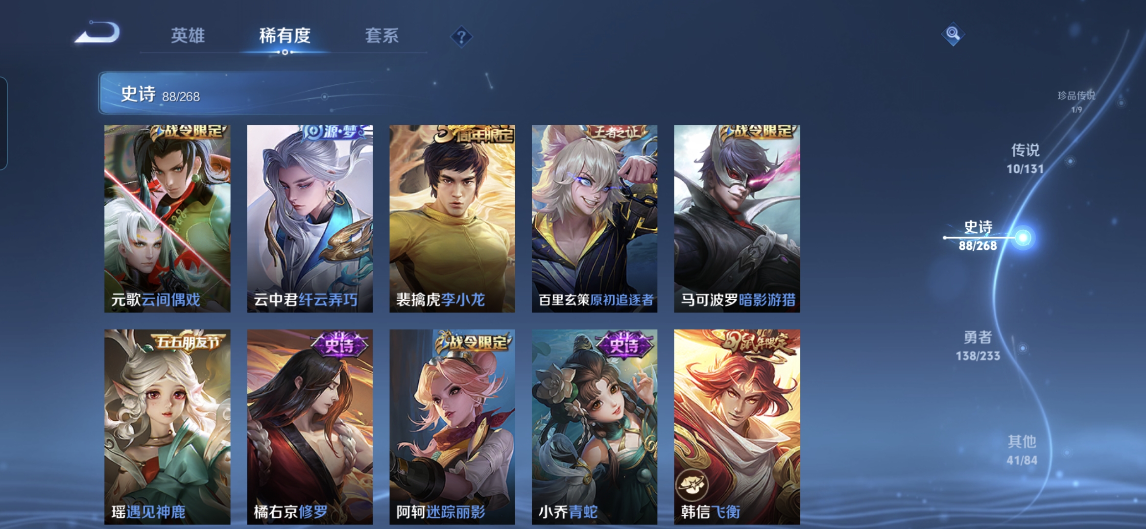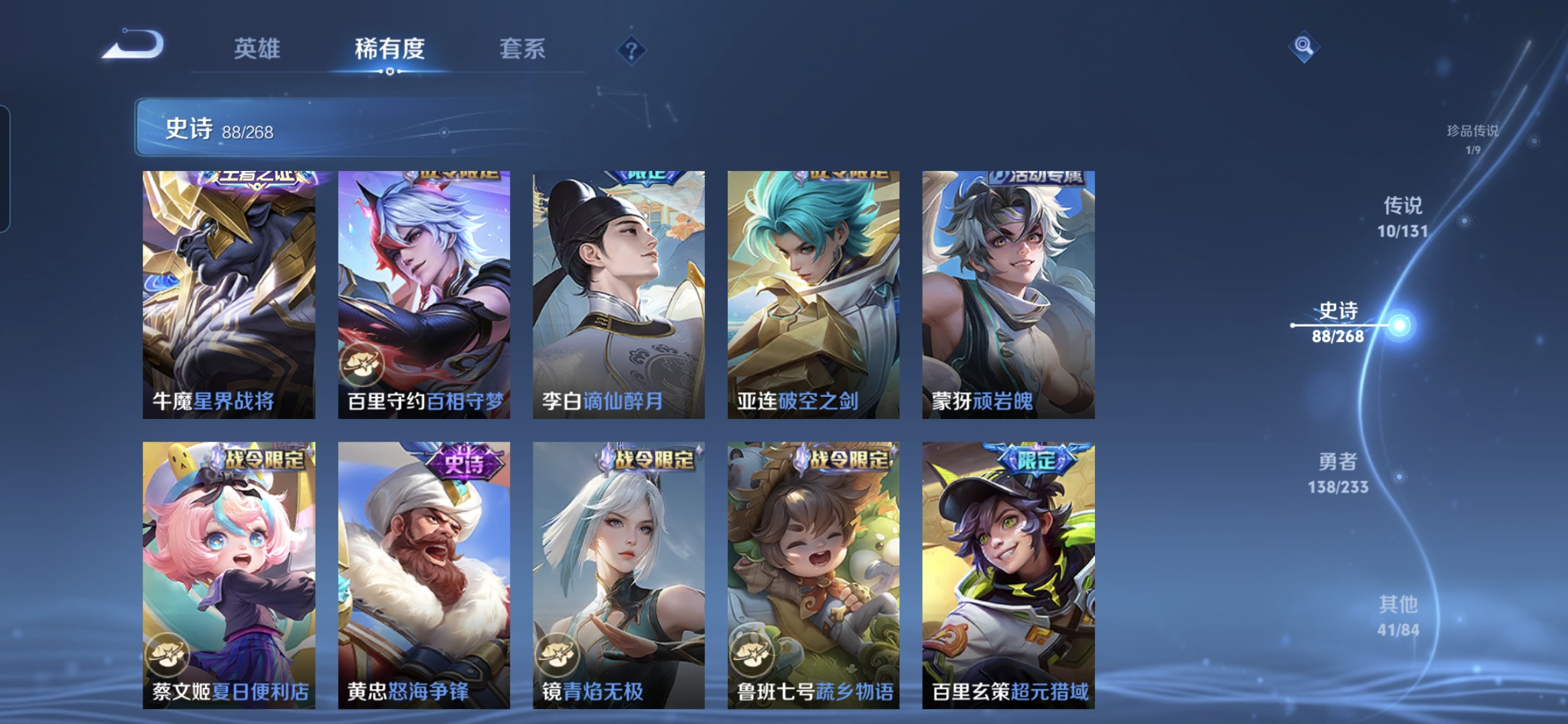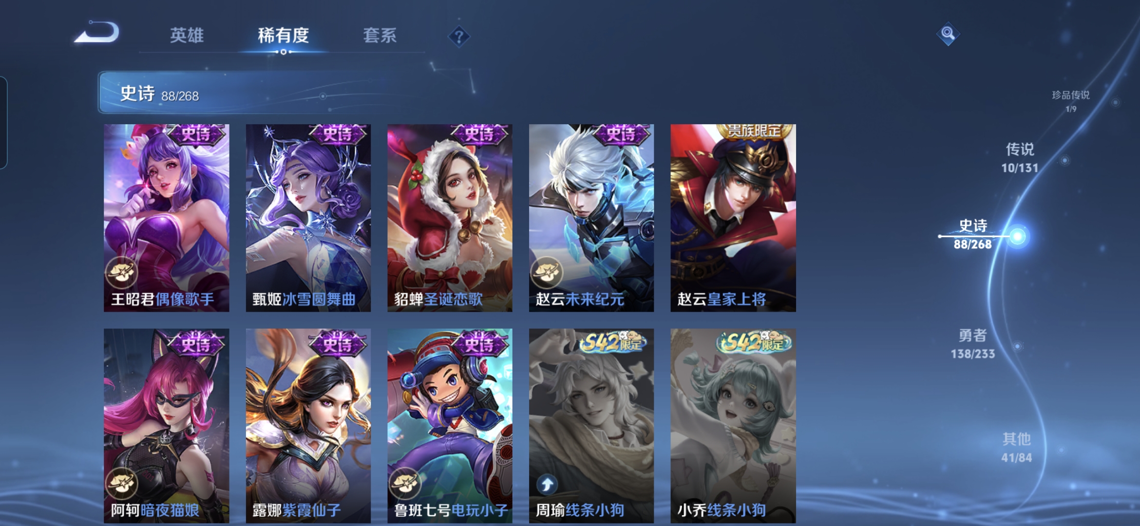 贵族等级:v7皮肤数:279传说品质10 生肖限定4 荣耀典藏1 珍品传说1 英雄数:127