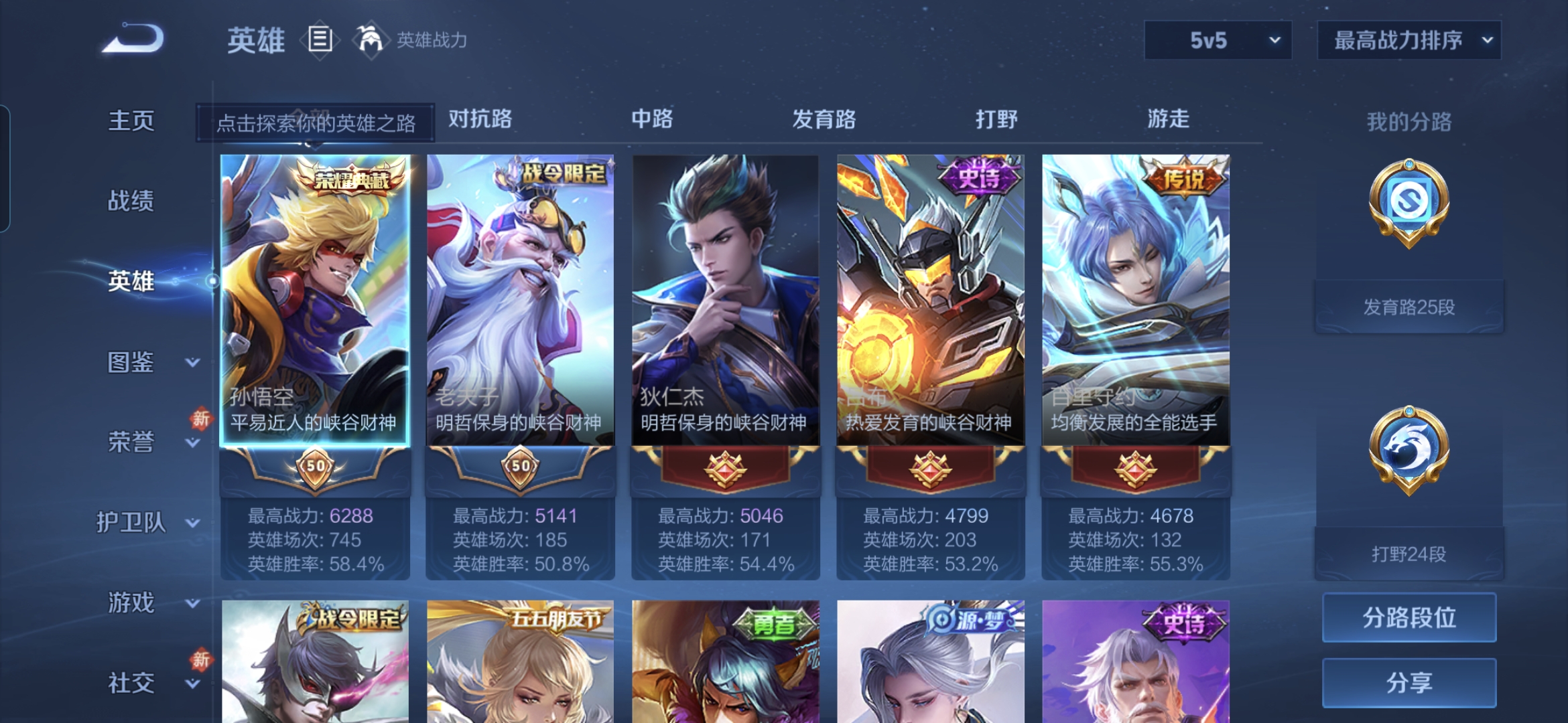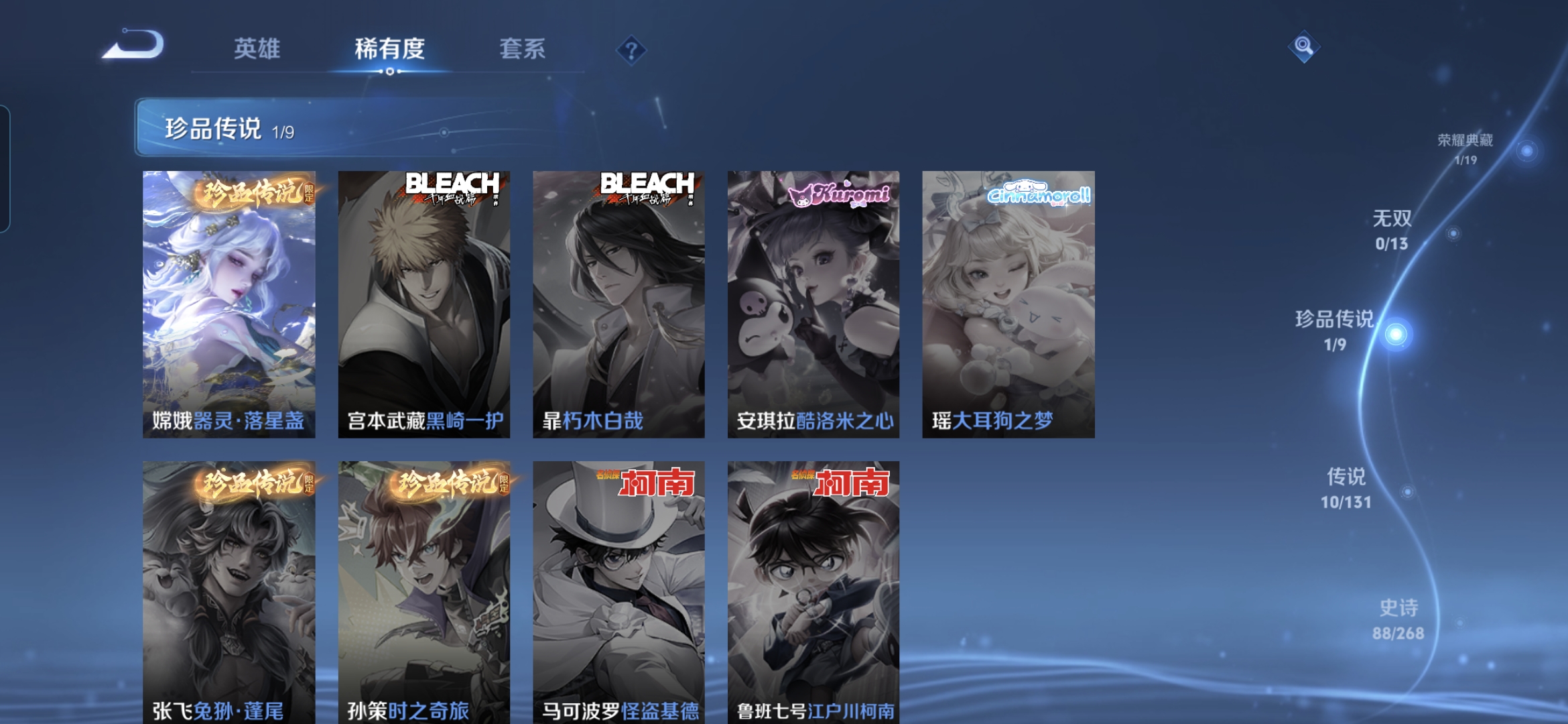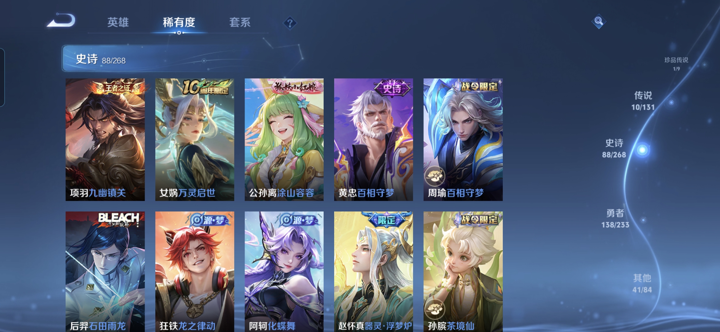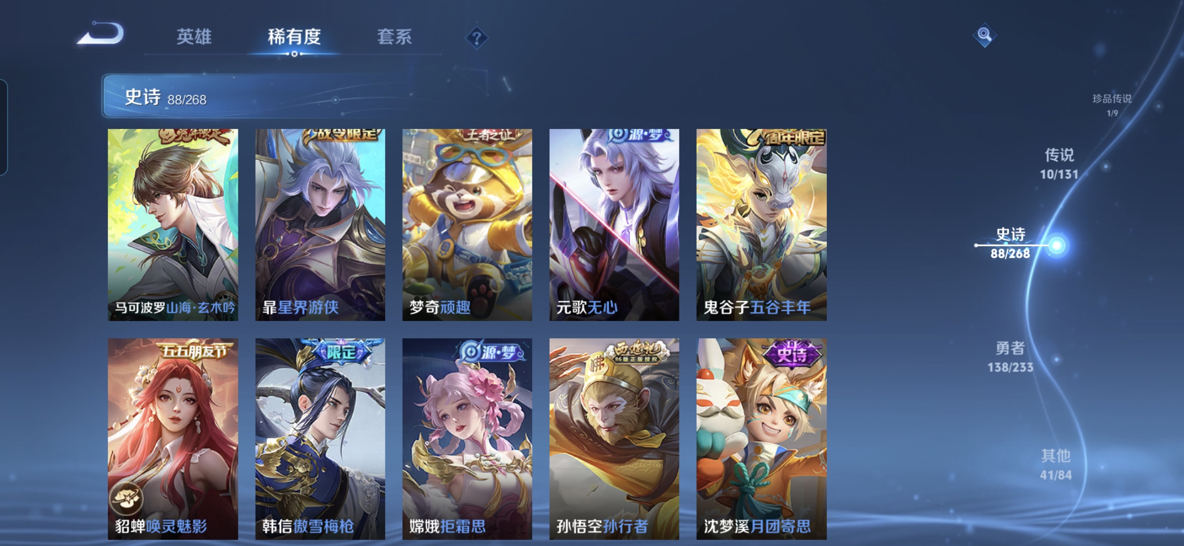贵族等级:v7皮肤数:279传说品质10 生肖限定4 荣耀典藏1 珍品传说1 英雄数:127