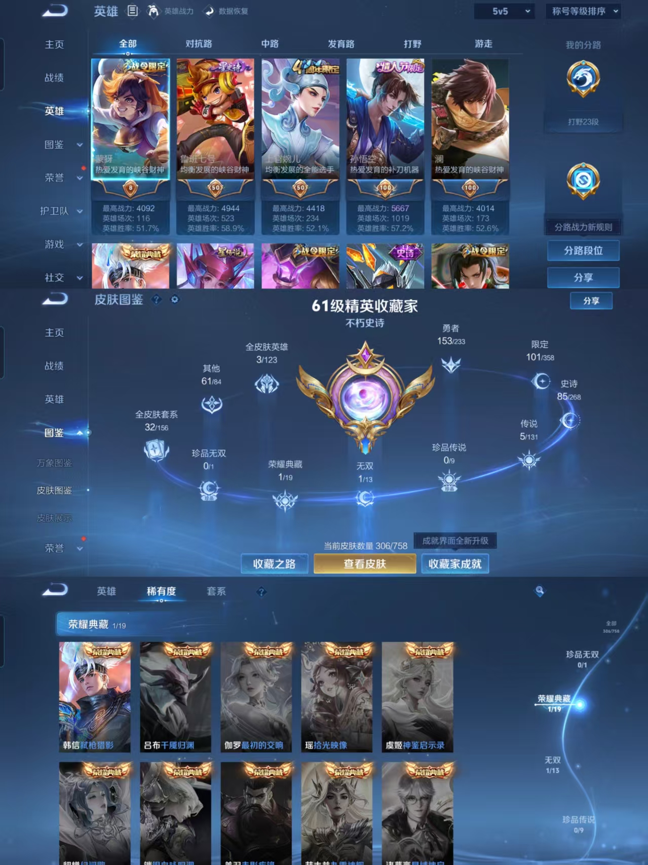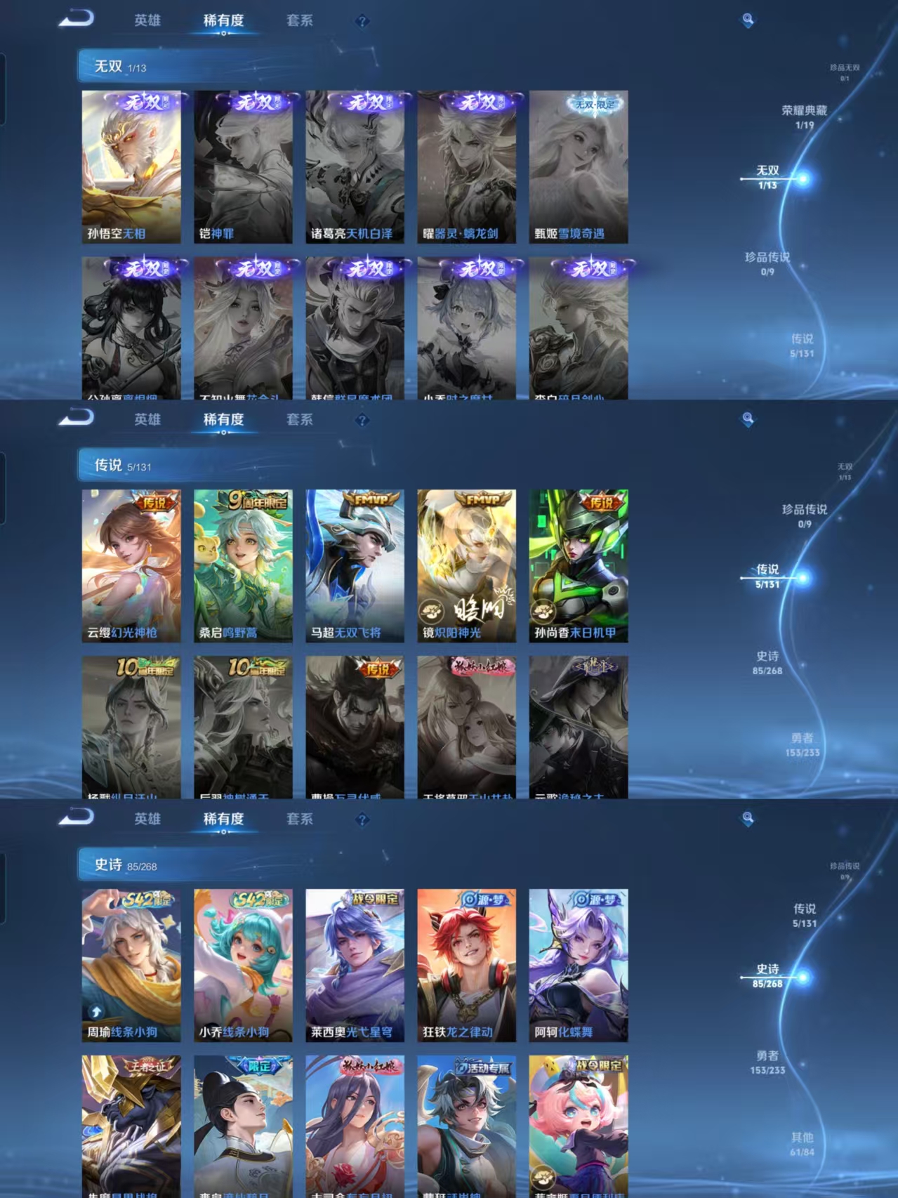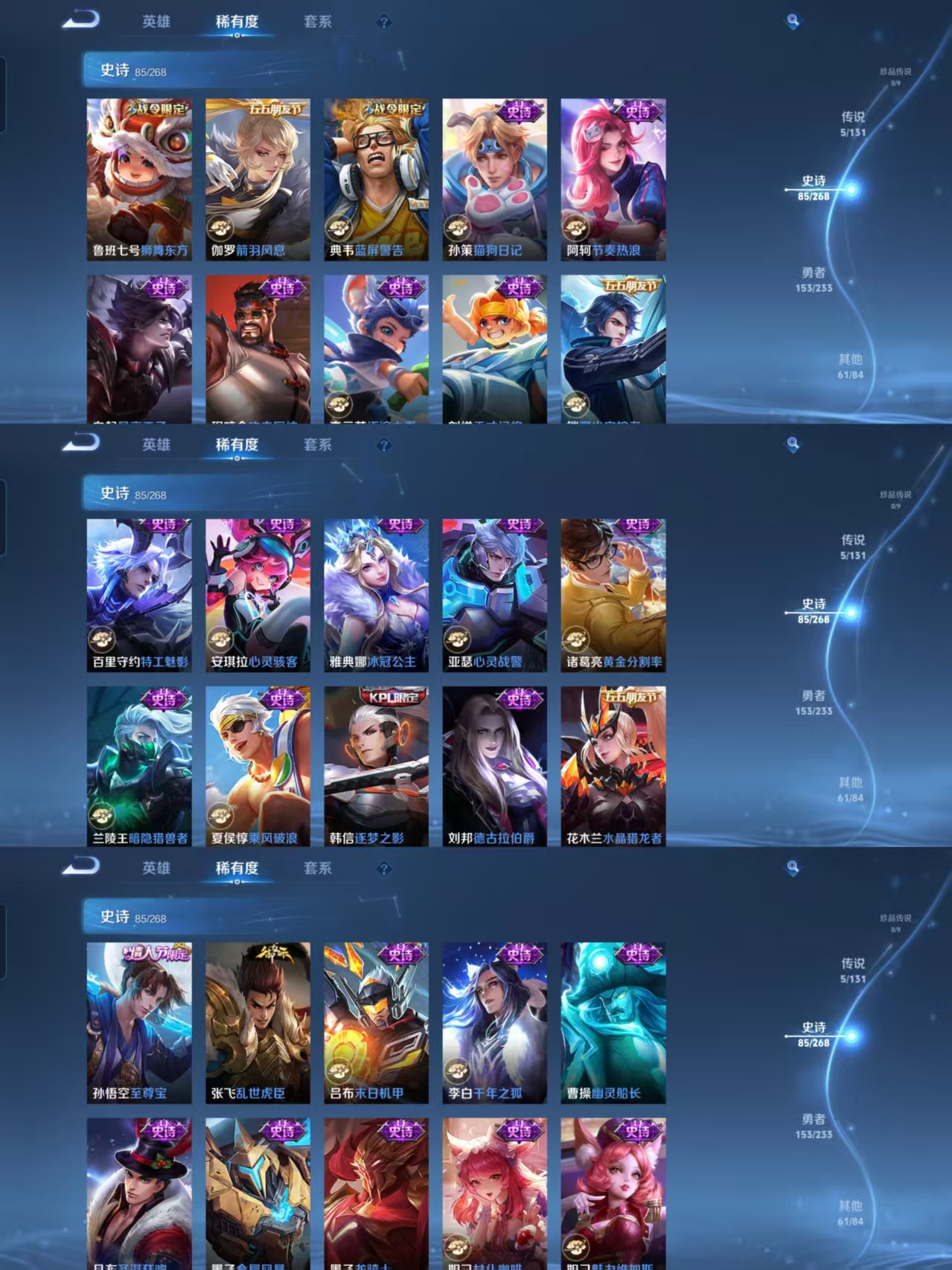 贵族等级:v7皮肤数:306情人节限定1 无双1 传说品质5 生肖限定1 荣耀典藏1 英雄数:127