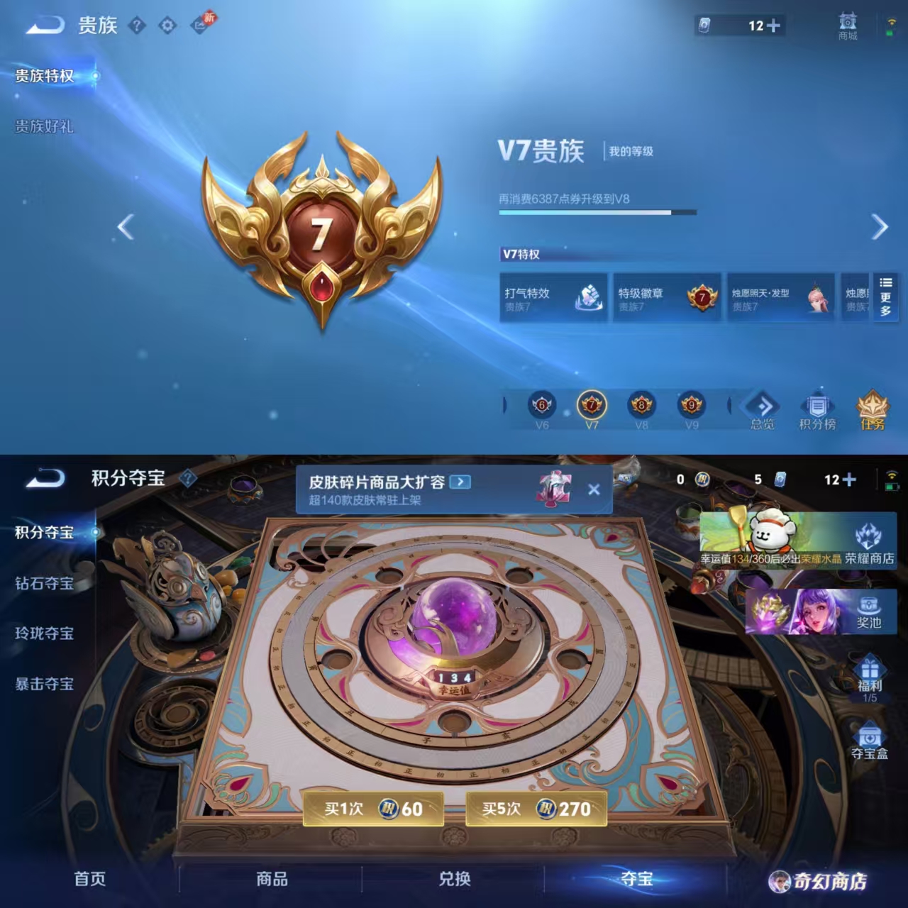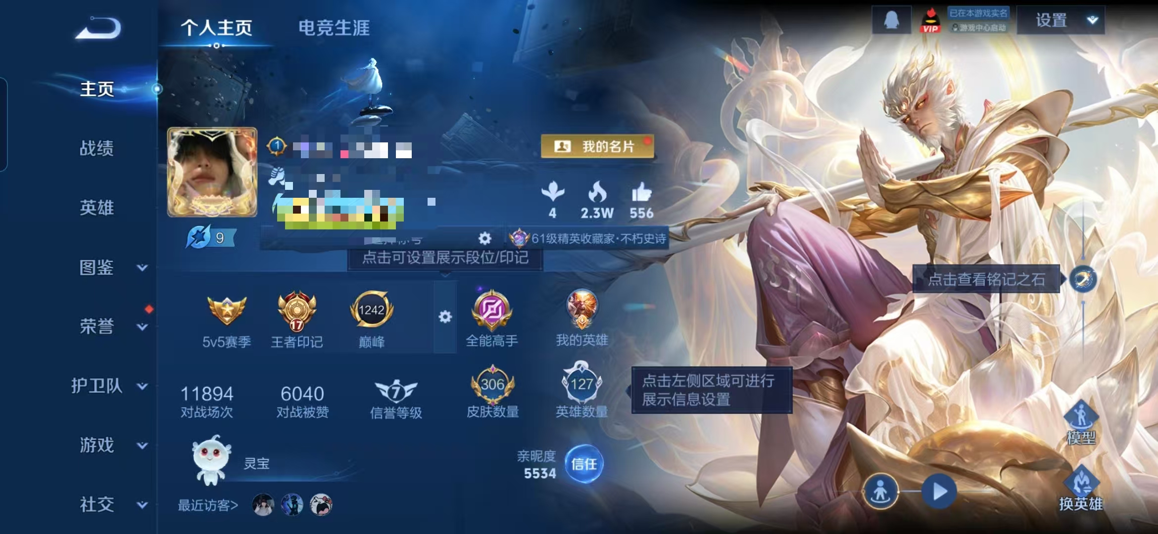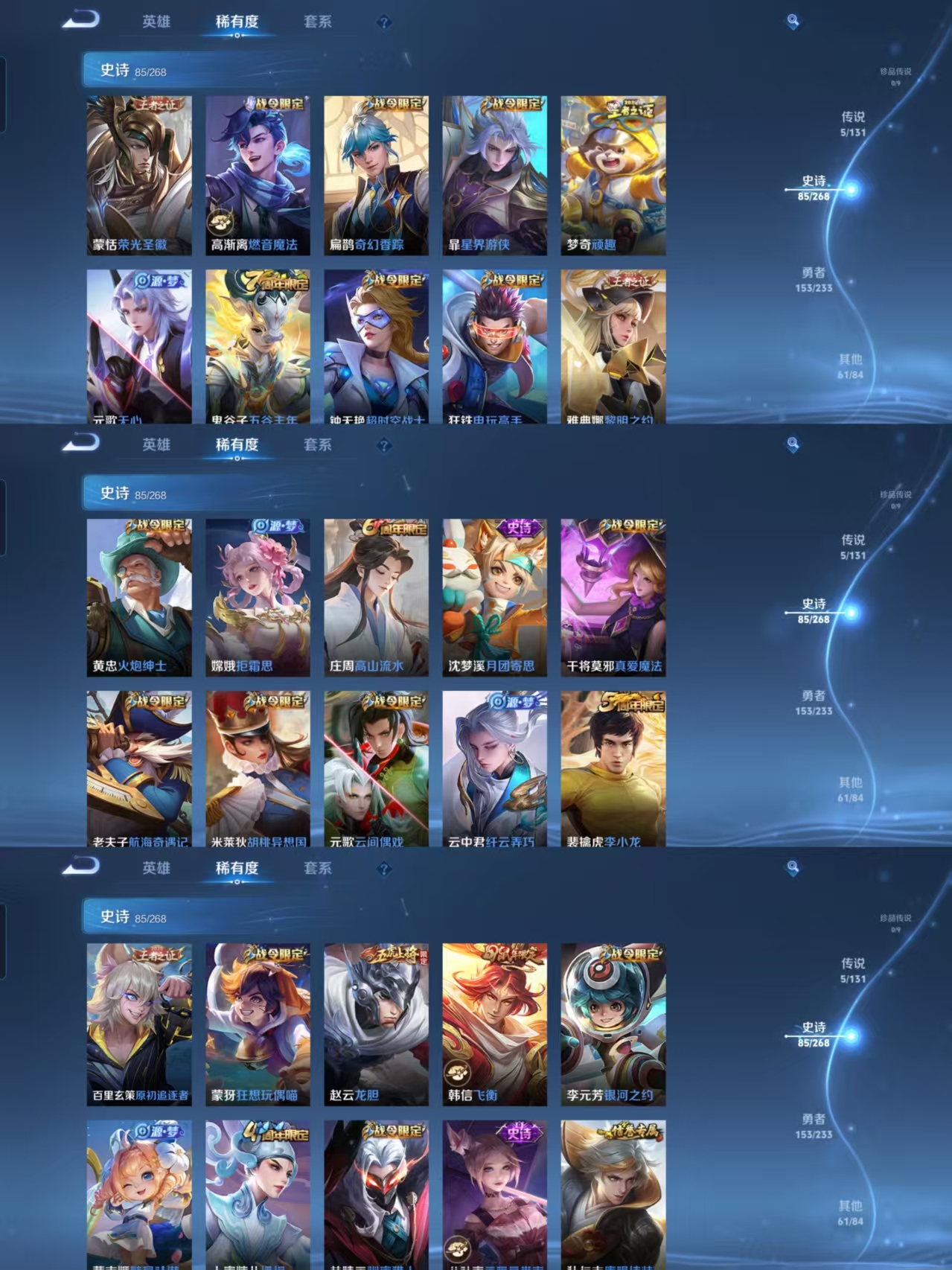 贵族等级:v7皮肤数:306情人节限定1 无双1 传说品质5 生肖限定1 荣耀典藏1 英雄数:127