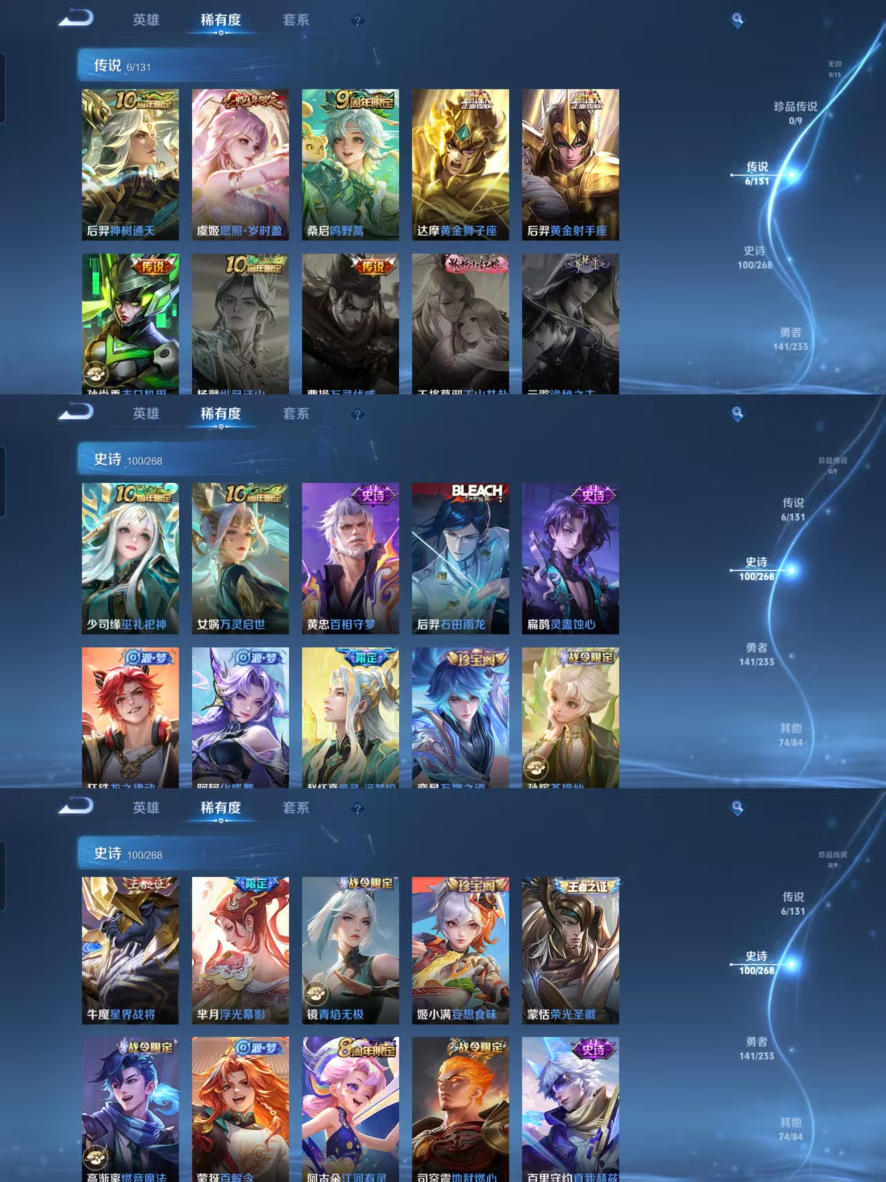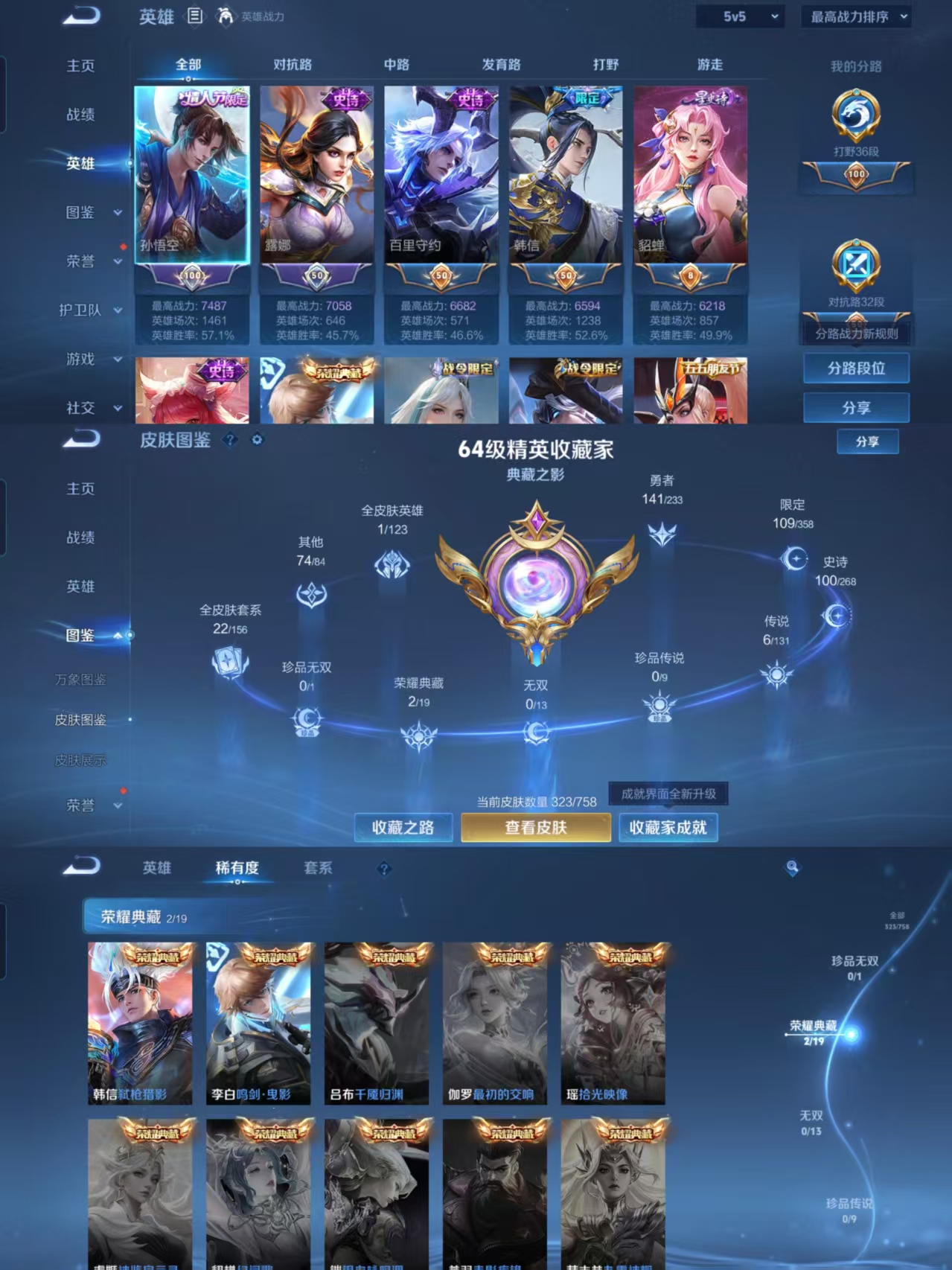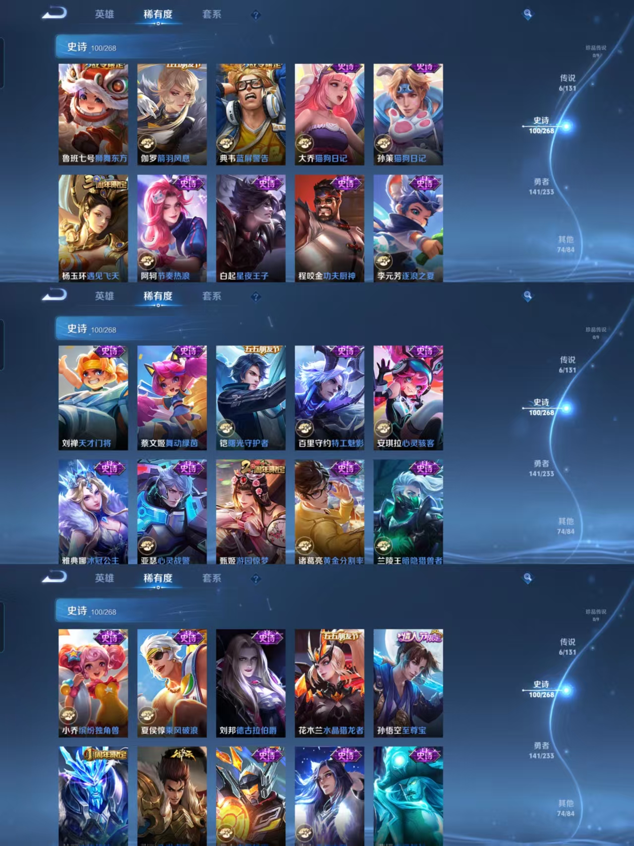 贵族等级:v7皮肤数:323传说品质6 情人节限定2 荣耀典藏2 生肖限定1 英雄数:126
