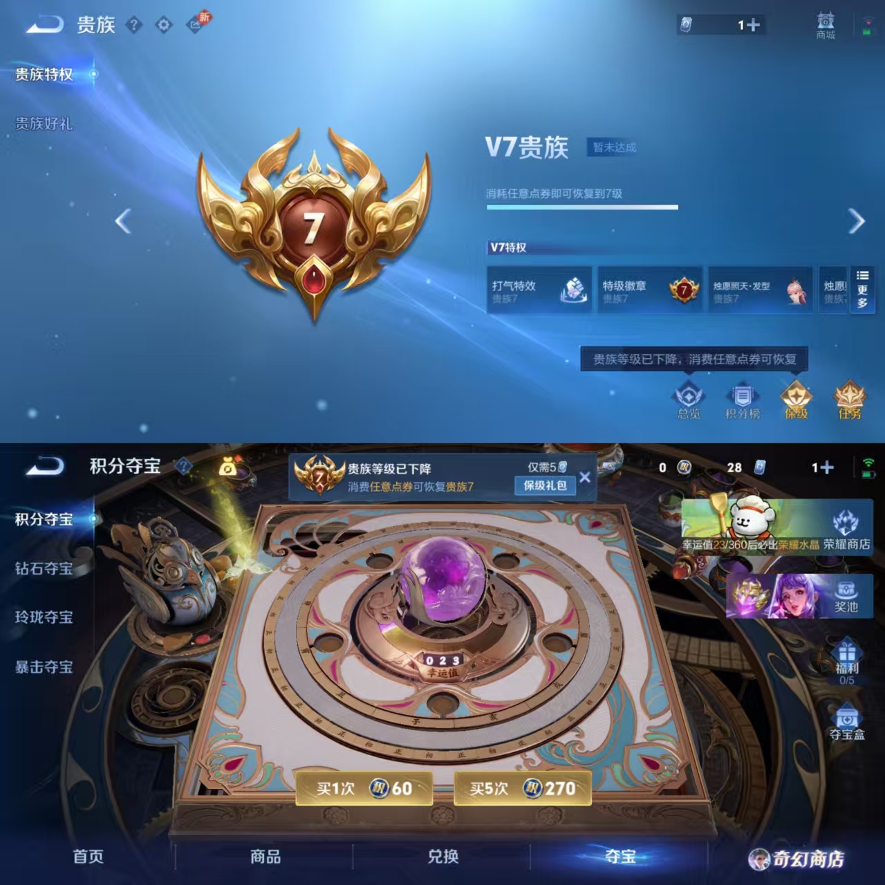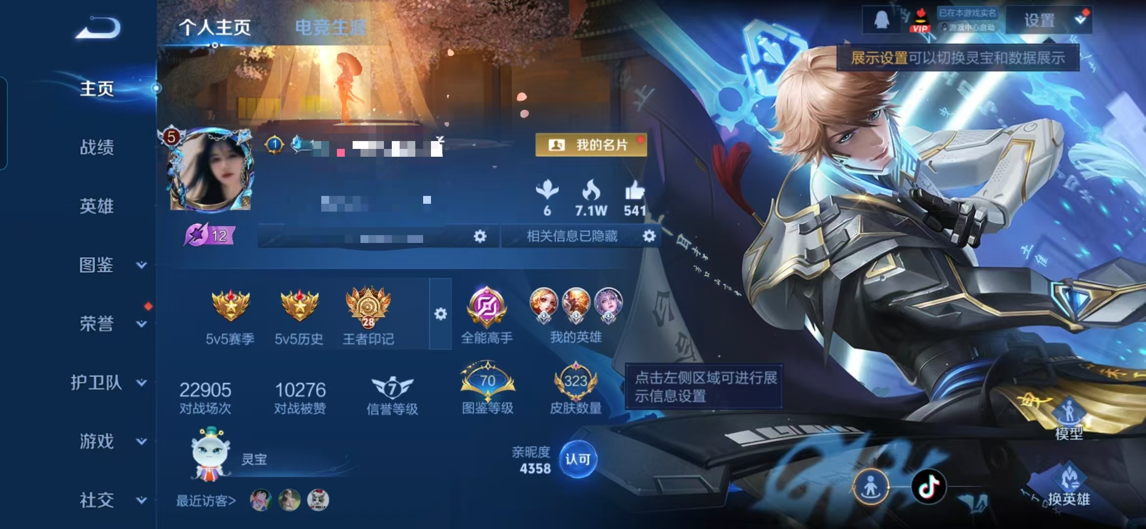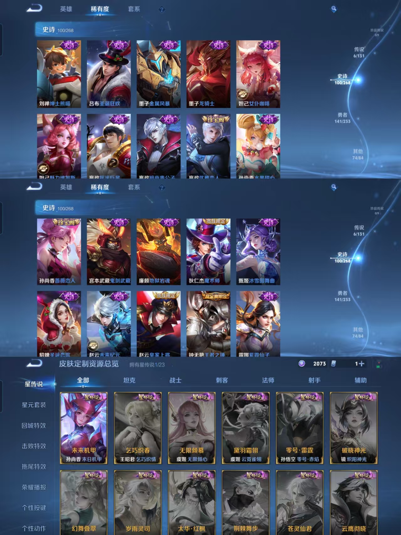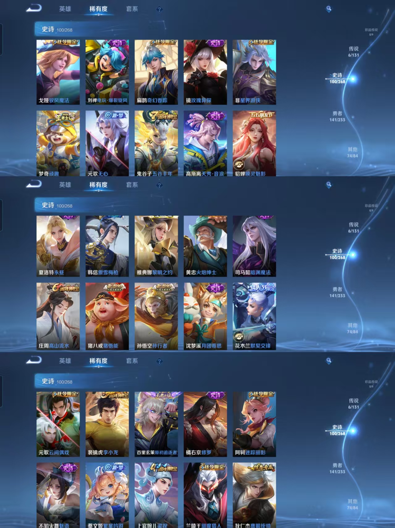贵族等级:v7皮肤数:323传说品质6 情人节限定2 荣耀典藏2 生肖限定1 英雄数:126