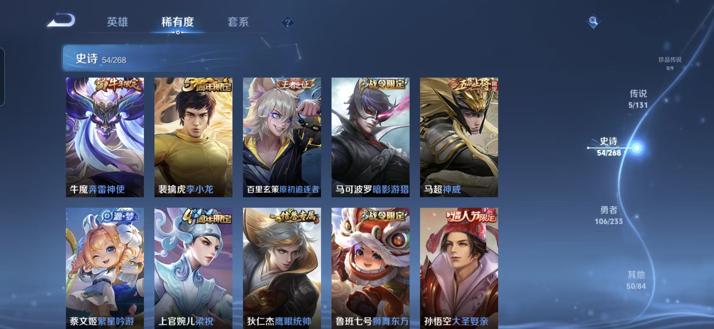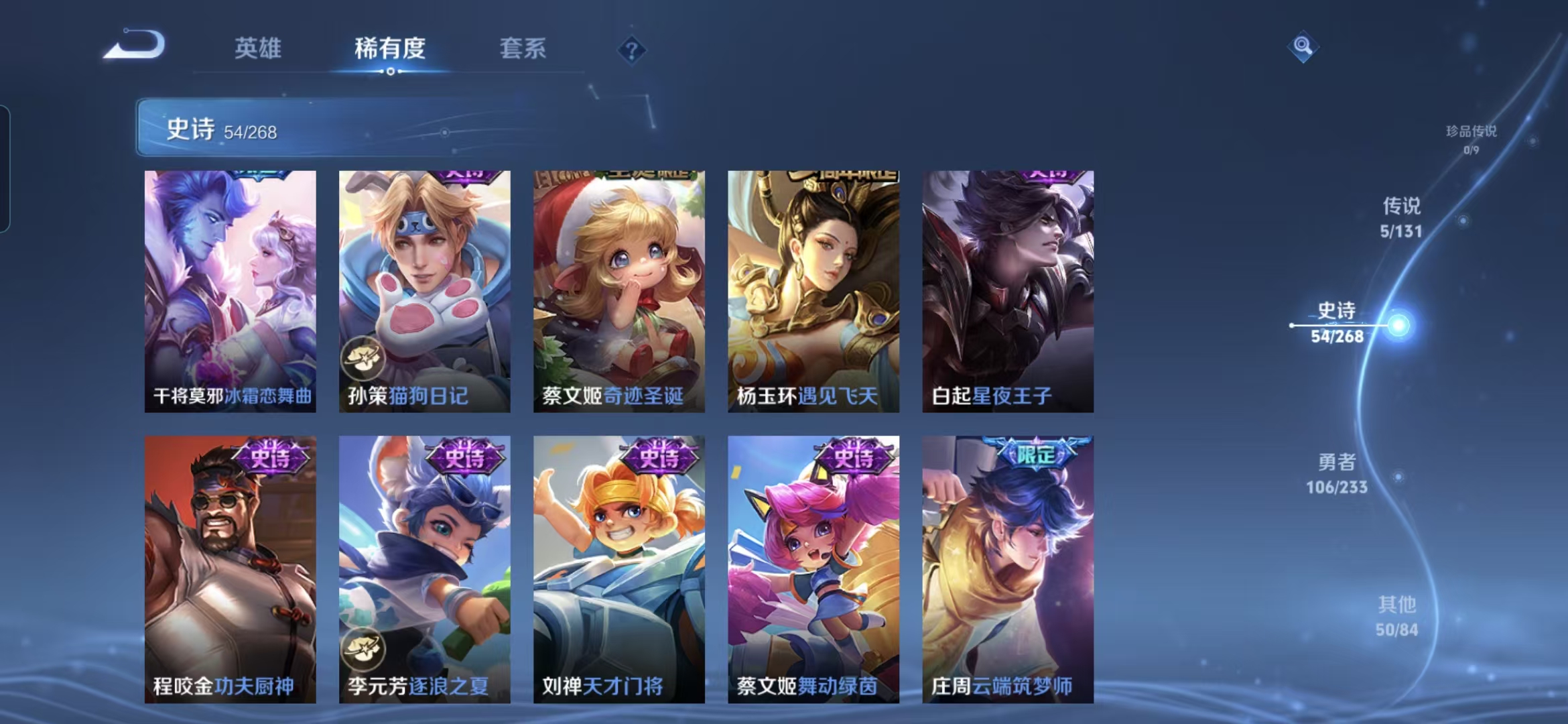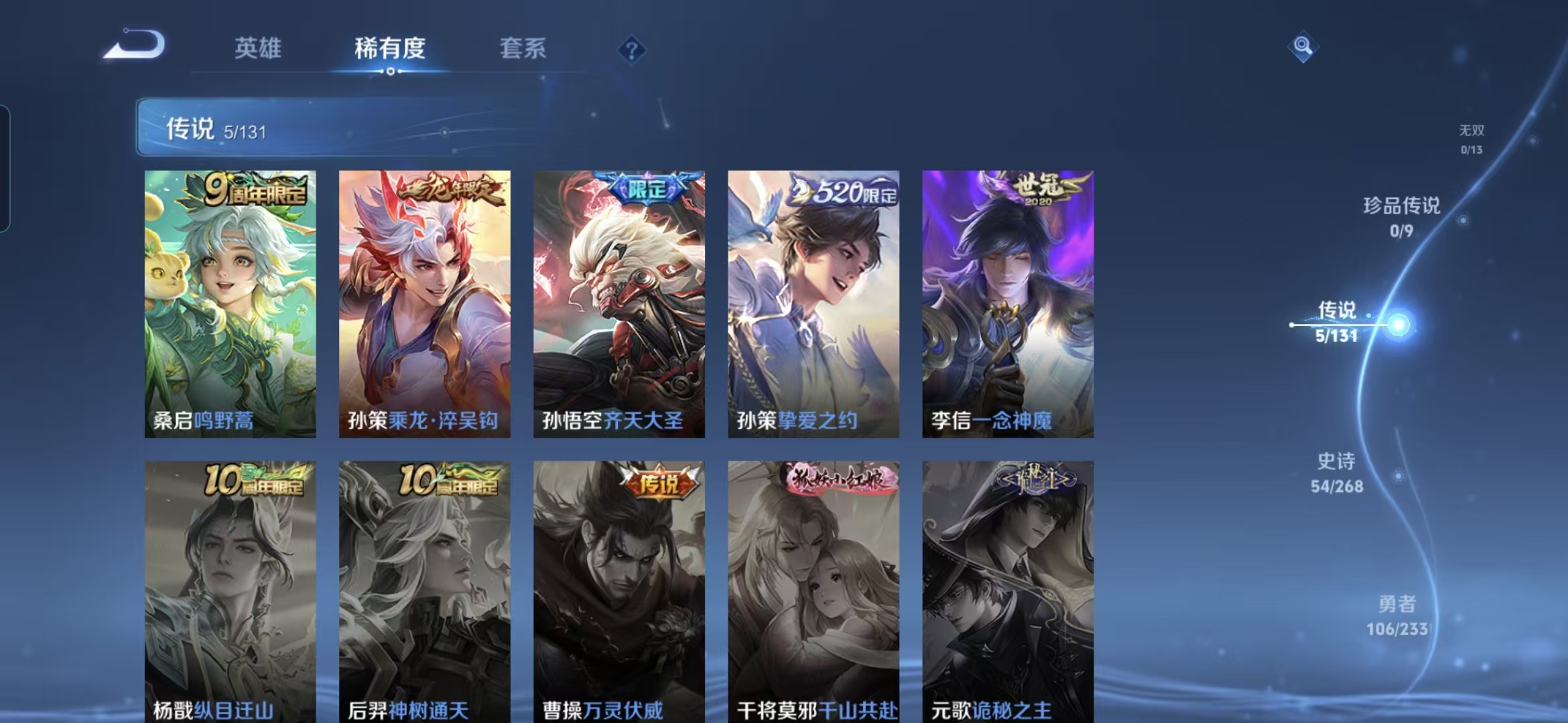 贵族等级:v7皮肤数:215情人节限定2 传说品质5 生肖限定2 英雄数:126