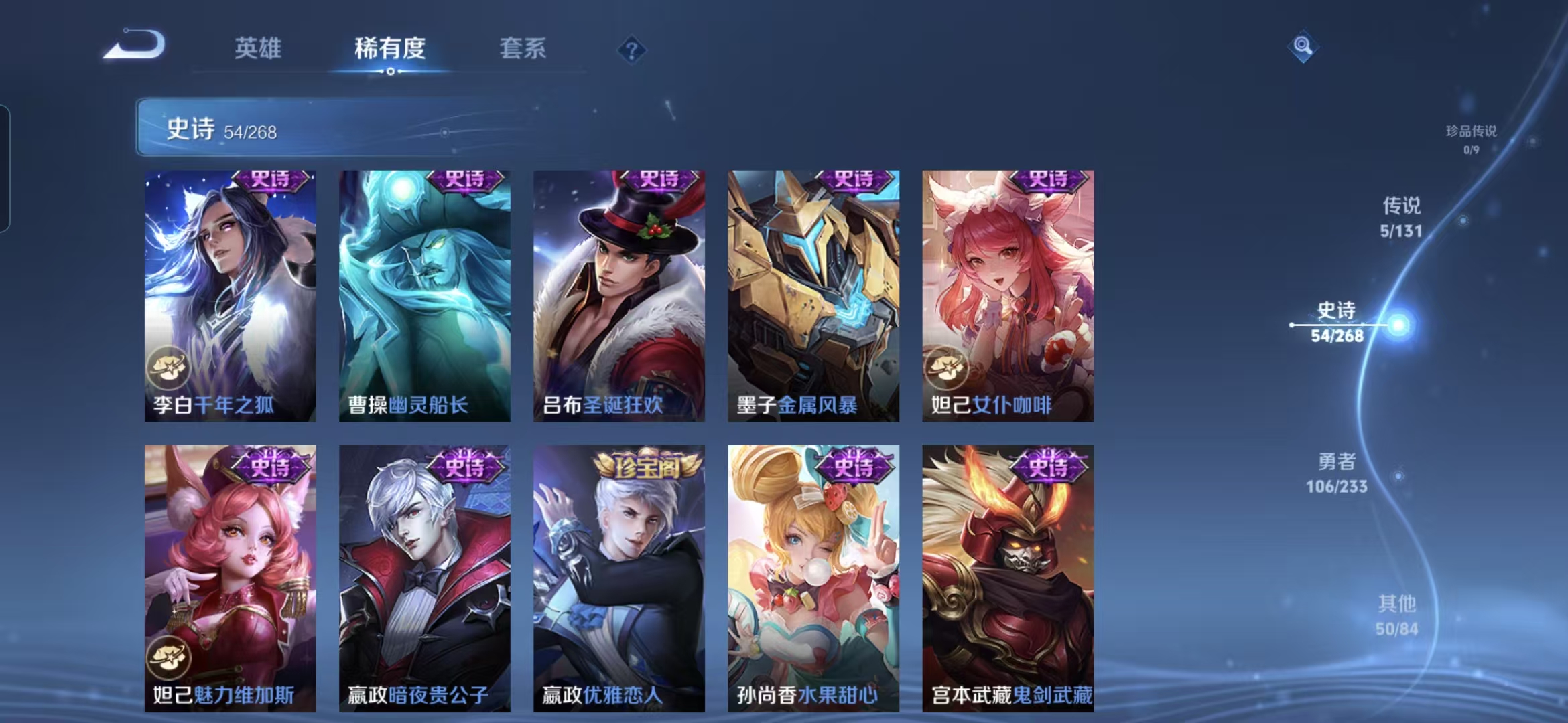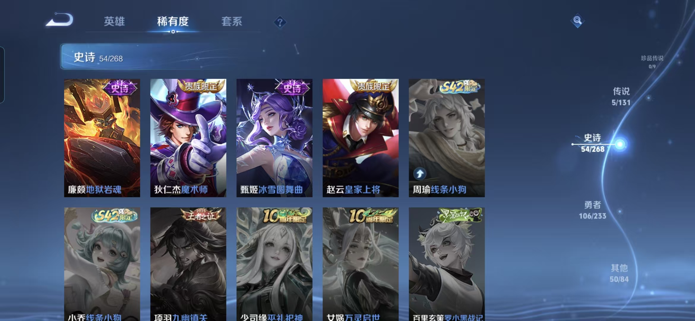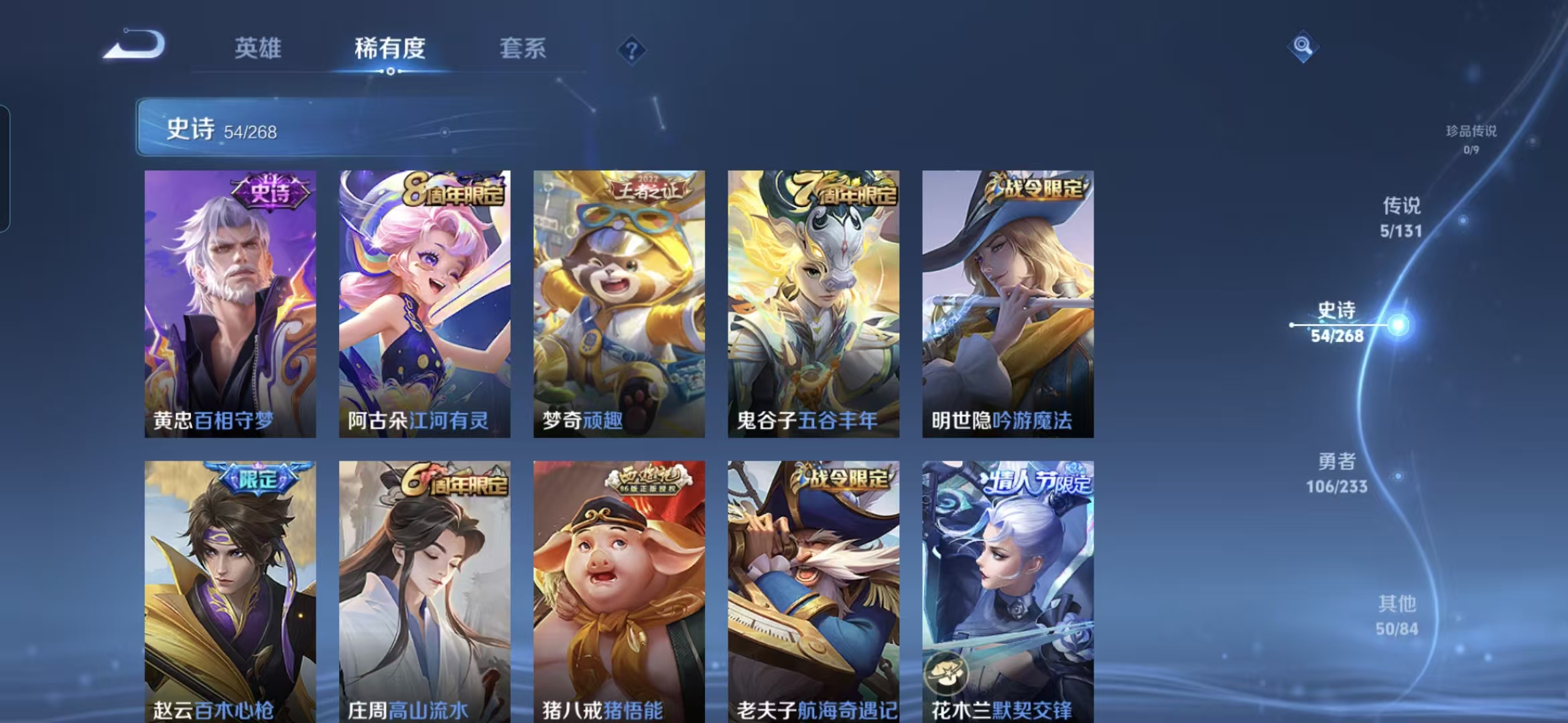 贵族等级:v7皮肤数:215情人节限定2 传说品质5 生肖限定2 英雄数:126