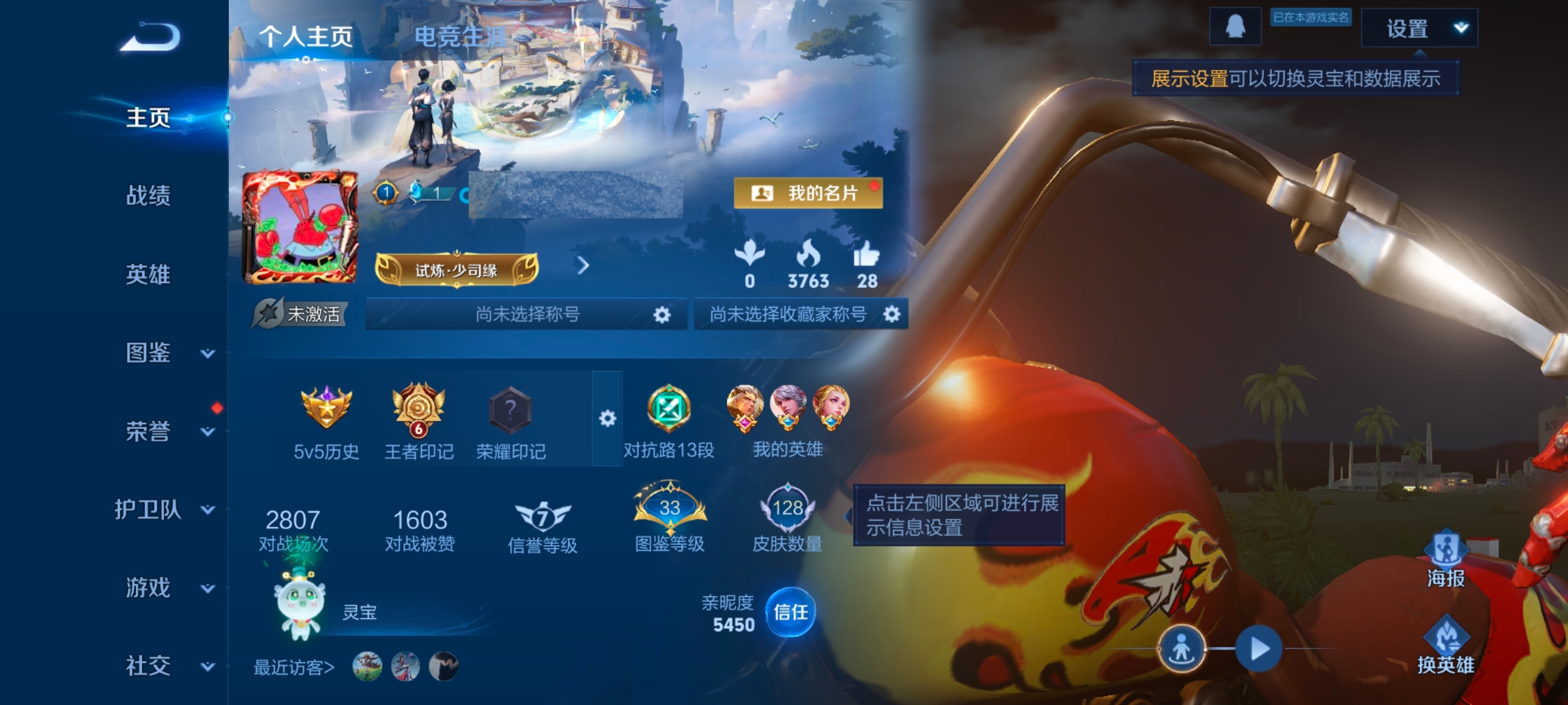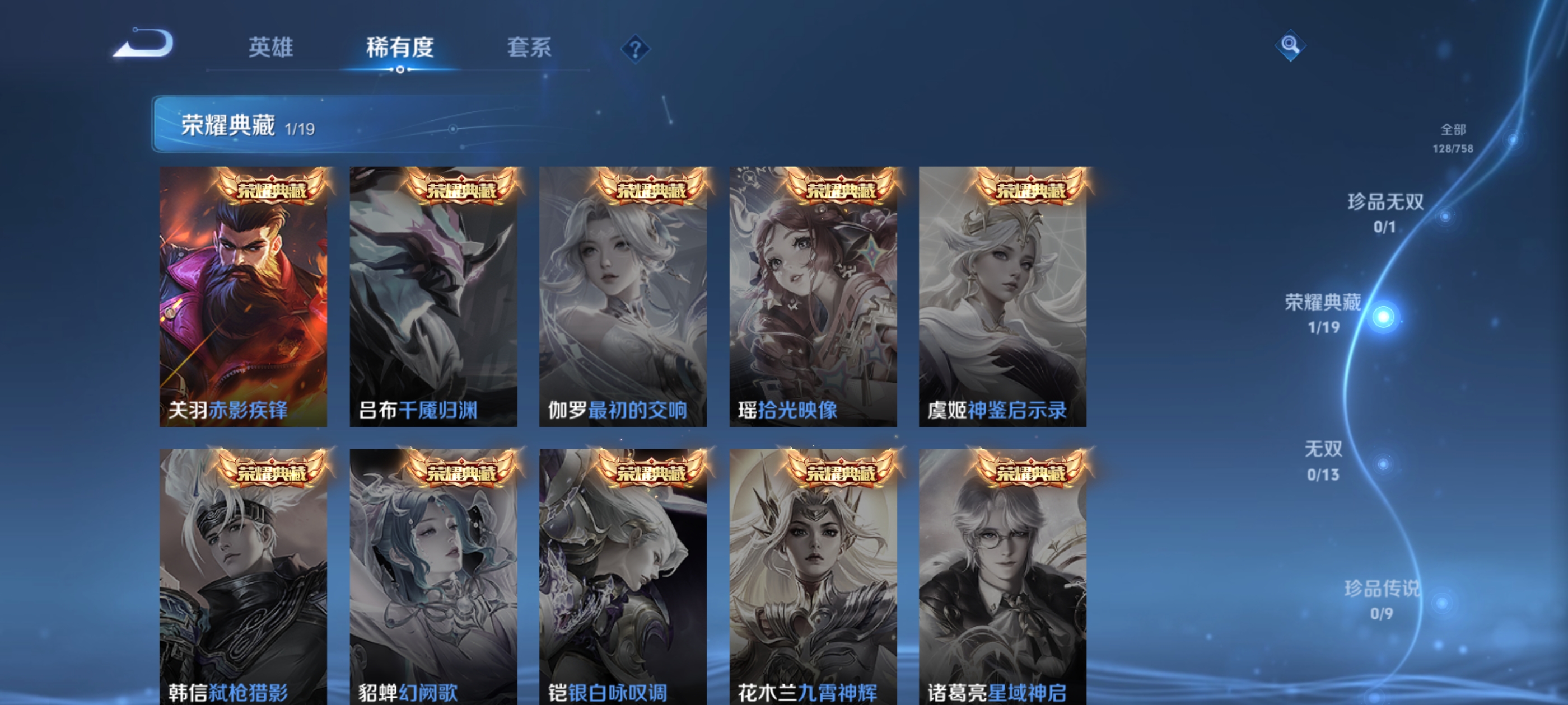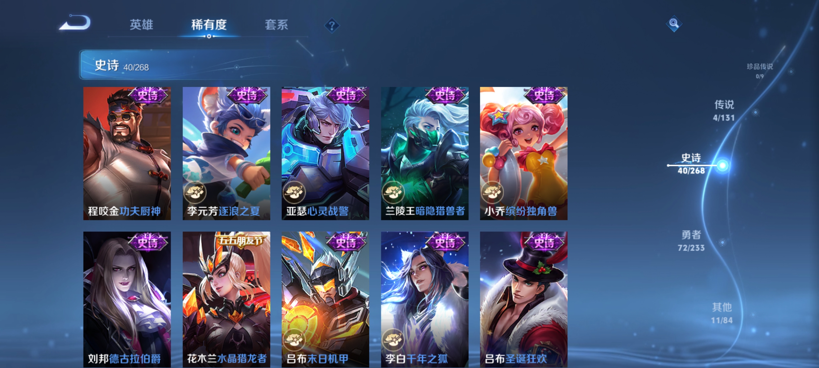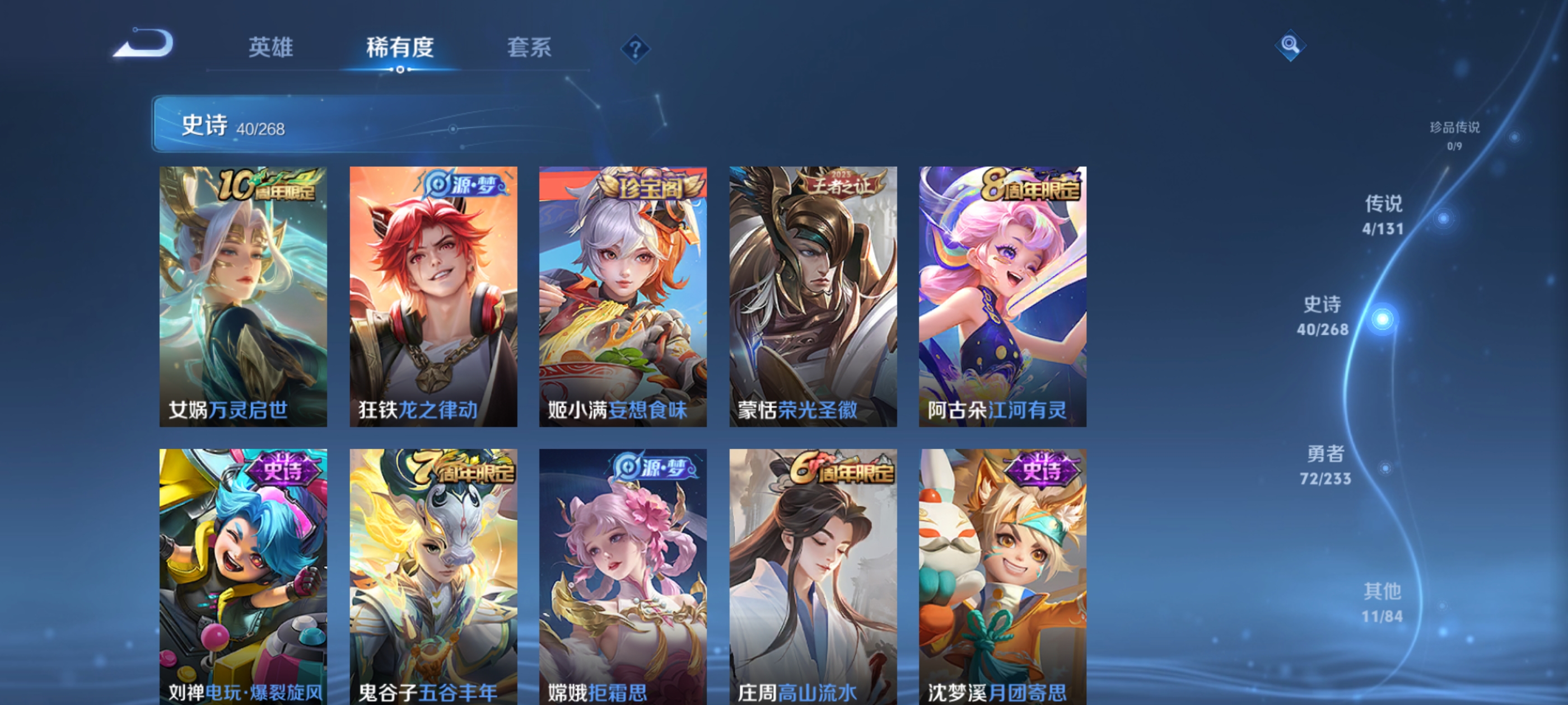 贵族等级:v4皮肤数:128传说品质4 荣耀典藏1 英雄数:117