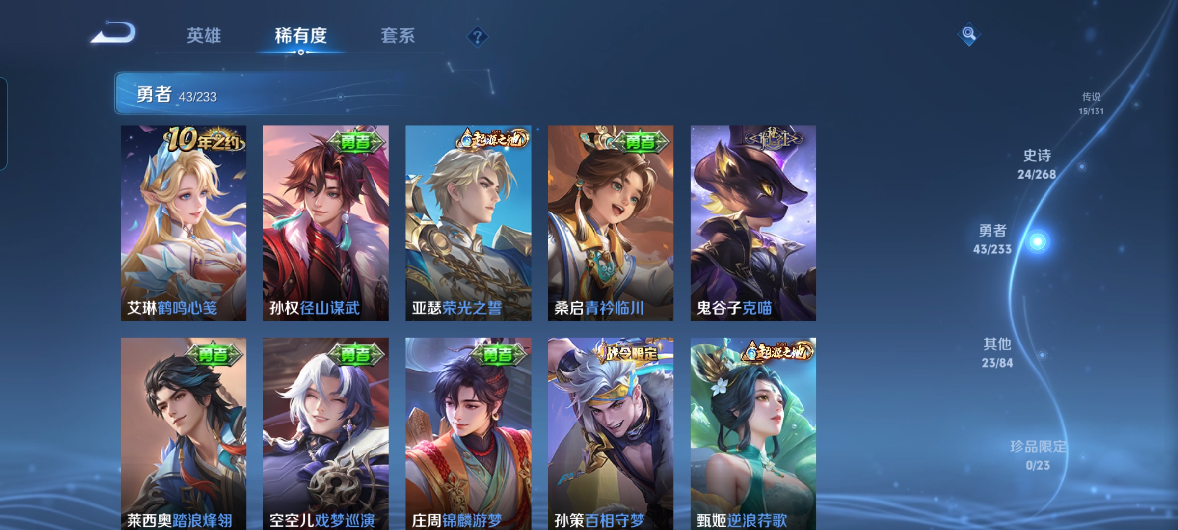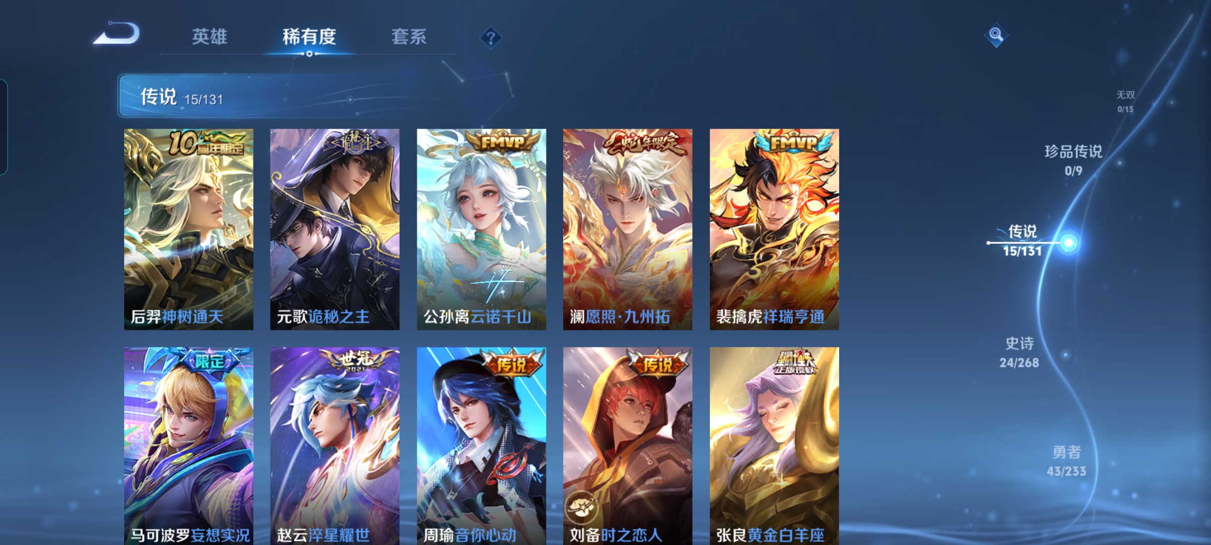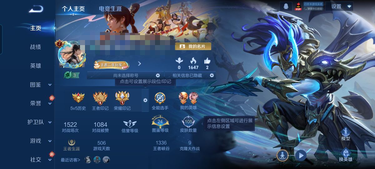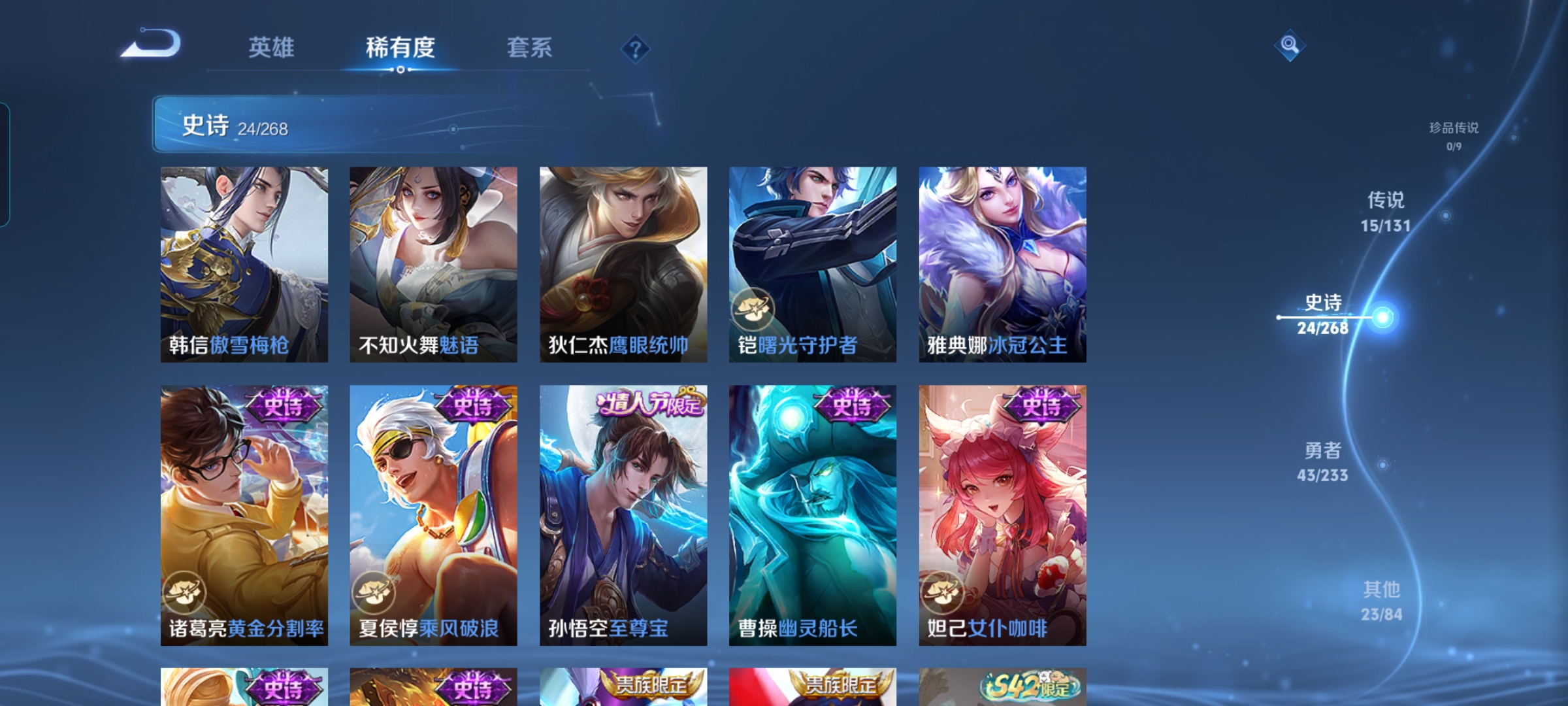 贵族等级:v7皮肤数:105传说品质15 生肖限定1 情人节限定1 英雄数:95
