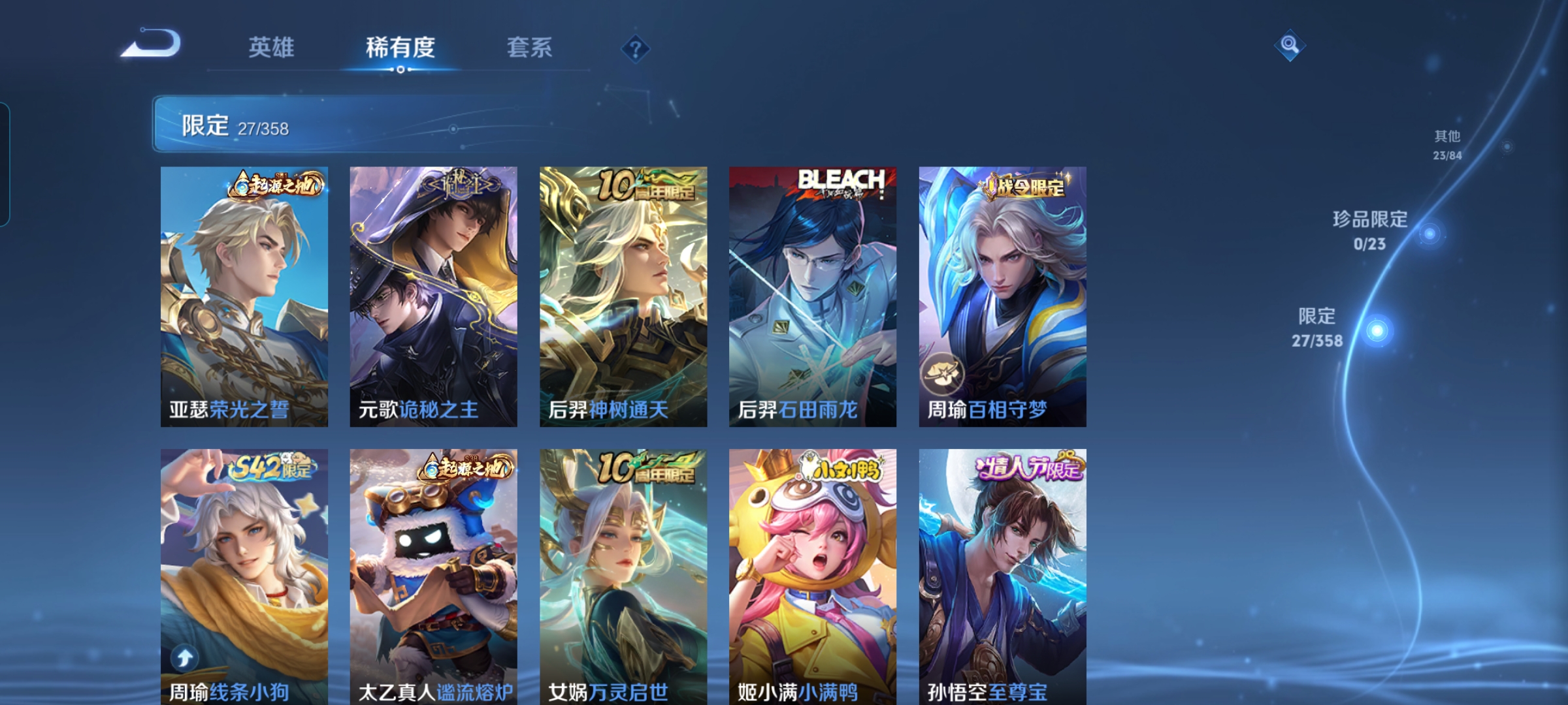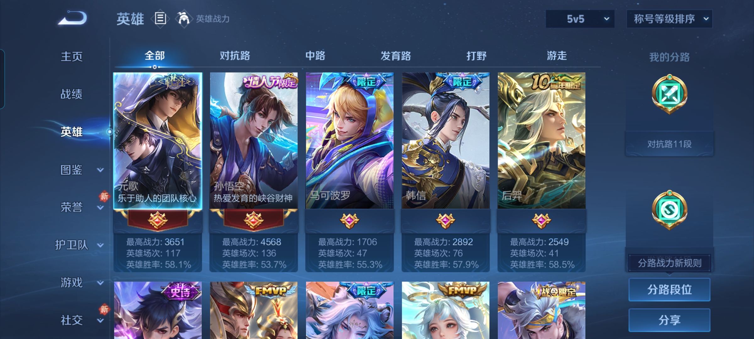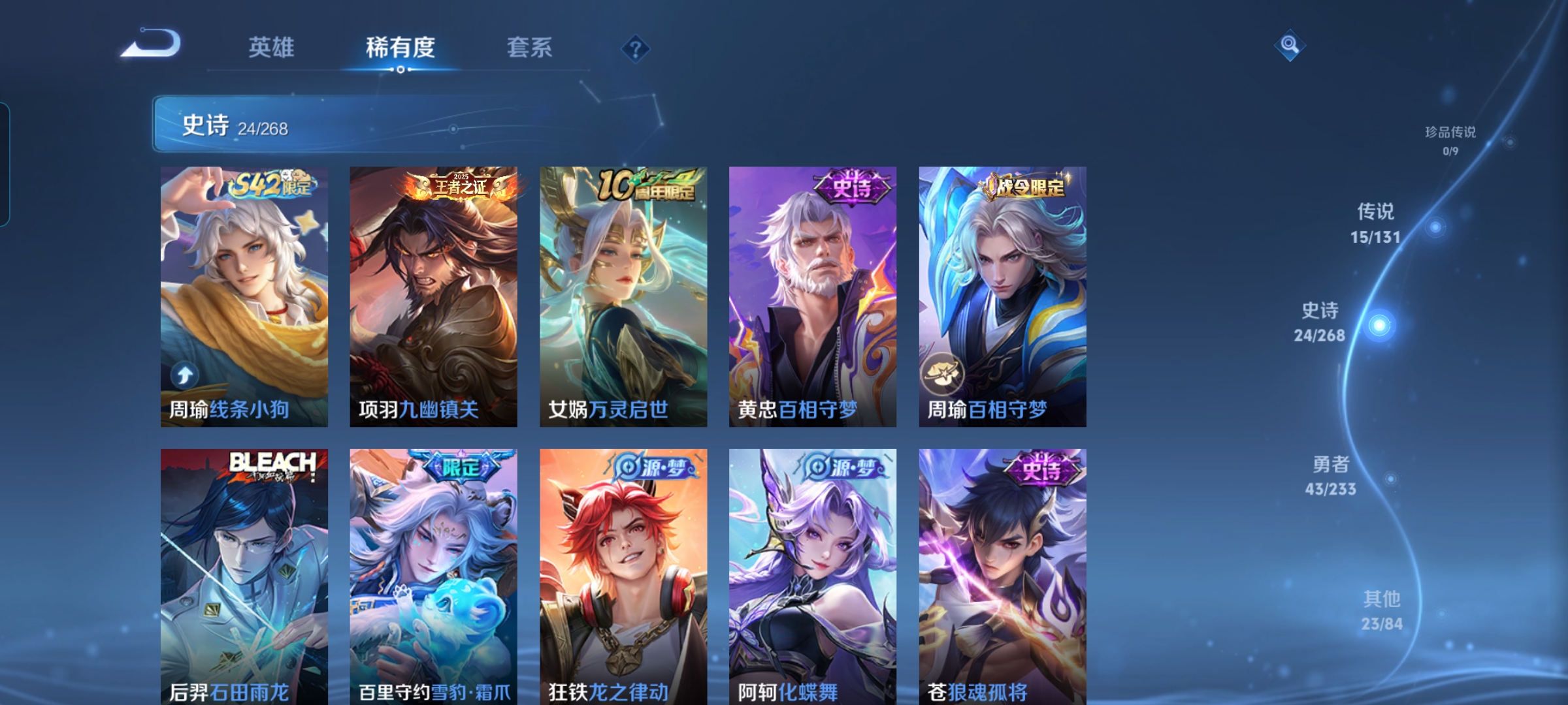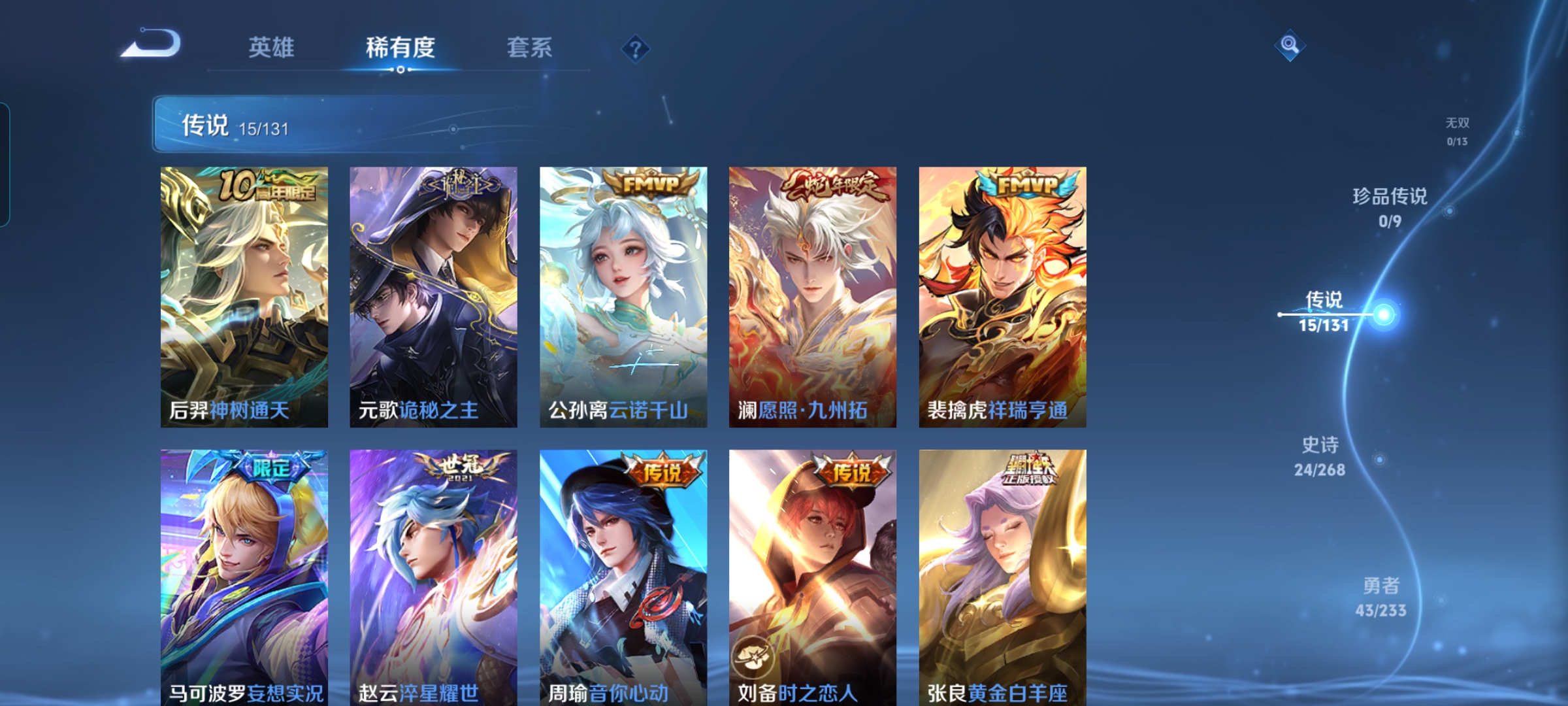 贵族等级:v7皮肤数:105传说品质15 生肖限定1 情人节限定1 英雄数:95