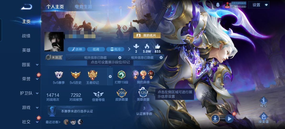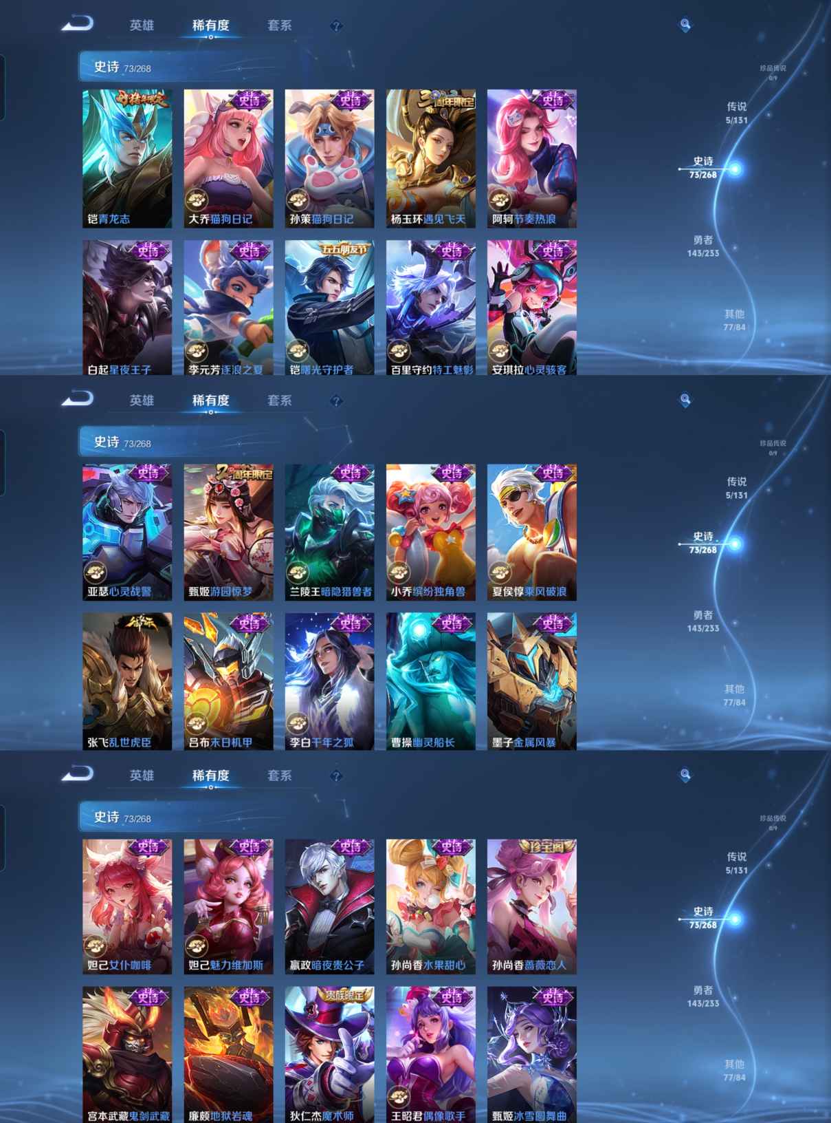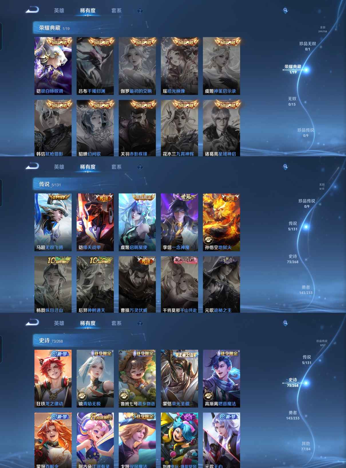 贵族等级:v8皮肤数:299情人节限定1 生肖限定2 传说品质5 荣耀典藏1 英雄数:125