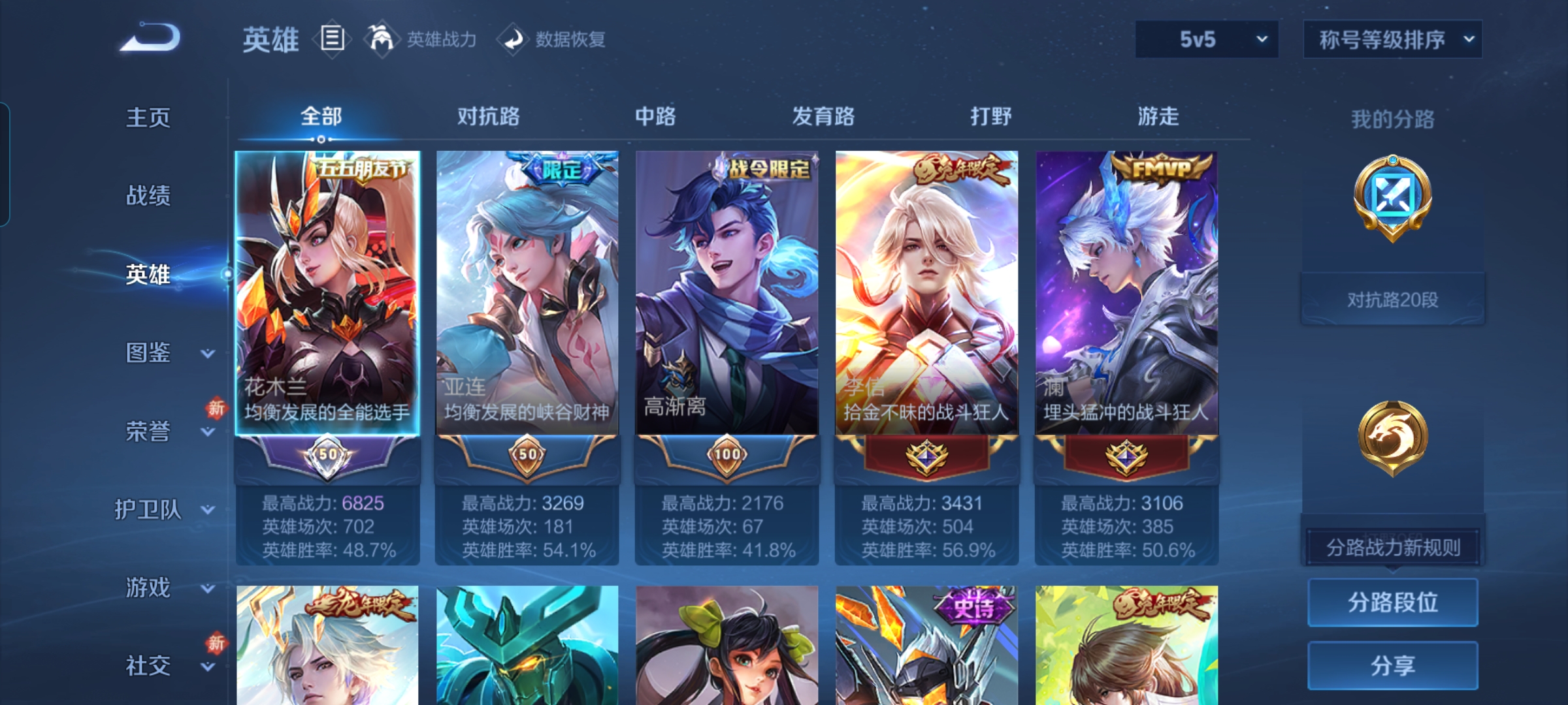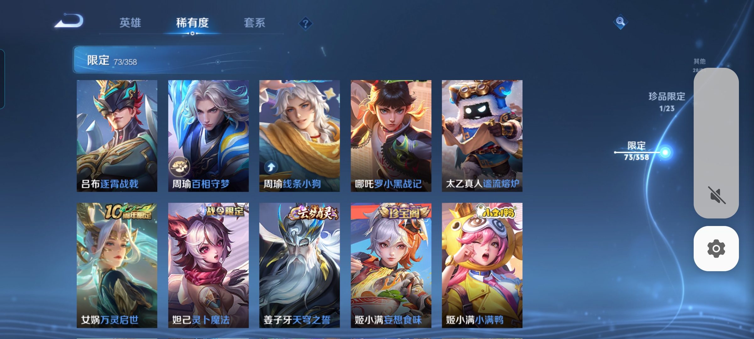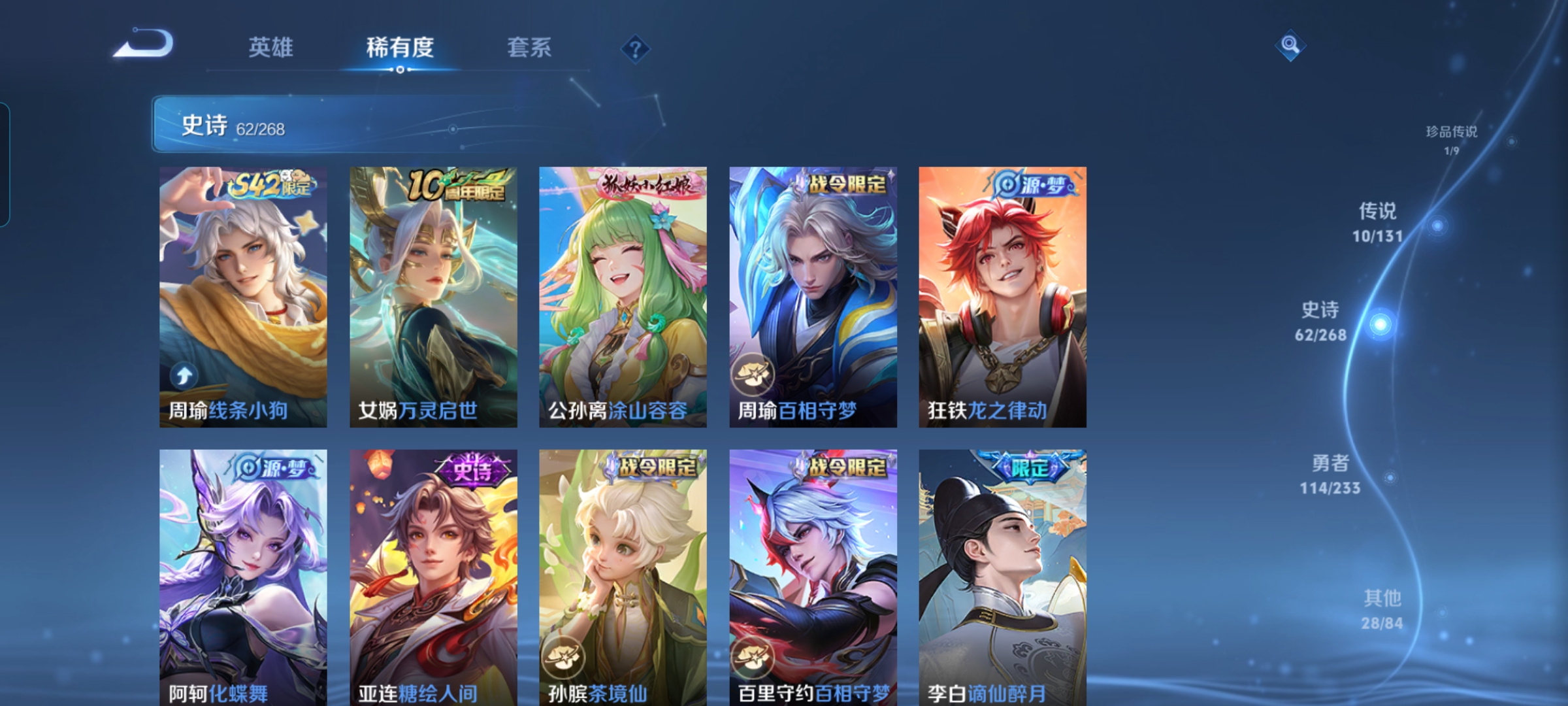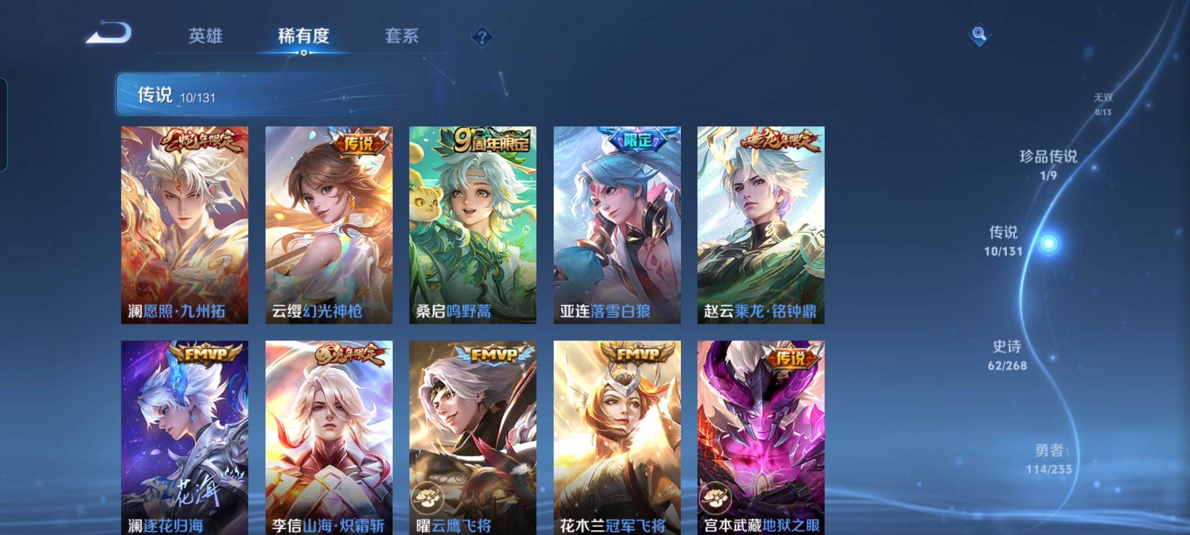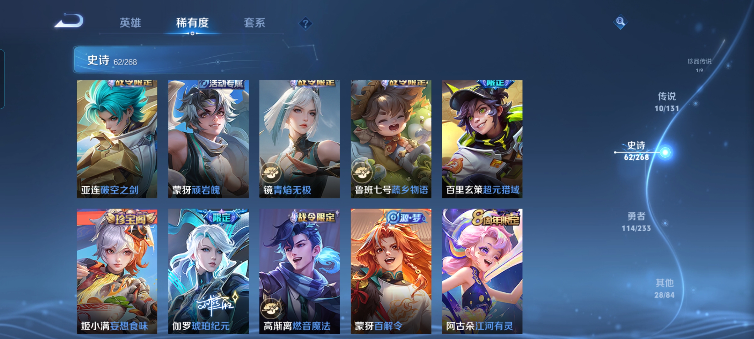 贵族等级:v7皮肤数:216传说品质10 生肖限定4 荣耀典藏1 珍品传说1 英雄数:127