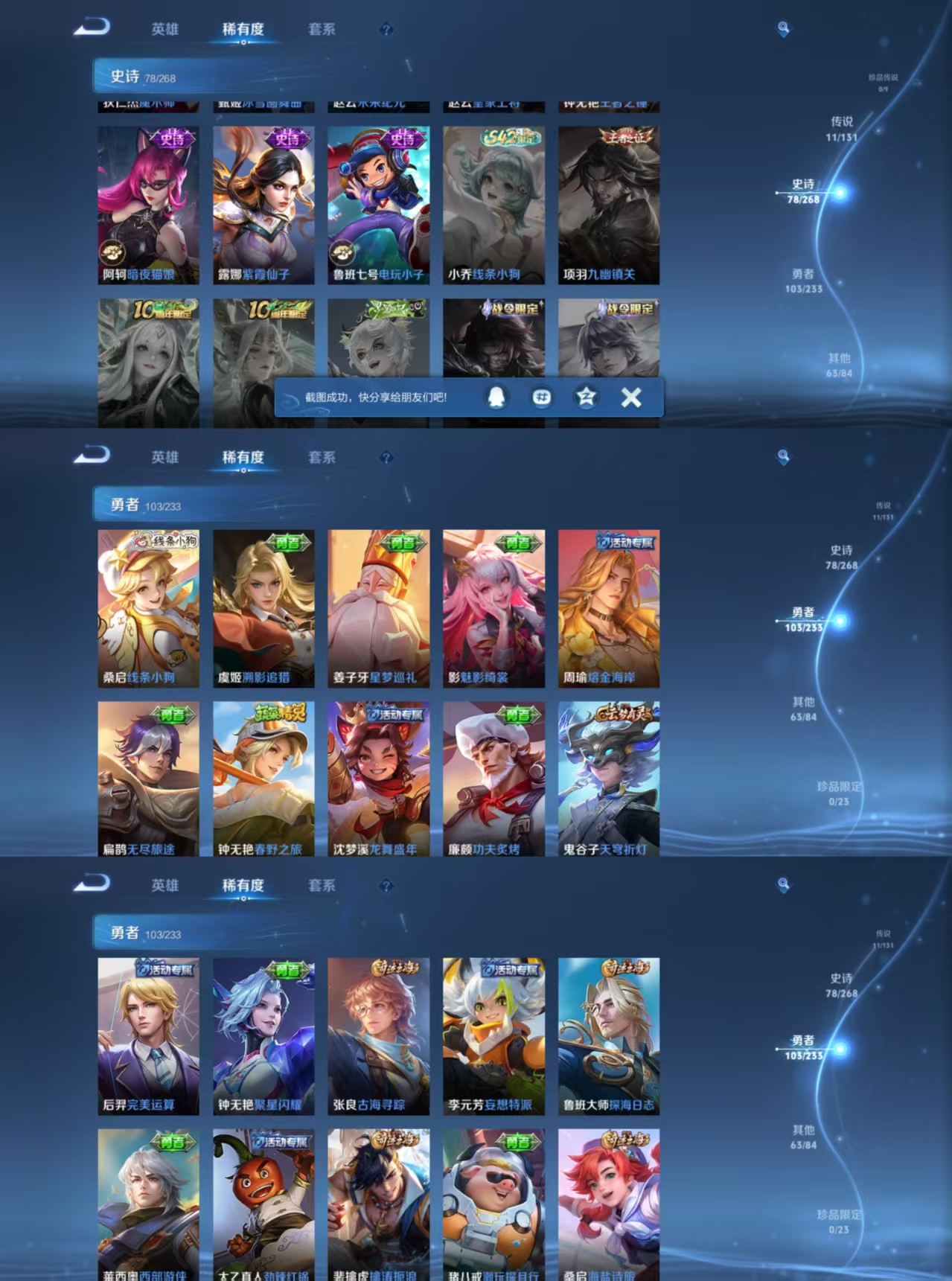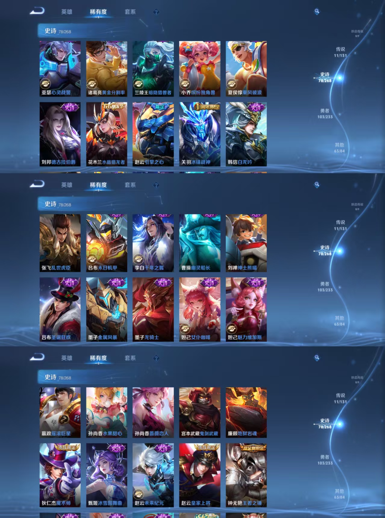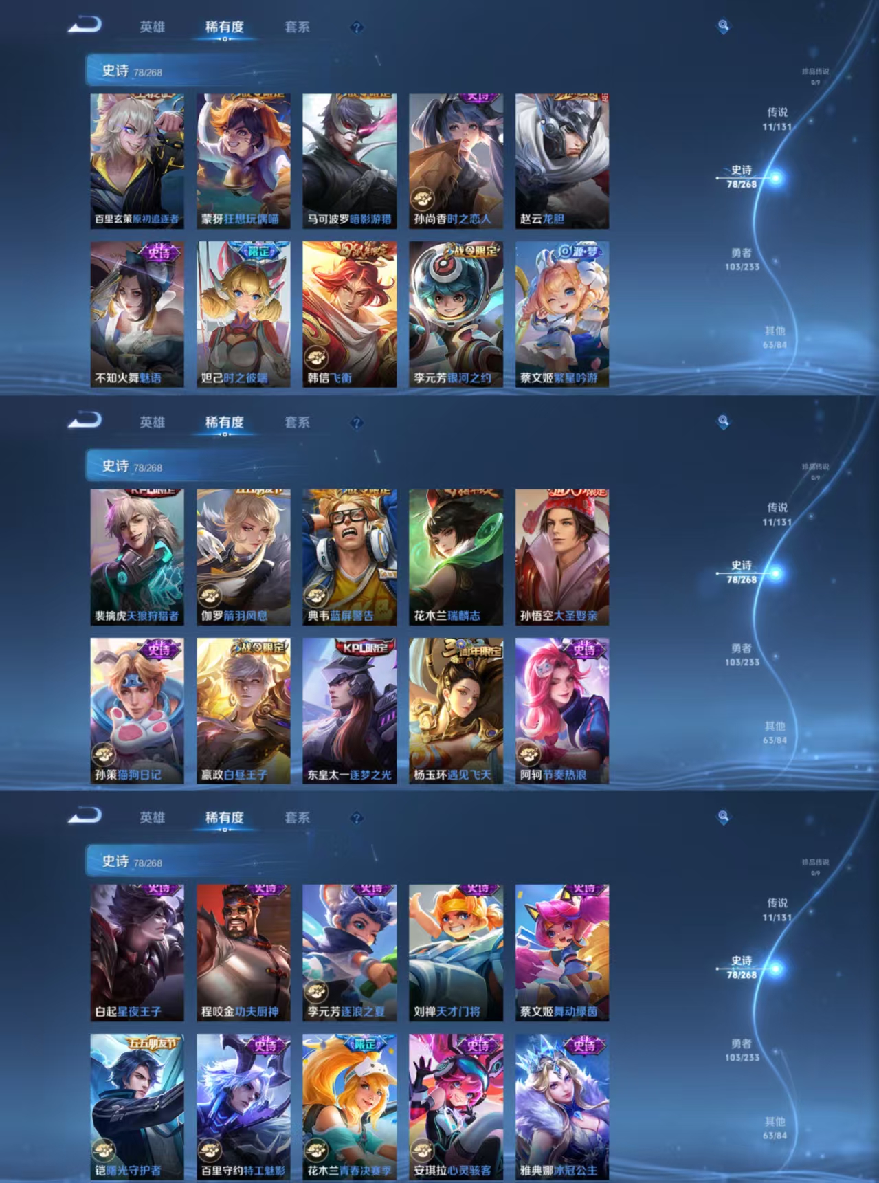 贵族等级:v8皮肤数:256传说品质11 情人节限定1 荣耀典藏1 生肖限定2 英雄数:128