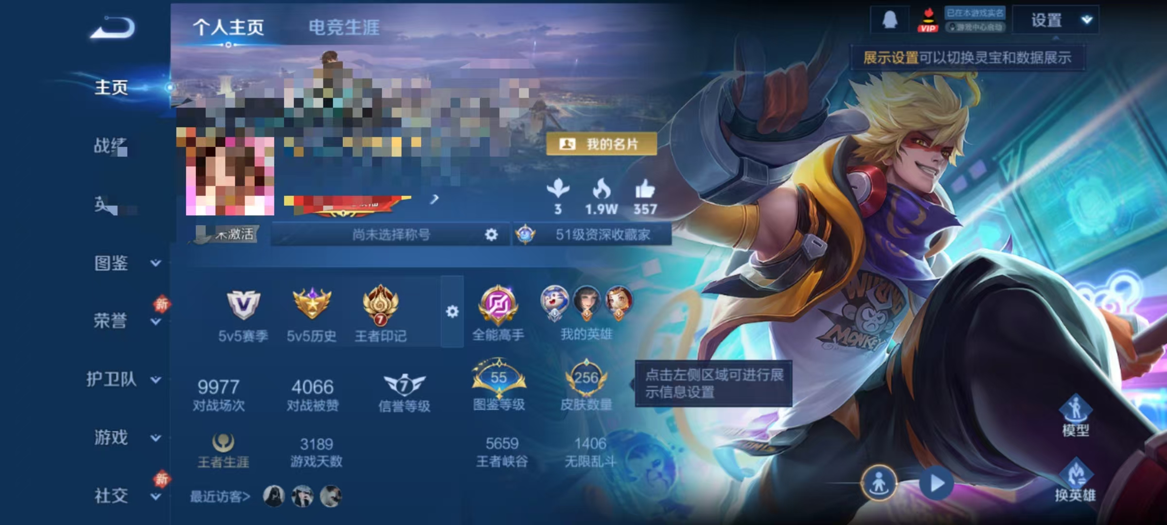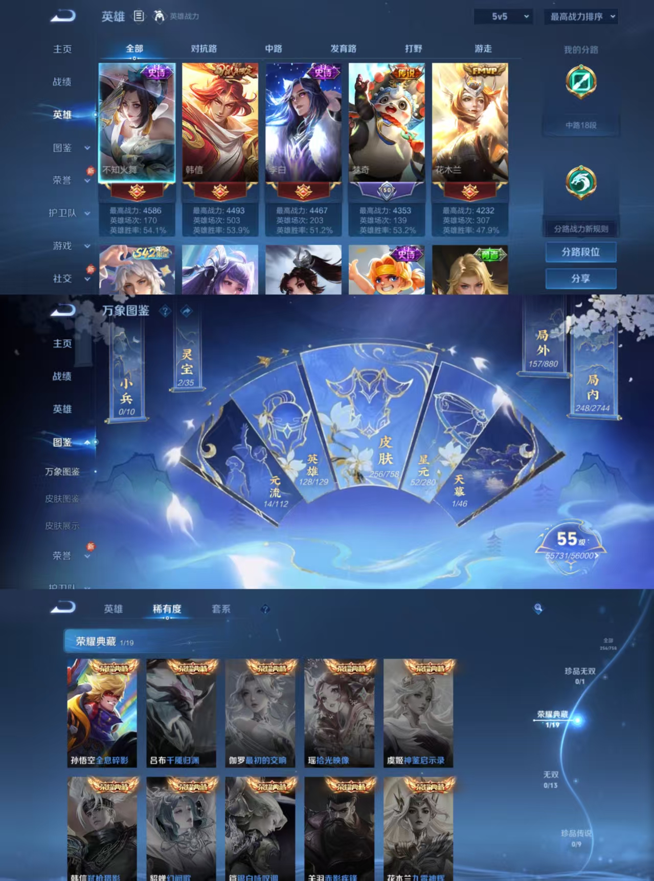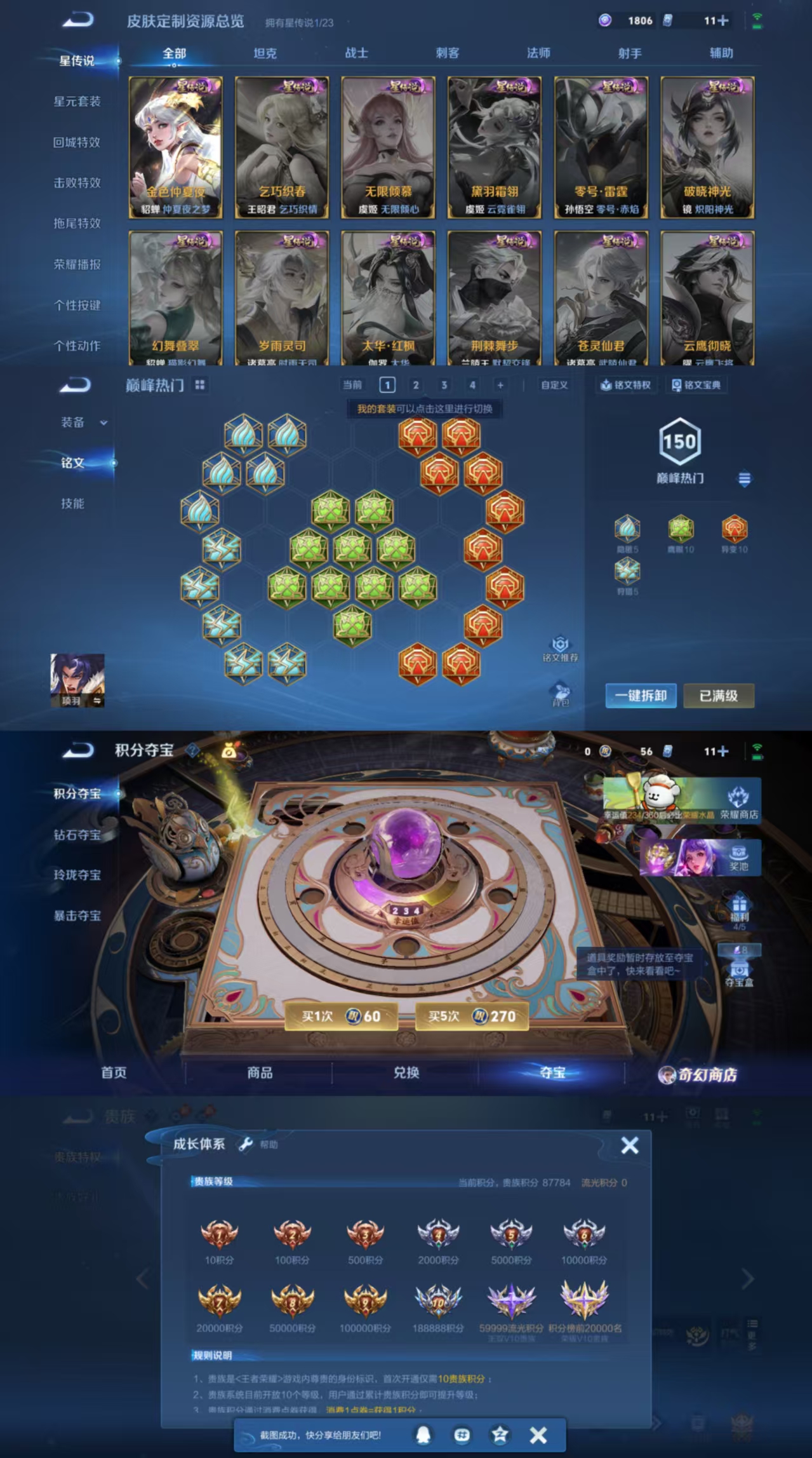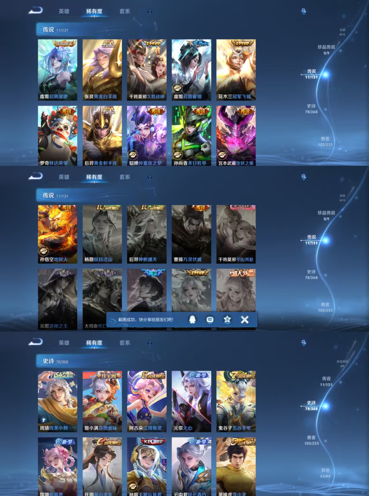 贵族等级:v8皮肤数:256传说品质11 情人节限定1 荣耀典藏1 生肖限定2 英雄数:128
